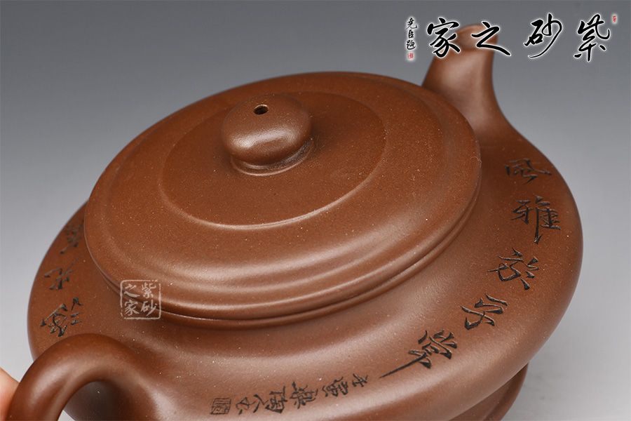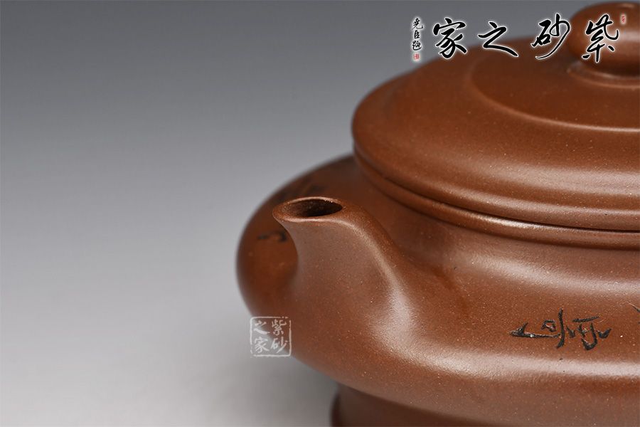 虛扁是一款經(jīng)典器型,是紫砂傳統(tǒng)全手工成型中最難得的器型,行話“造型扁一分,成型難一分”。此壺老師在原有的基礎(chǔ)上進行再創(chuàng)作,壺底較高,線條簡練,虛實和諧,提攜舒適,整體雄渾肅穆,做工精細,無不體現(xiàn)老師技藝精湛!此壺集實用和美觀于一體,值得細細把玩!