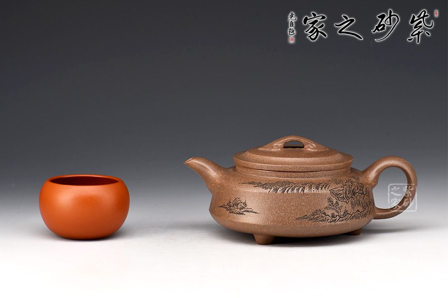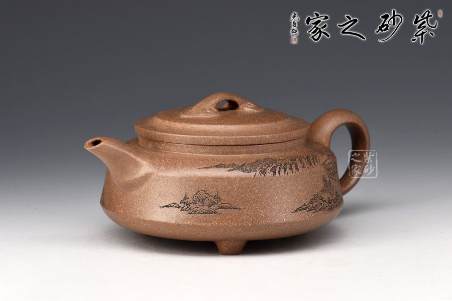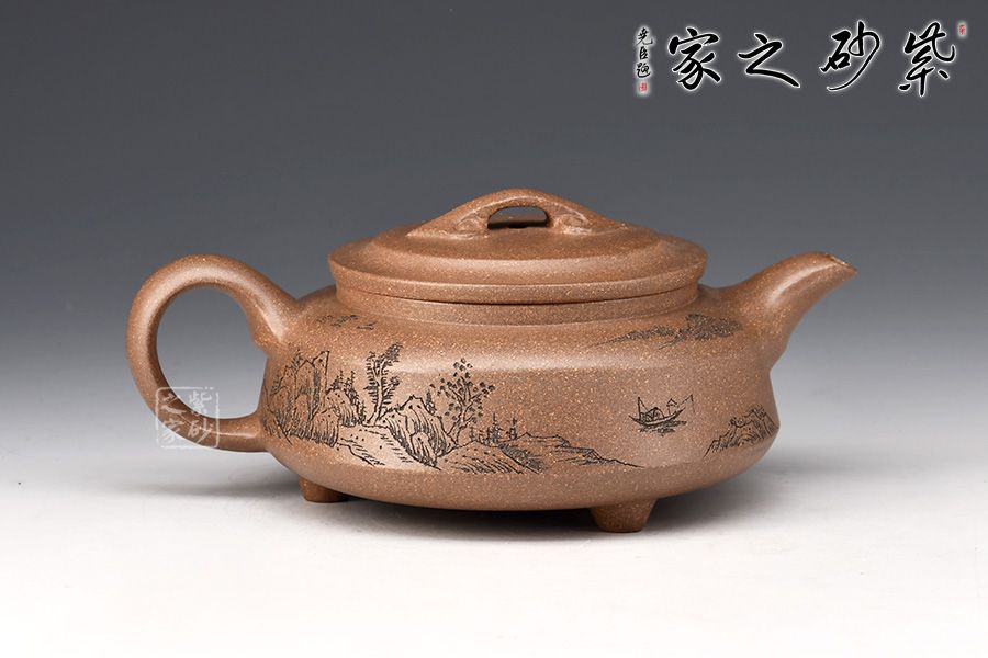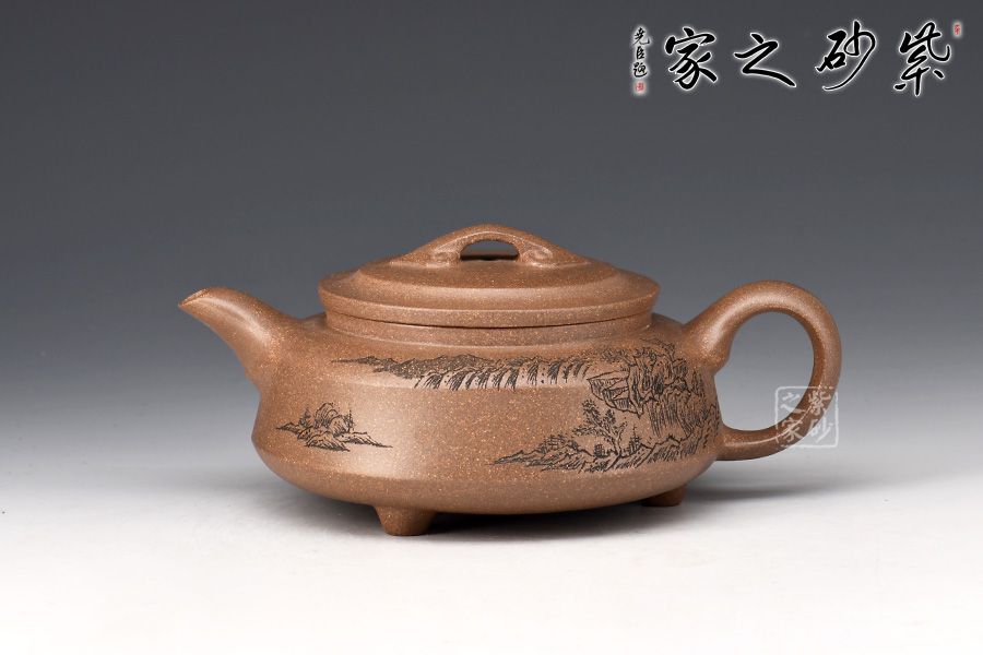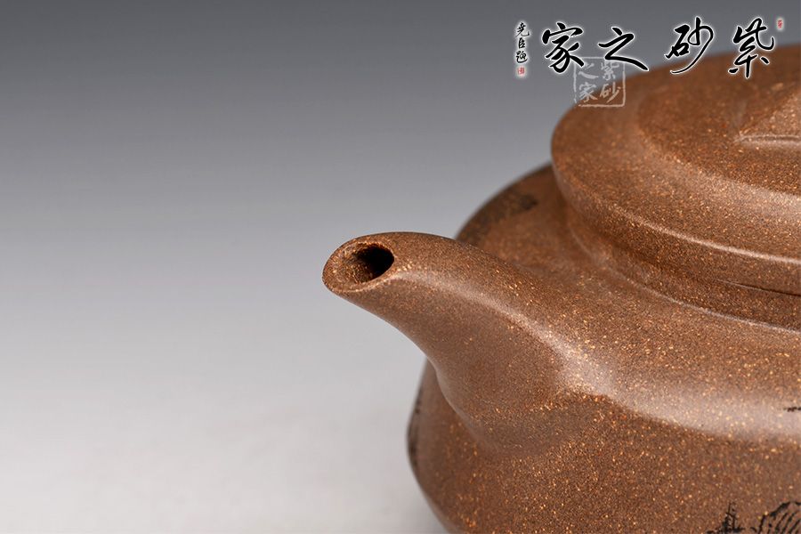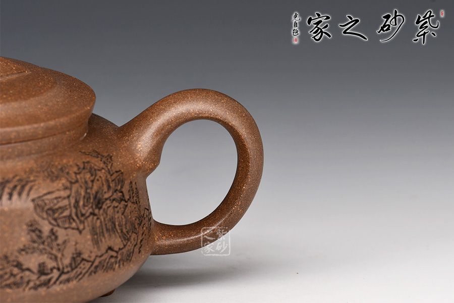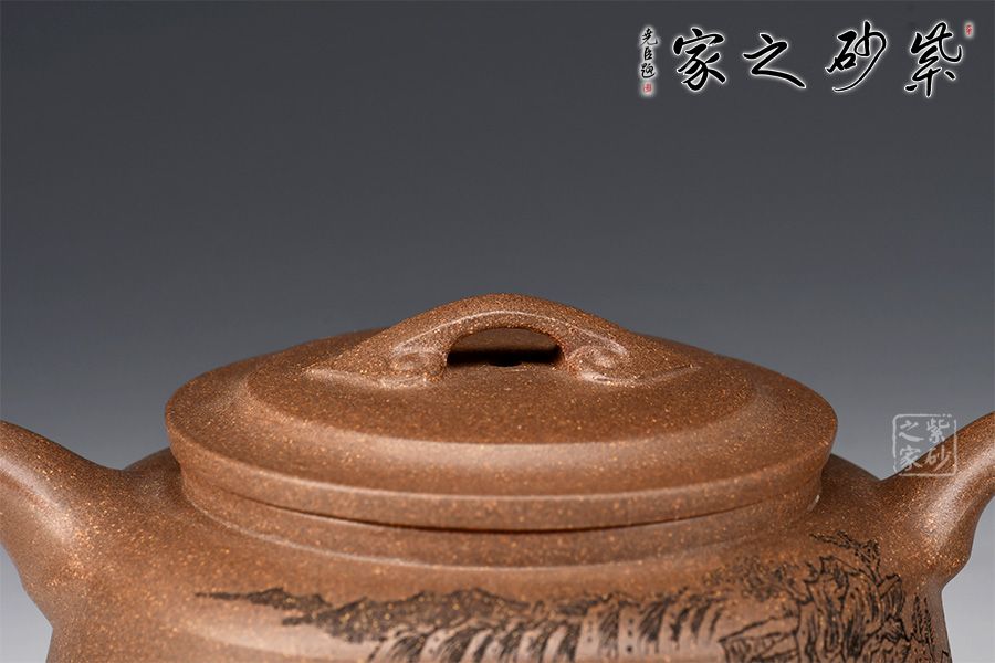 此壺整體屬圓壺,制作審慎,工精藝謹。壺身較扁,轉折線,腰線清晰,壓蓋橋鈕,飾以如意紋,溫潤細膩,壺身刻繪山巒層疊,意境幽遠。