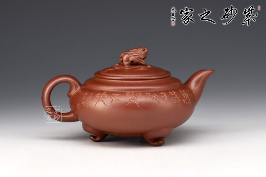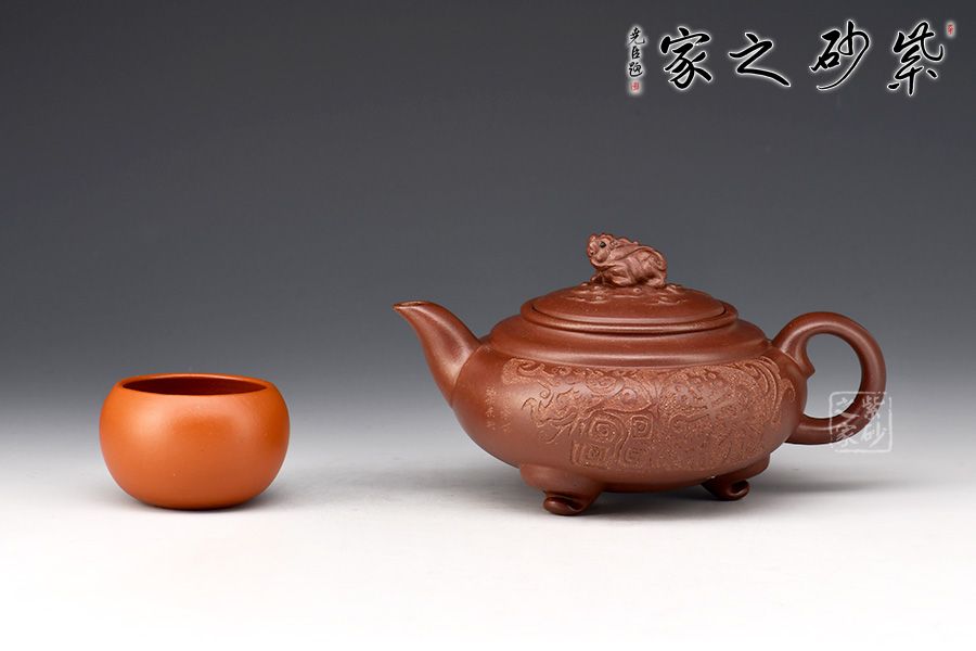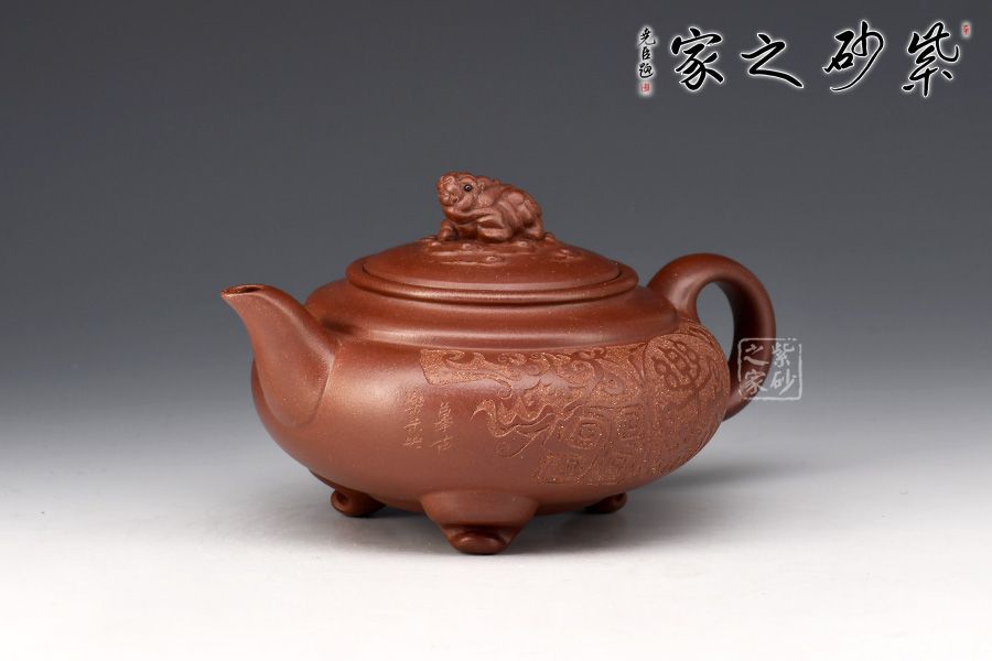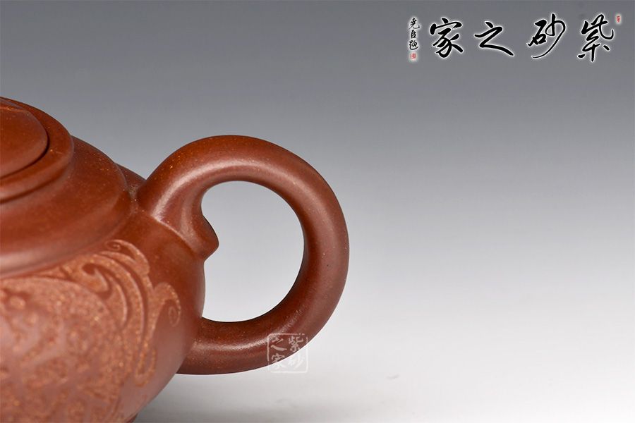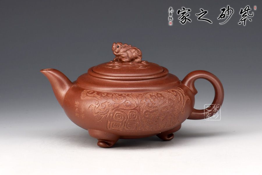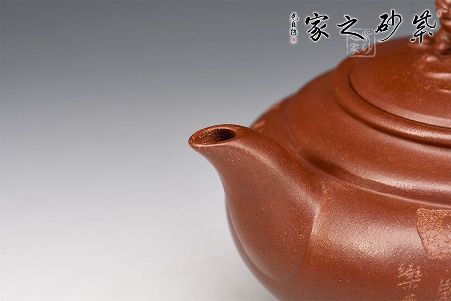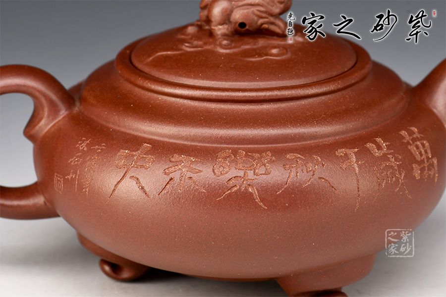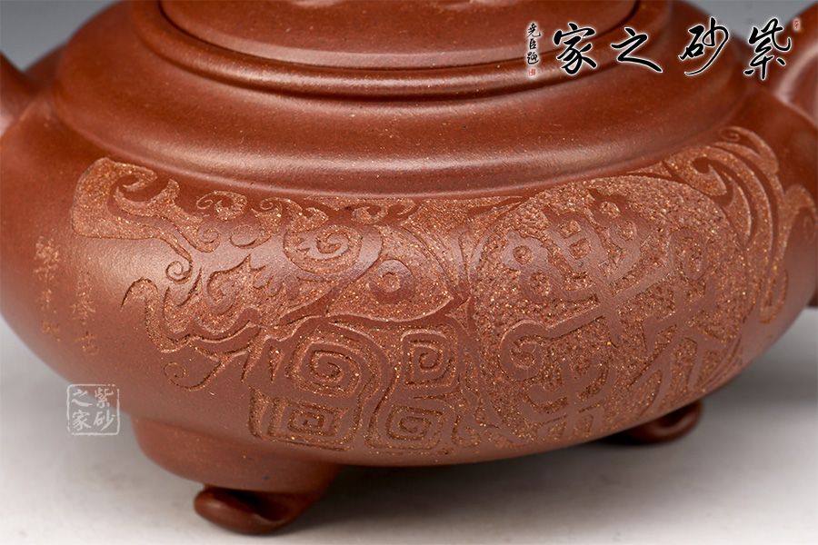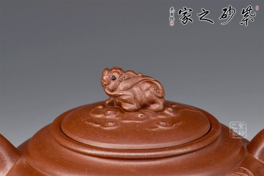 在中國(guó)傳統(tǒng)文化中,瑞獸、花鳥(niǎo)、動(dòng)物等寓意著吉祥如意,此壺名為“吉慶祥瑞”,的子雕塑瑞獸為鈕,壺身刻彰顯龍騰盛世的霸氣之風(fēng)。