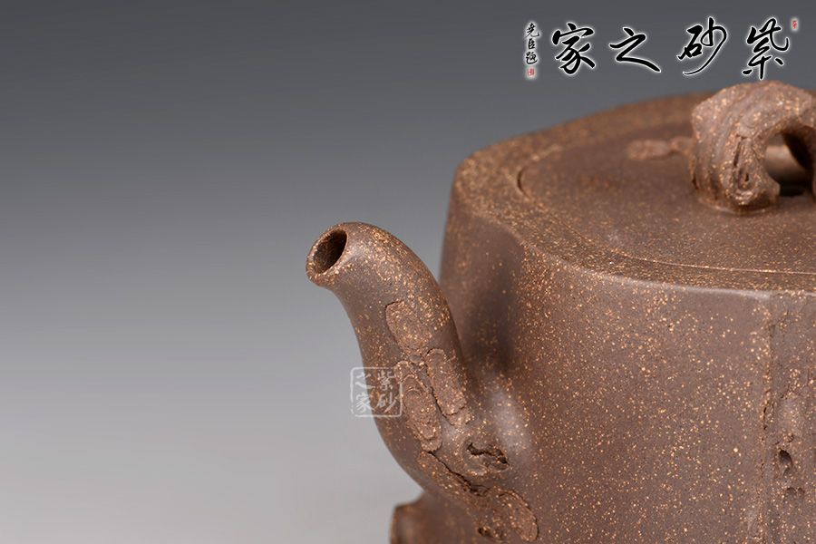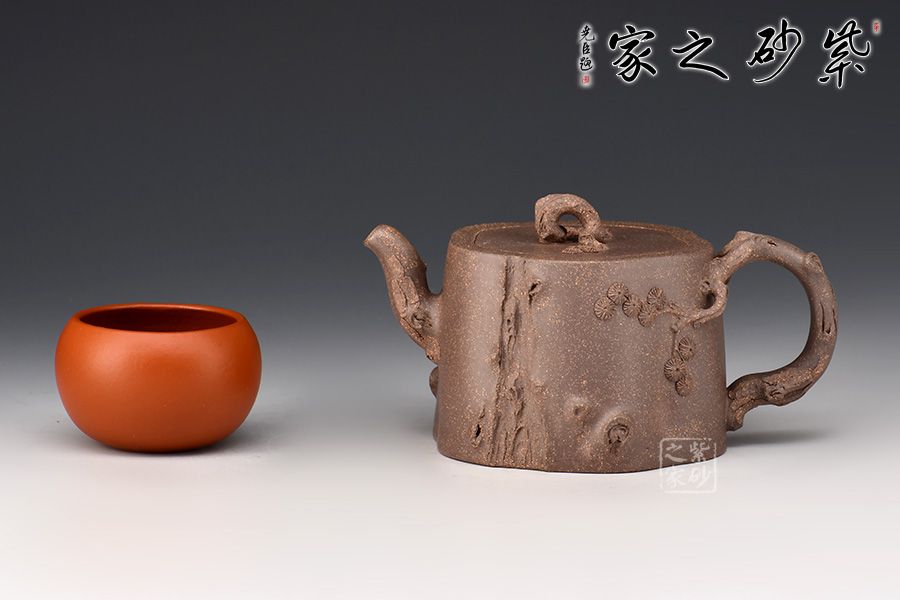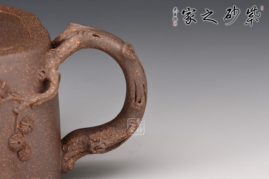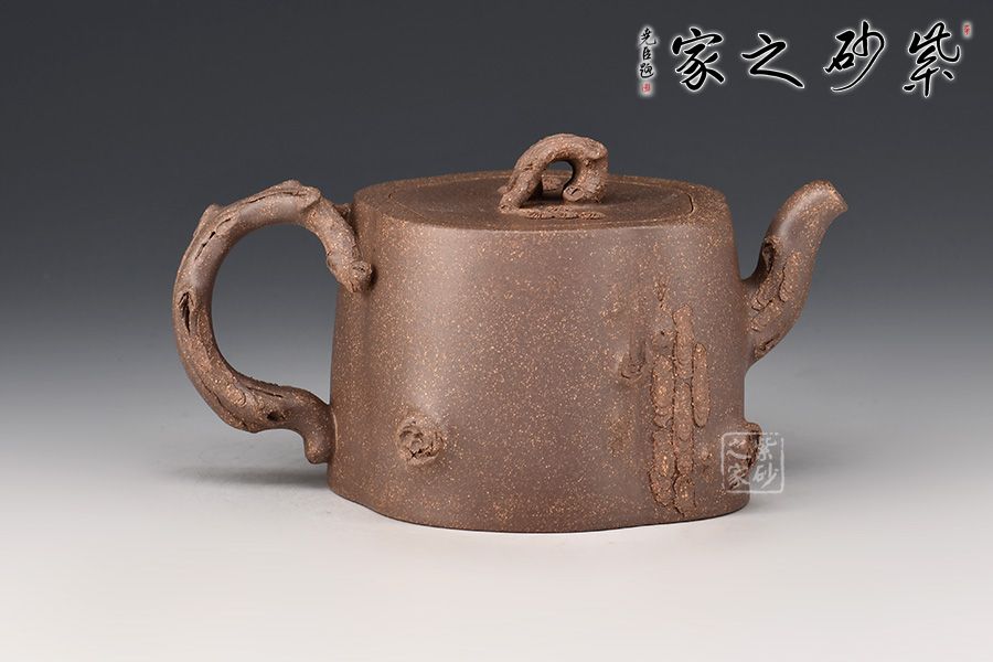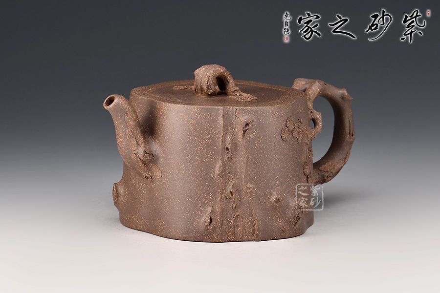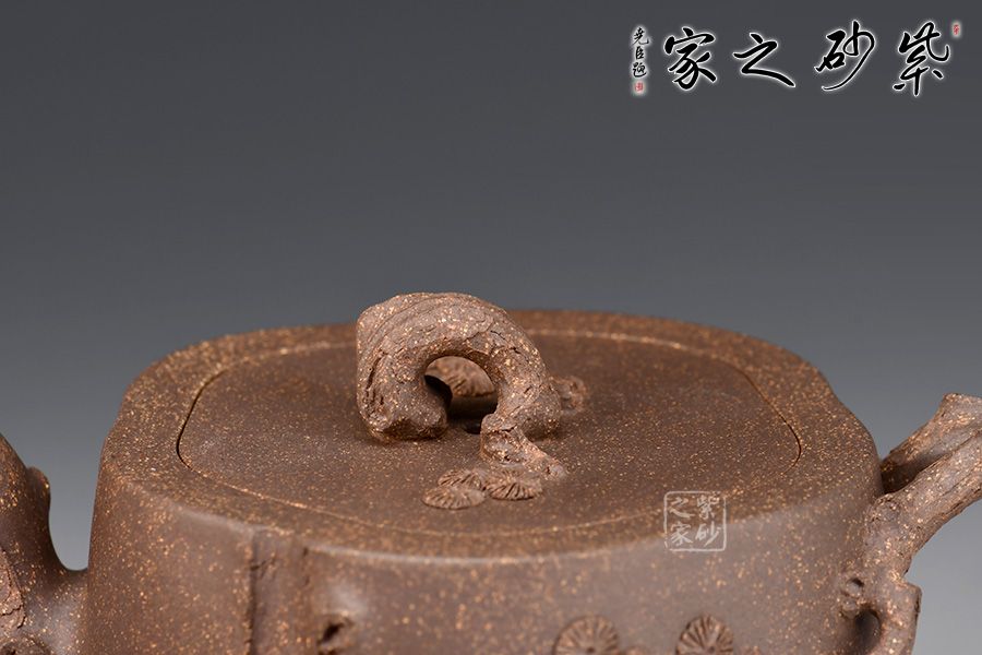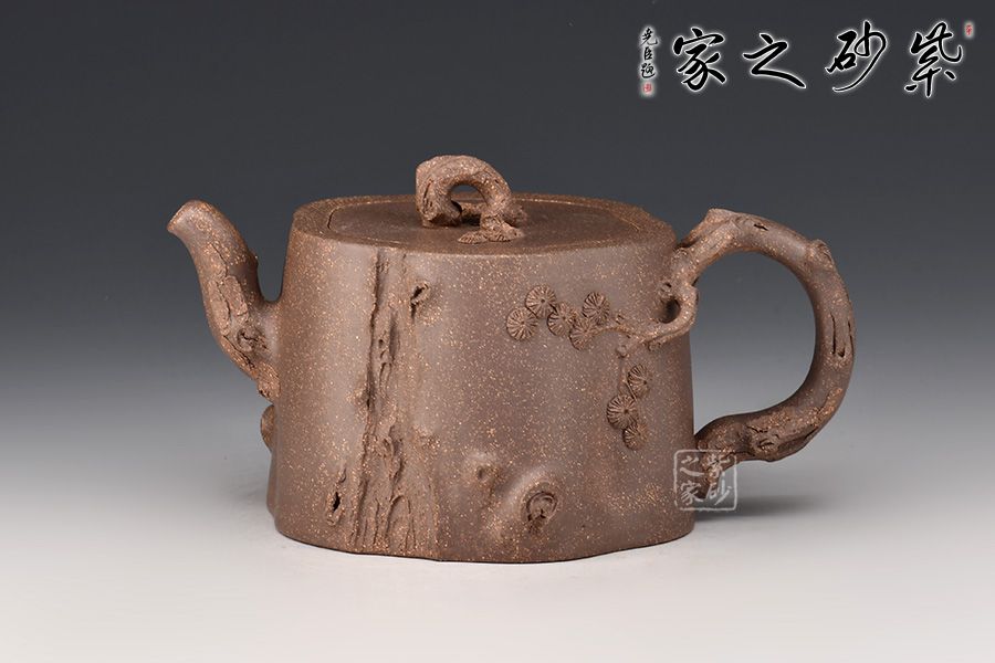 松樁壺是花貨中的傳統(tǒng)壺形,此壺將松樁斑駁而不失蒼勁的形象特點(diǎn)淋漓盡致的轉(zhuǎn)化到壺上,壺身、壺嘴、壺把、壺鈕均以松樁展現(xiàn),穩(wěn)妥古拙、枝干蒼勁,樹(shù)皮刻畫嶙峋有致,疤節(jié)、皺褶、裂紋和突起均處理的十分細(xì)膩,體現(xiàn)出一種錯(cuò)落而又統(tǒng)一的美感。