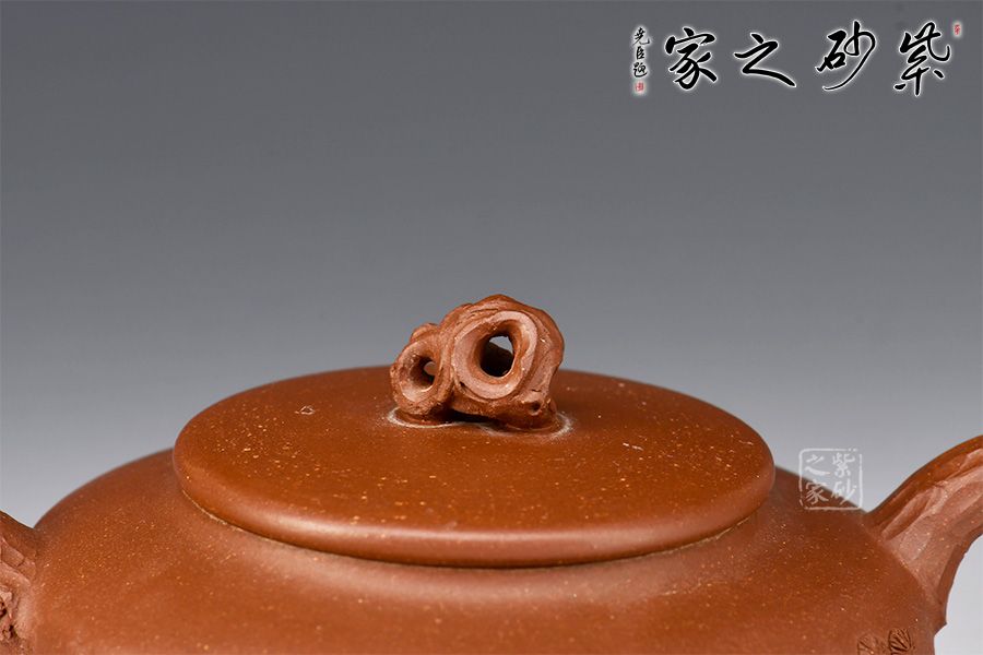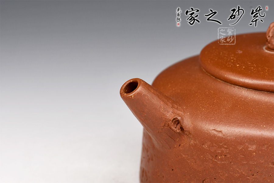 壺身是圓柱形,上下線條筆直,圓滑精致。平蓋簡潔自然,壺鈕形似松枝,趣味十足。彎流壺嘴和耳形把簡潔自然,最動人的,還是壺身上的那一枝松葉,把此壺的趣味表現(xiàn)得非常真切。