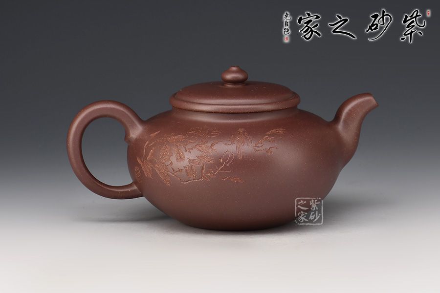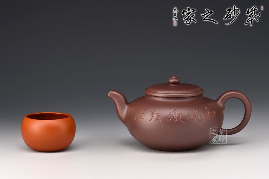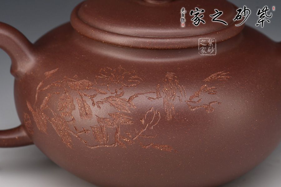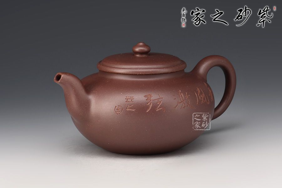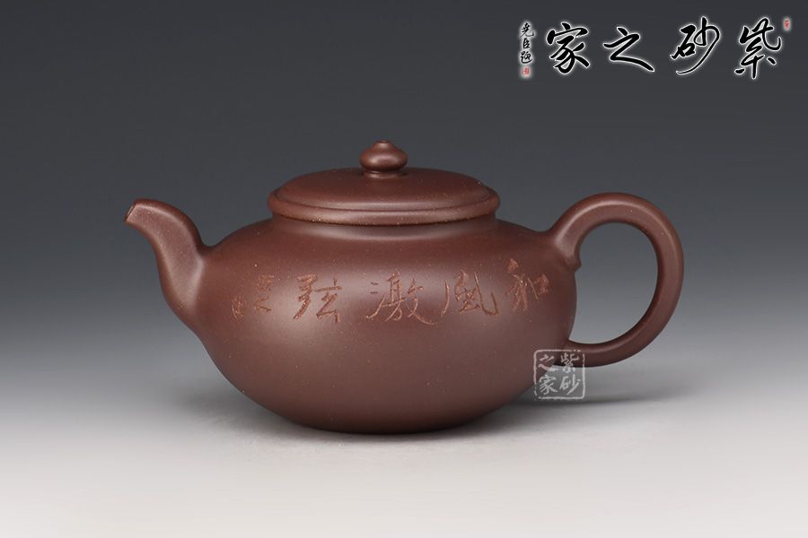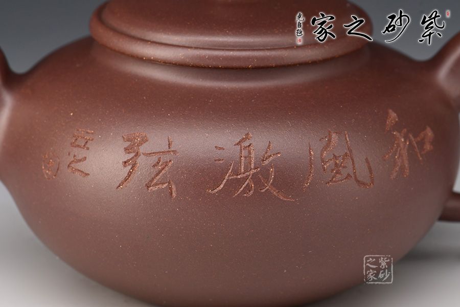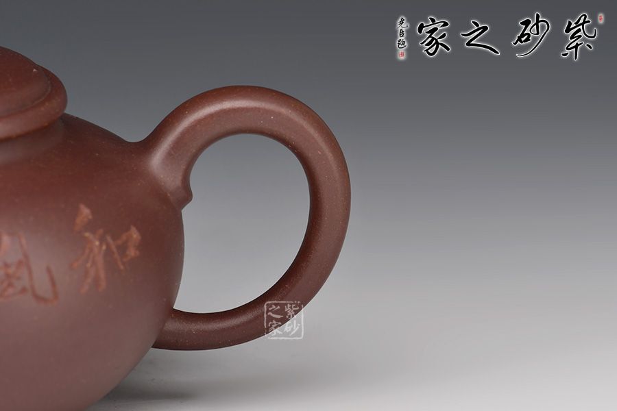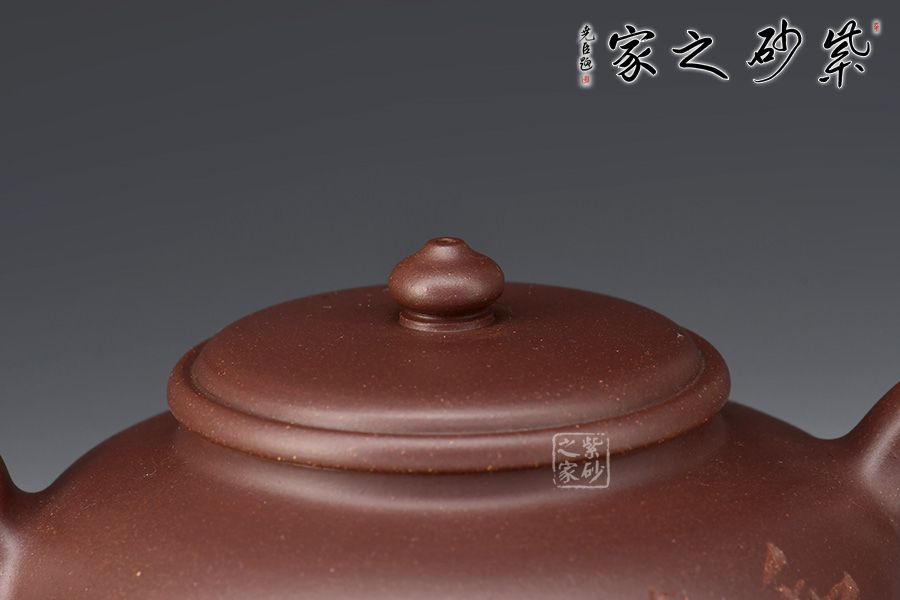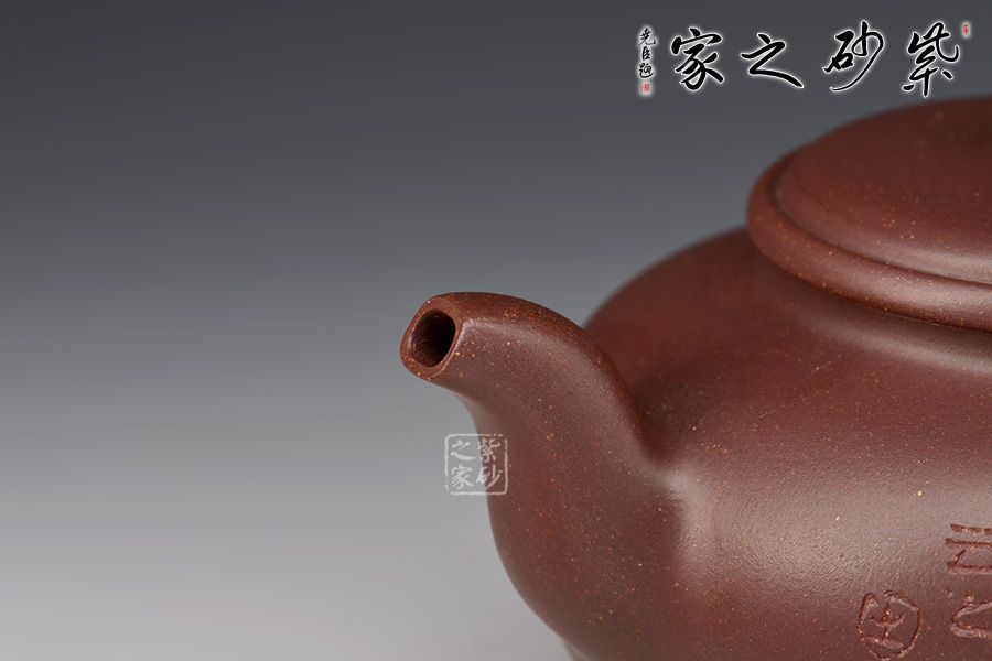 造型仿“鼓”之形,壺身扁圓,壺腹飽滿,鈕、蓋、身三位一體,線條銜接流暢。流、把挺拔胥出,呈對稱之勢。整器工藝精良,氣韻充沛,出水爽利,容量370cc,是一把非常實用的殺茶利器。