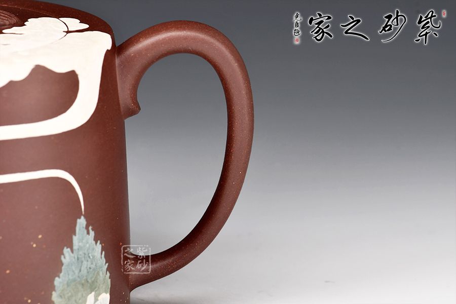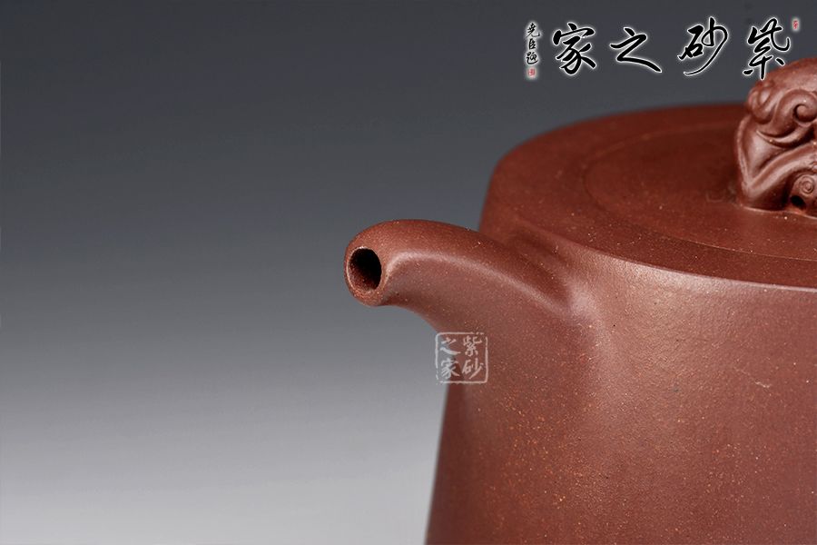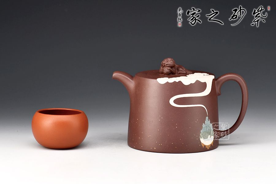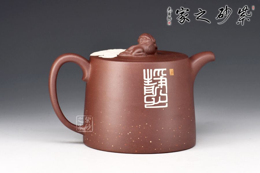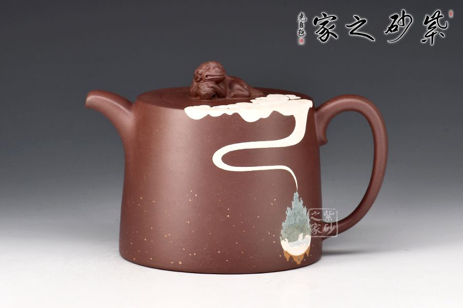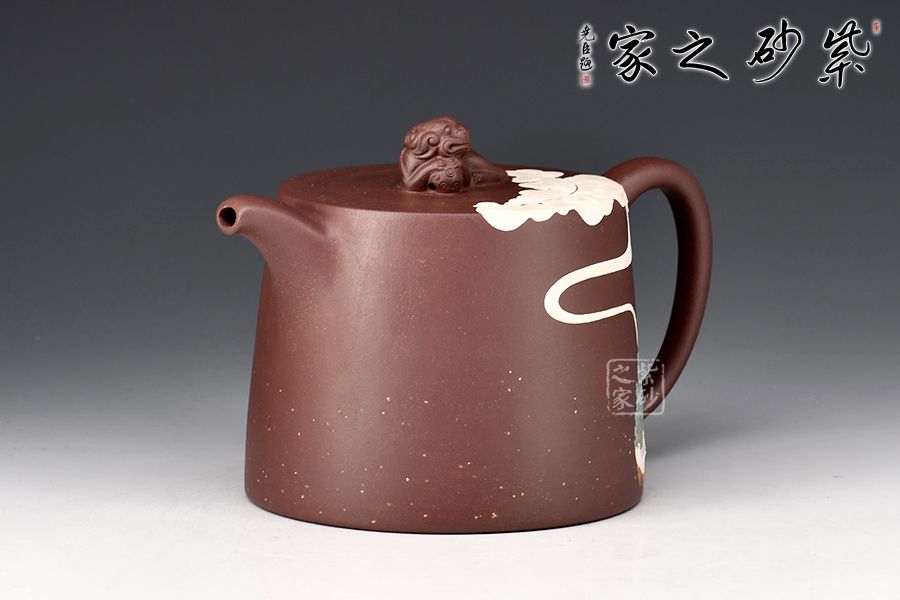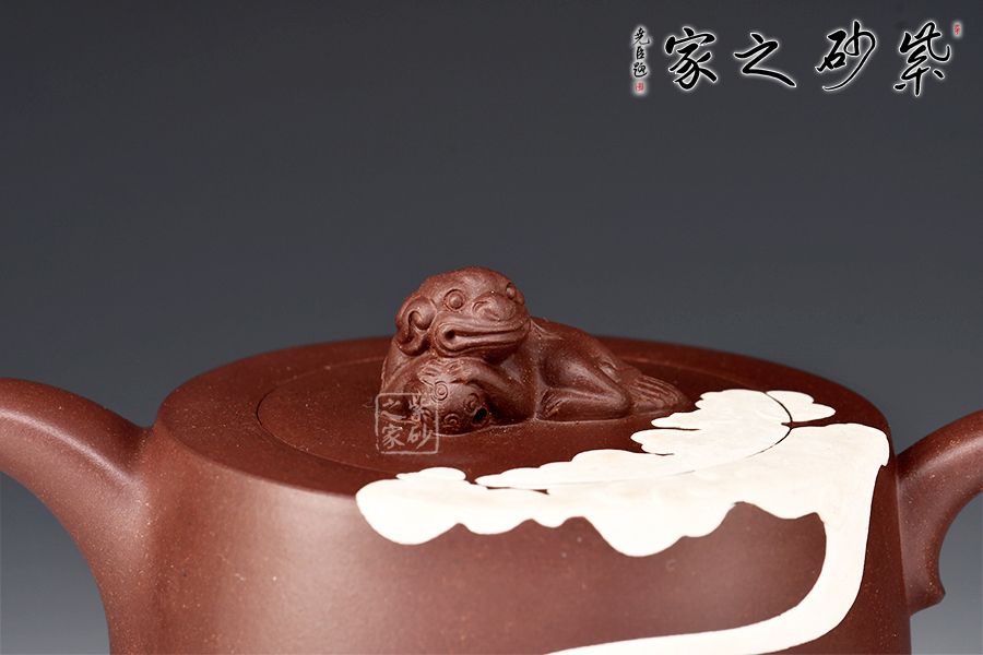 此款靜心壺,古雅韻味。圓柱形壺體,線(xiàn)條流暢。二彎嘴出水爽利,耳把拿捏舒適。瑞獸壺鈕,活靈活現(xiàn)。壺身泥繪香爐,與“靜心”的主題正相吻合。