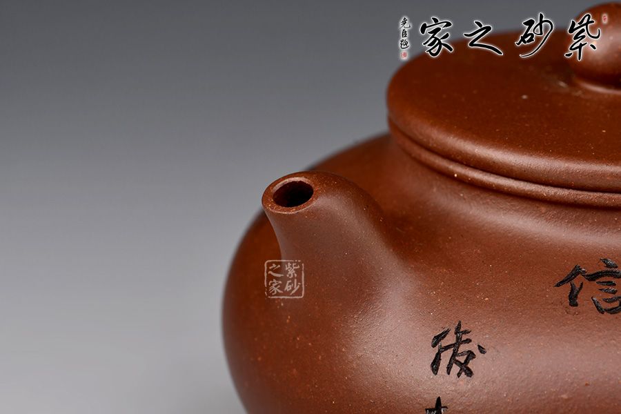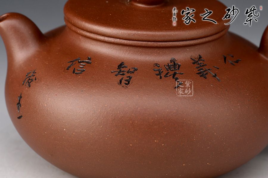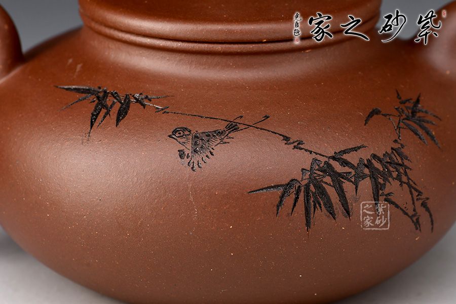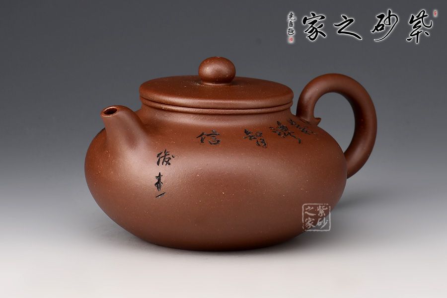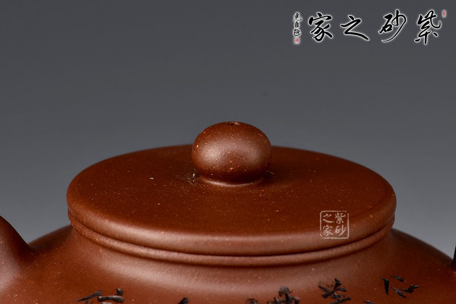 此壺壺身氣韻飽滿,壺身略扁鼓腹,平蓋嚴絲合縫,珠鈕綴于其上,