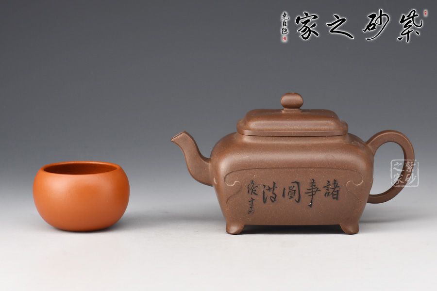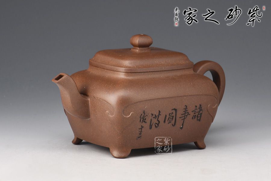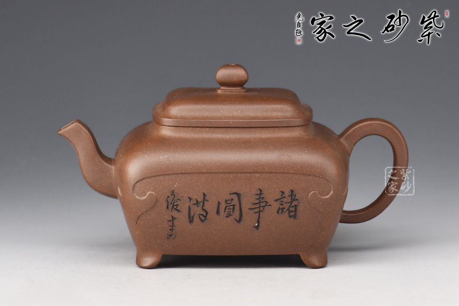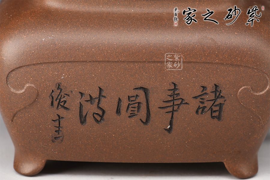 戴俊杰老師的這款諸事圓滿做成了四方器型,彎流與耳形把蕭條俊逸瀟灑,蓋與壺身均為四方形,棱角過渡自然,壺身如意紋裝飾的區域由國大師呂俊杰刻繪:舒適圓滿四個字,與壺的主題相呼應!師徒強強聯合出品,好壺必入!