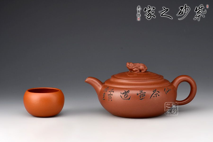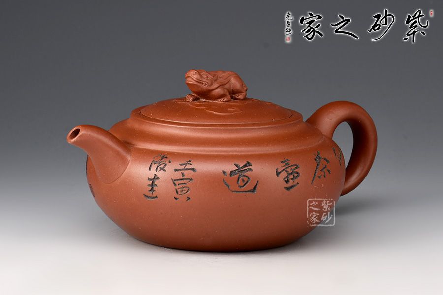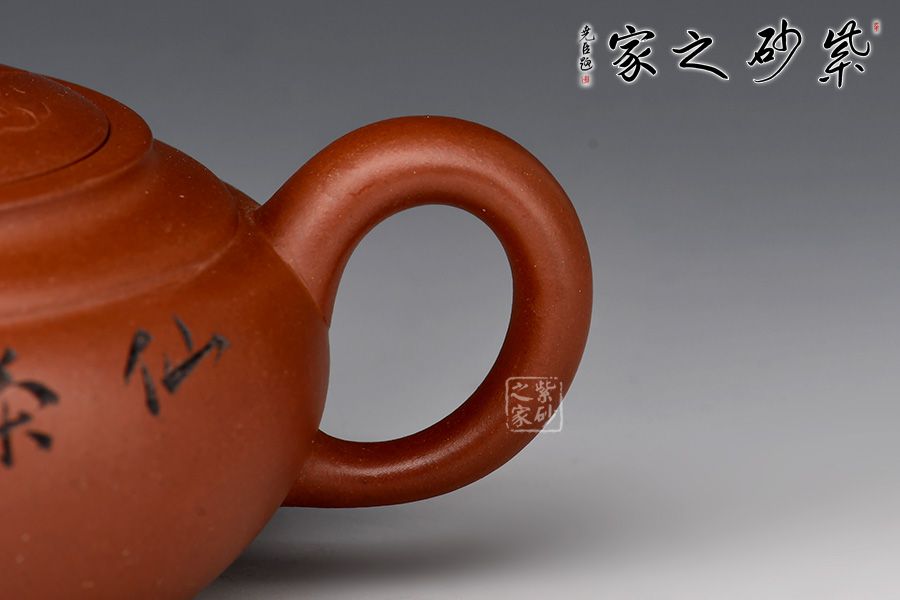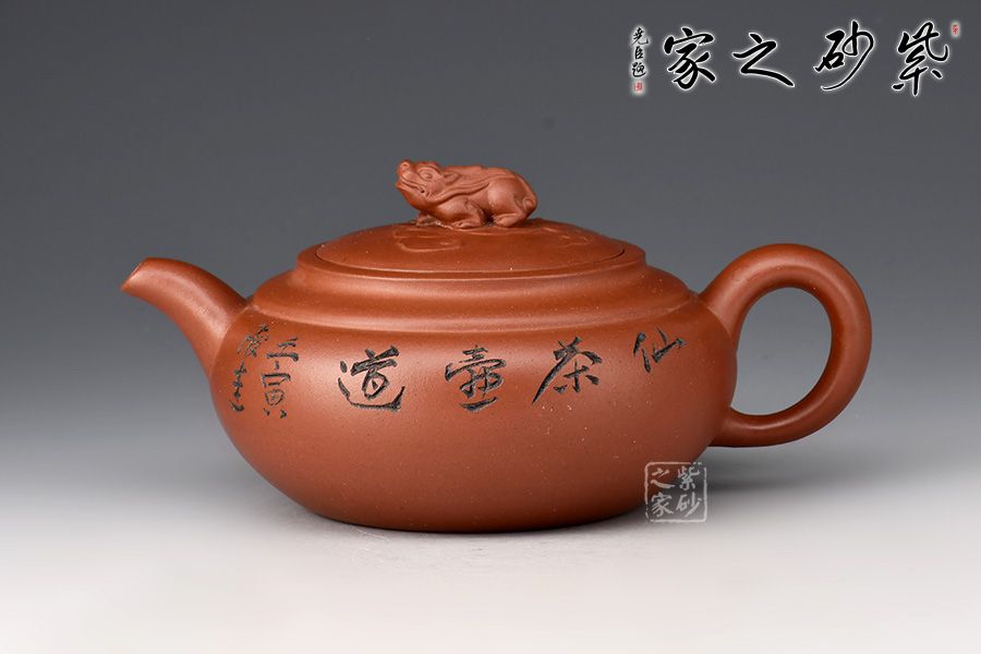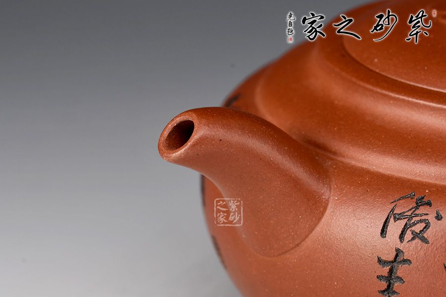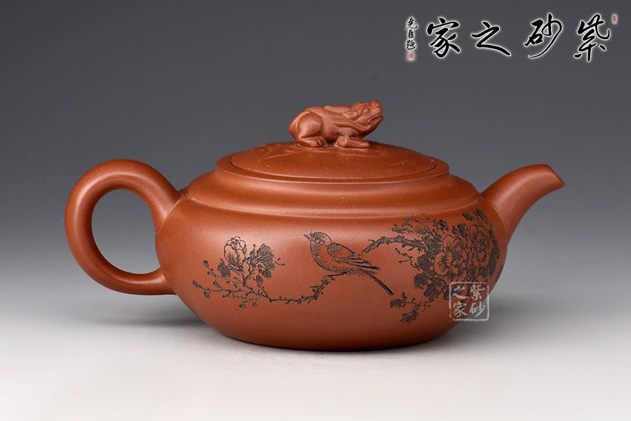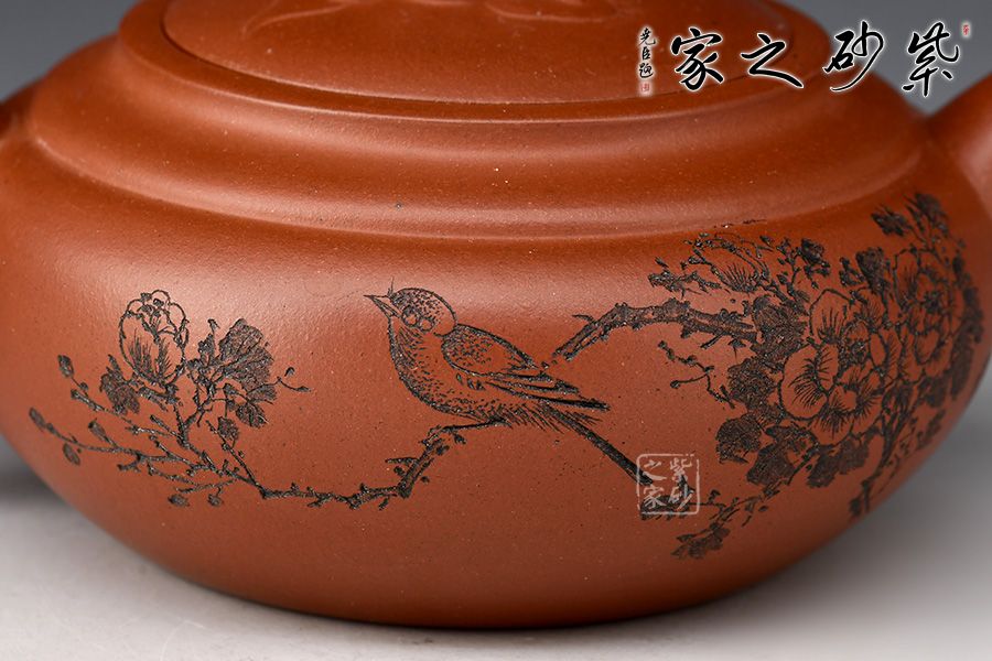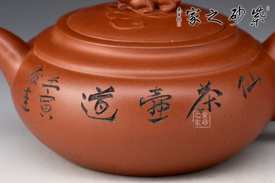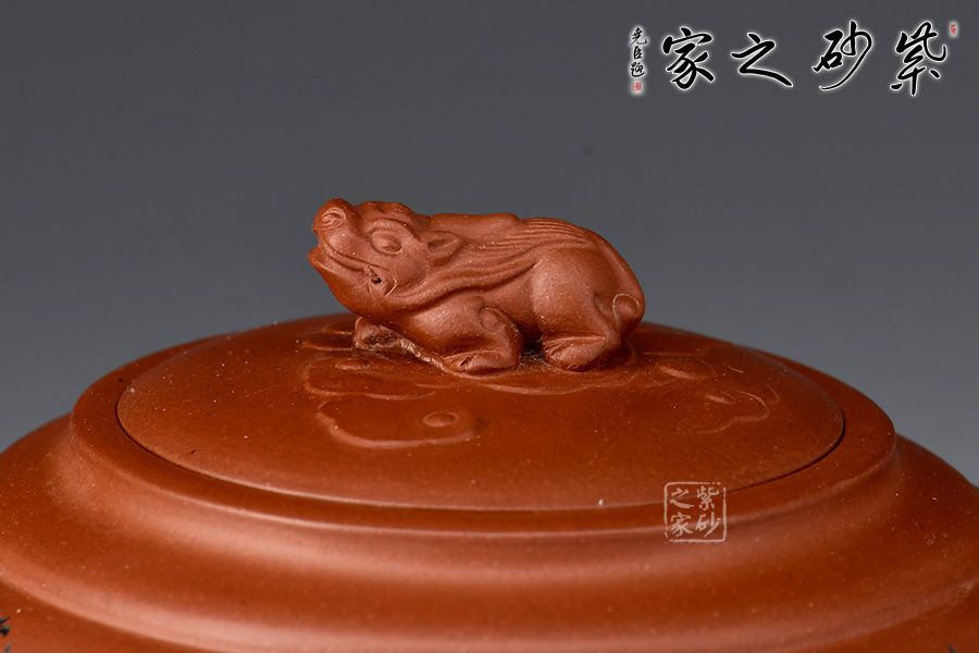 此壺壺身較扁,但扁而不塌,一彎流出水爽快,耳把粗細(xì)過渡自然,嵌蓋與壺口嚴(yán)絲合縫,投茶極為方便,壺鈕為一瑞獸,寓意吉祥如意!壺身由國大師呂俊杰裝飾刻繪,師徒強強聯(lián)合,價值倍增,收藏升值首選!