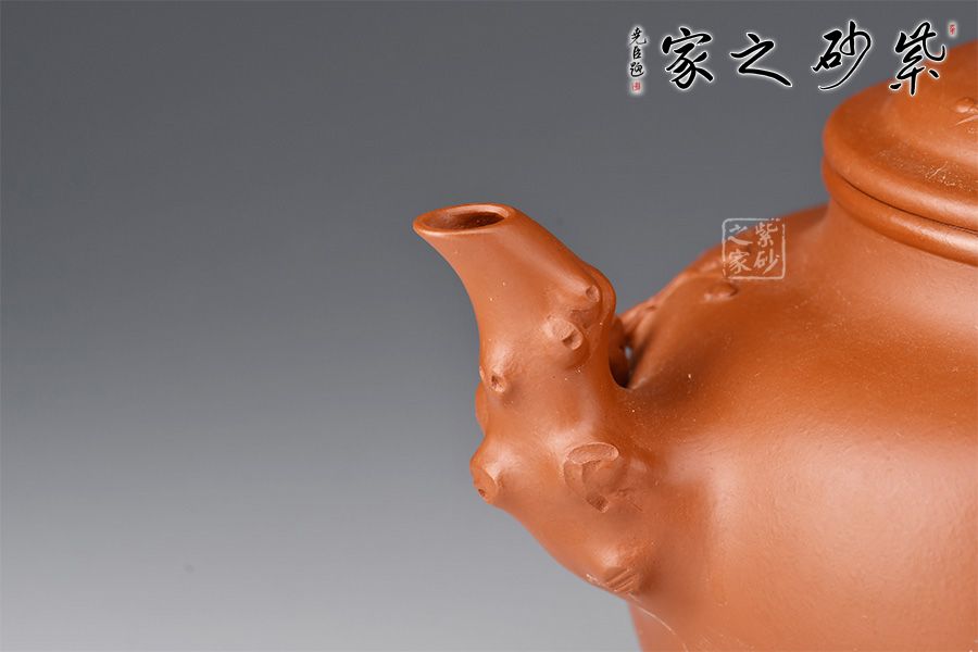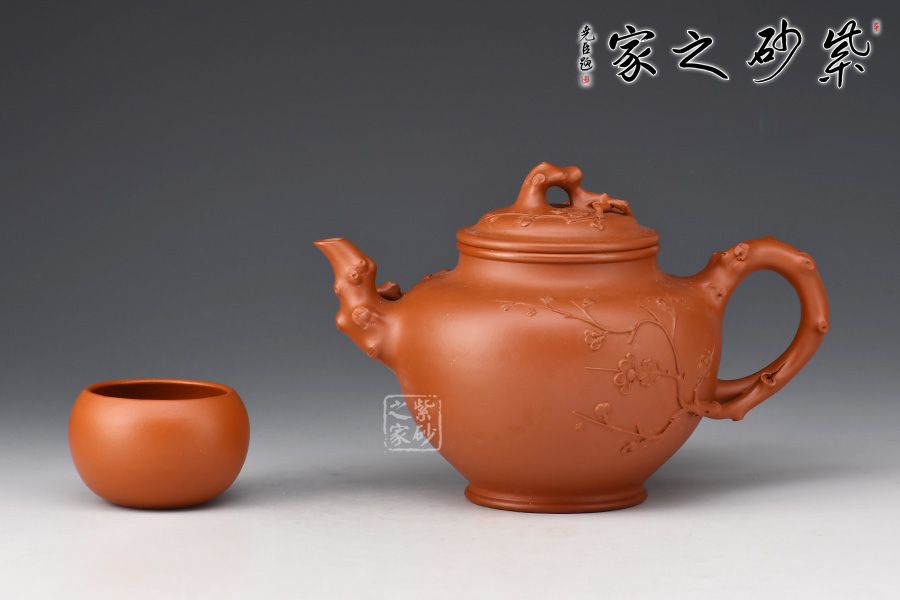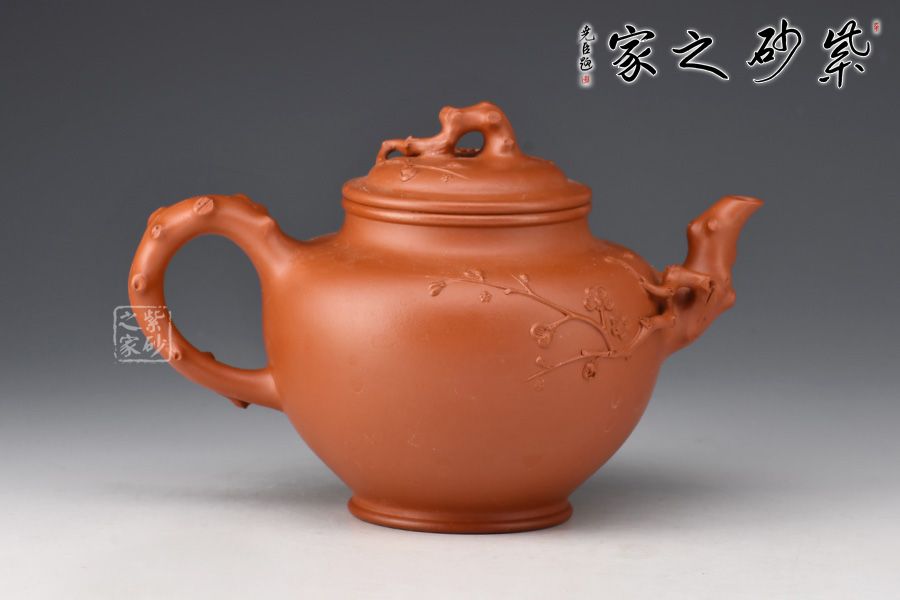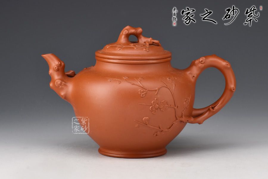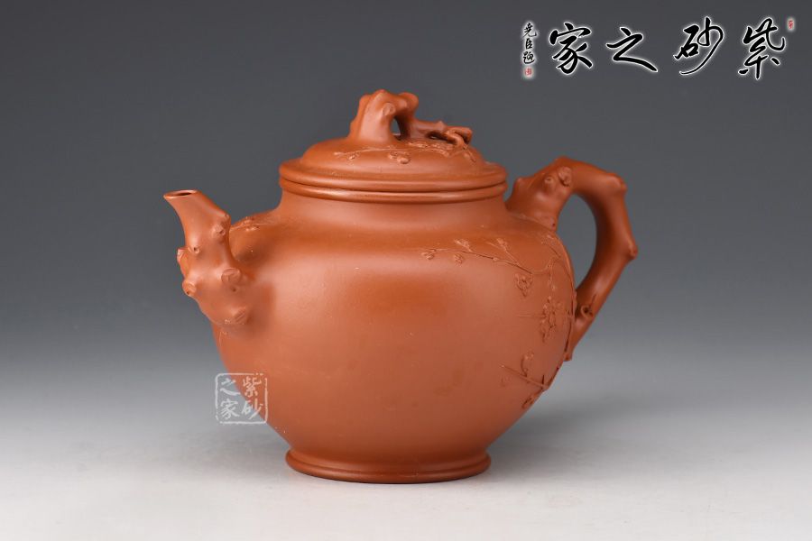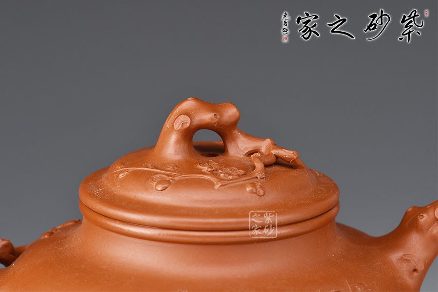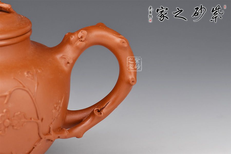 此款作品以梅為創(chuàng)作主題,圈把、彎流、橋鈕皆塑成百年梅枝的造型,紋路逼真,帶給人蒼勁與穩(wěn)健之感。整款作品線(xiàn)面和諧,梅枝裝飾,意趣盎然;而光貨與花塑器的融合,使整件作品更具生命力;此款作品為戴俊杰老師全手工制作,泥色鮮艷,質(zhì)感細(xì)膩,為藏家所愛(ài)。