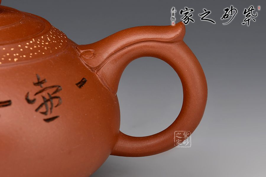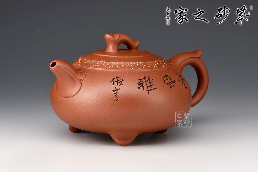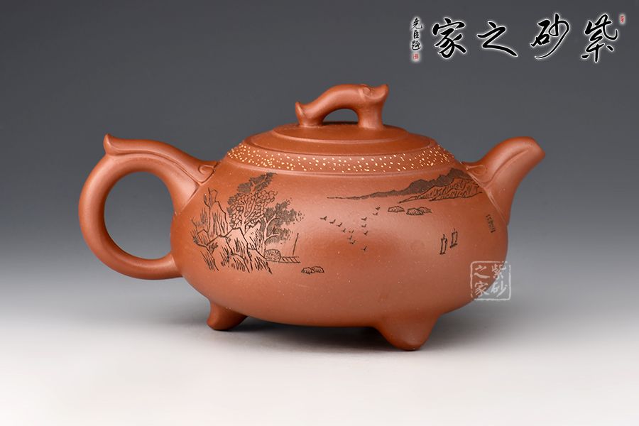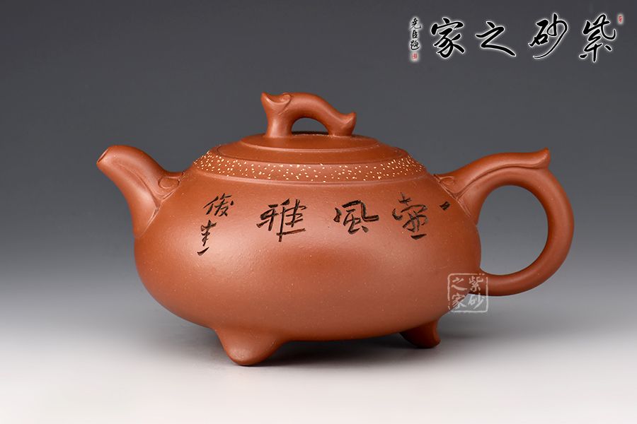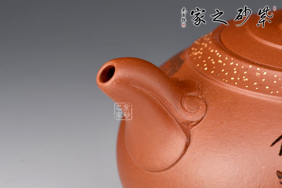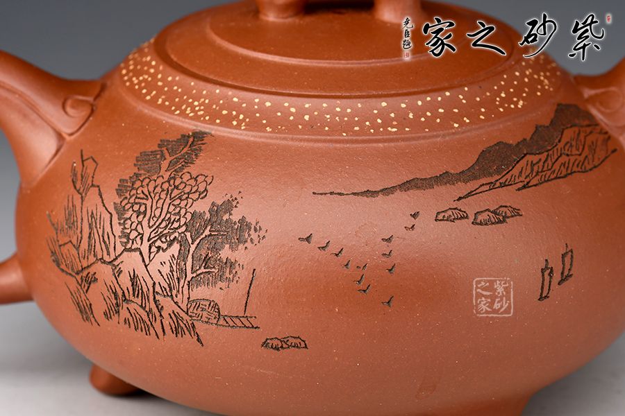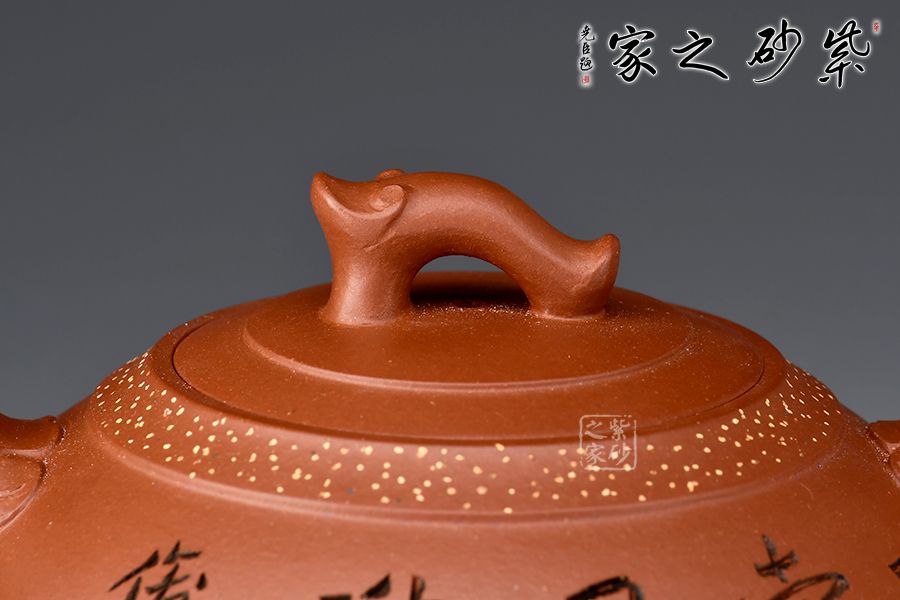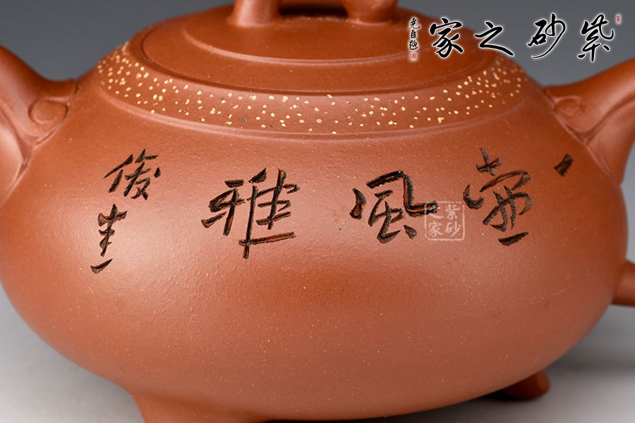 如意一壺風(fēng)雅壺,造型新穎美觀,壺嘴、壺把和壺鈕處皆有如意紋裝飾,儒雅精致,細(xì)細(xì)觀之,猶若蛟龍飛游其上,意趣橫生。壺口處采用鋪砂制壺工藝,由乳黃色的小點(diǎn)做裝飾,雅趣十足。該壺的刻繪皆由其師傅呂俊杰完成。壺正面刻繪“一壺風(fēng)雅”四個(gè)大字,反面刻繪山水之景,師徒合制,升值加倍,推薦收藏!