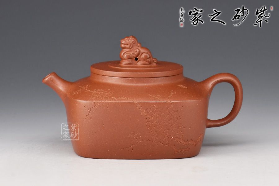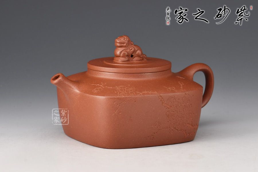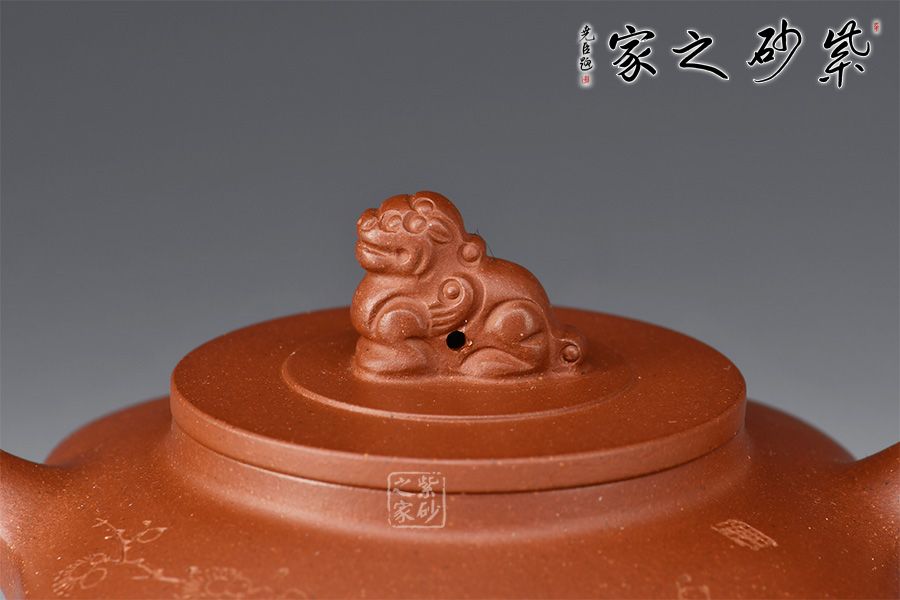壺身四方造型,壺腹呈方鼓形,短頸,平蓋,蓋面作一瑞獅鈕,