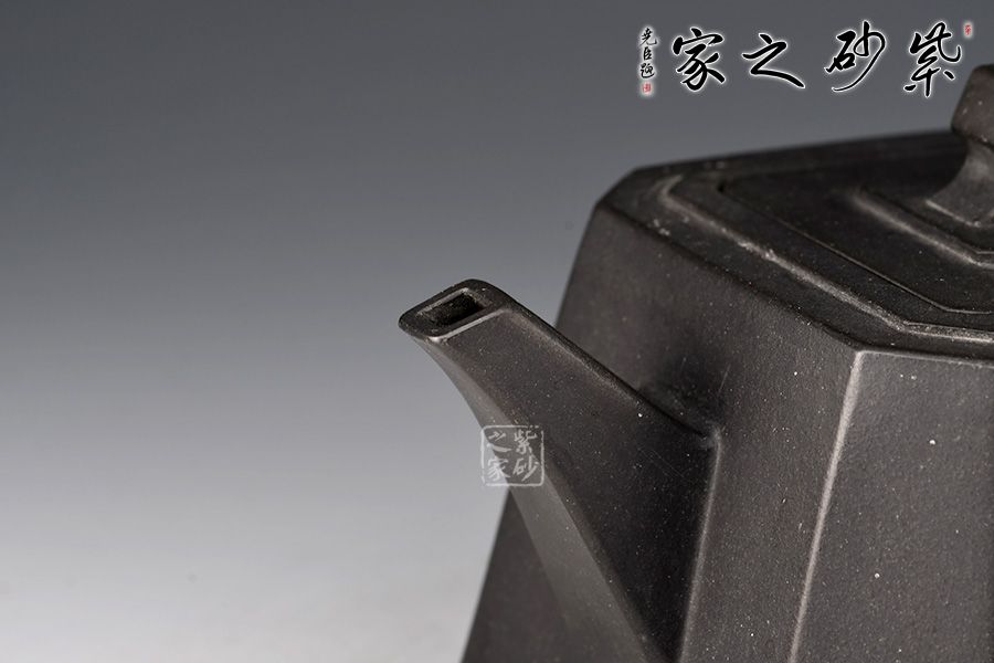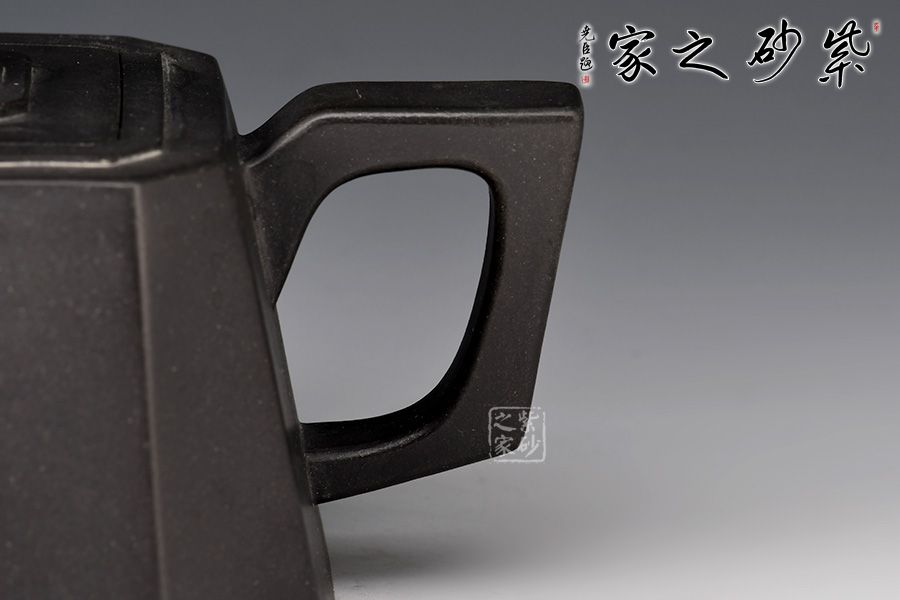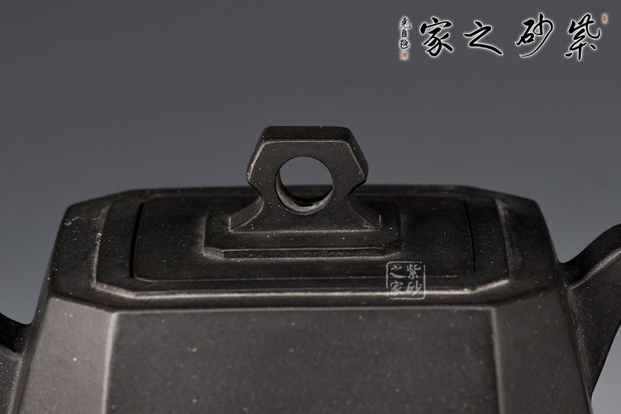 此壺自壺鈕至圈足,從上到下用八根線(xiàn)條將壺身分為八個(gè)塊面。蓋、鈕、把巧妙延續(xù),將穩(wěn)重與靈巧平衡得剛剛好。整體造型比例協(xié)調(diào),線(xiàn)面挺括有力,輪廓分明,全器氣勢(shì)挺拔,英姿颯爽,成就紫砂方器之美。