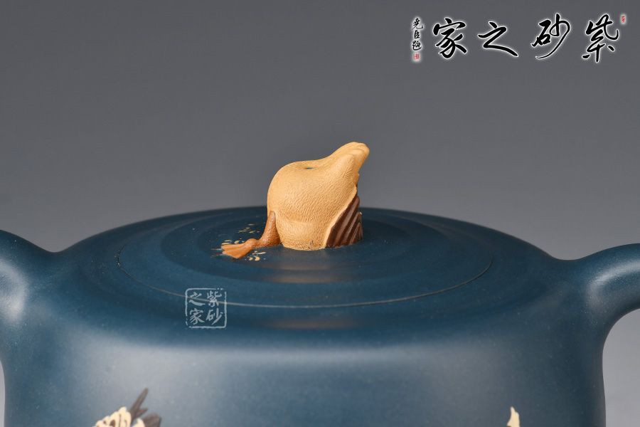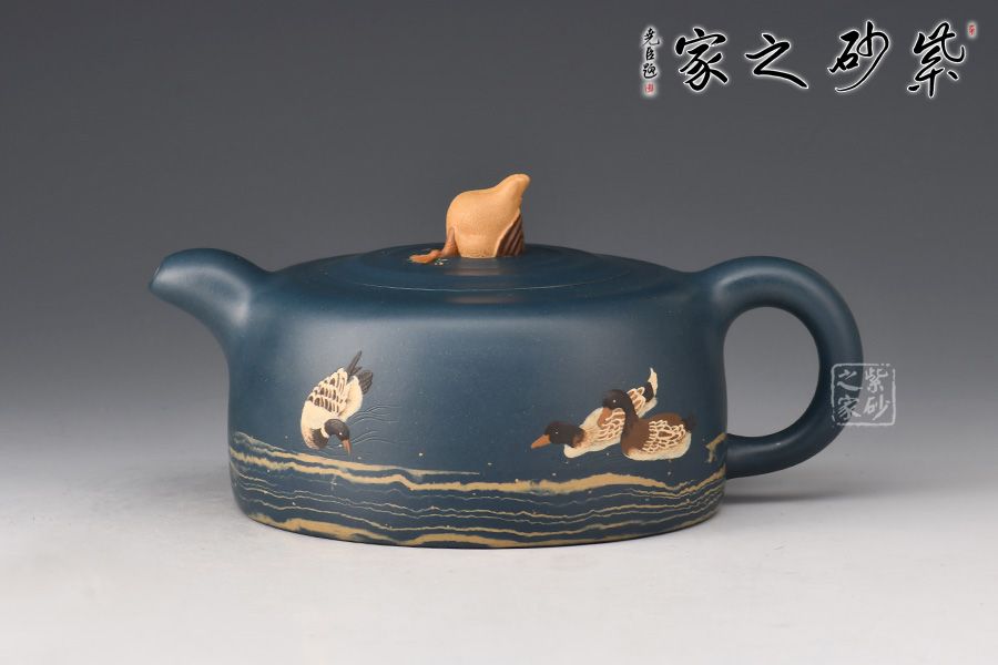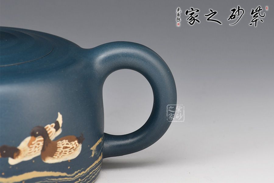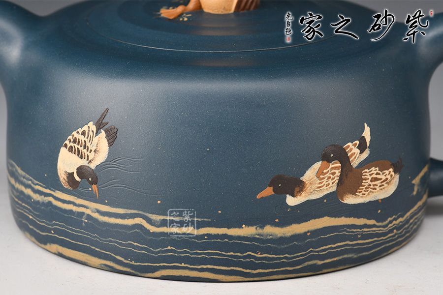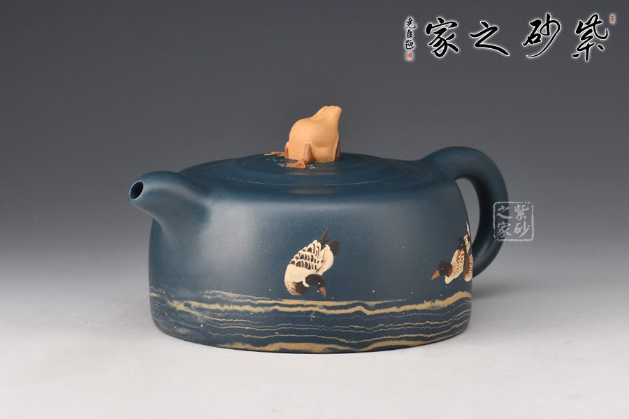 最具特點(diǎn)的是“水暖”,他用粗、細(xì)有別的砂慢慢鋪在壺身上,底下粗越往上越細(xì)。還有壺身繪數(shù)鴨,壺鈕設(shè)計(jì)最為有趣,以”鴨屁股朝天“展現(xiàn),鴨子探身試水溫,用紫砂語(yǔ)言生動(dòng)地將所見(jiàn)的情景表達(dá)了出來(lái)。