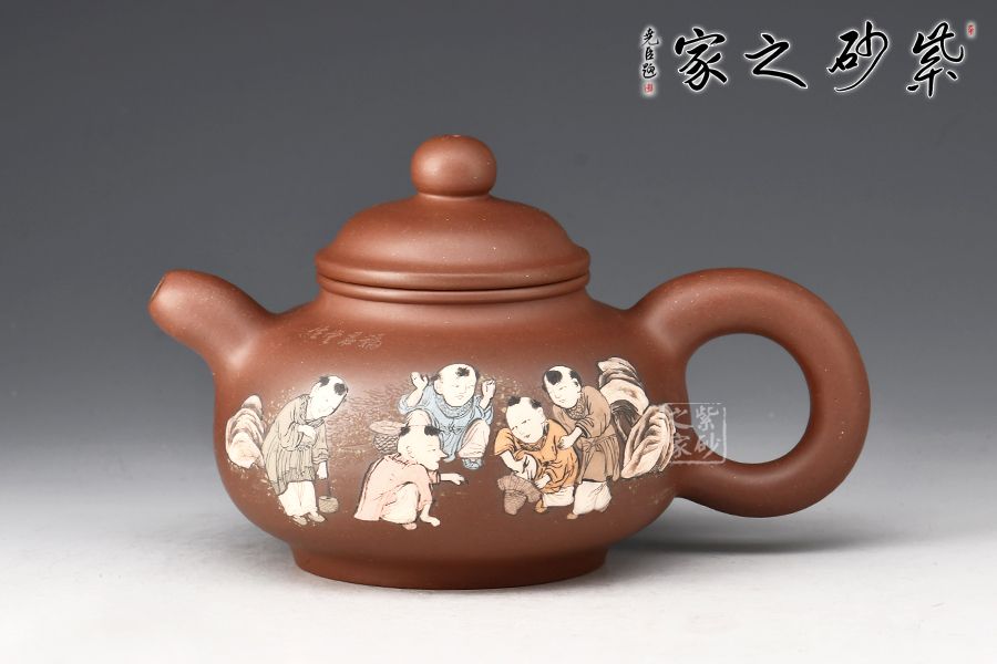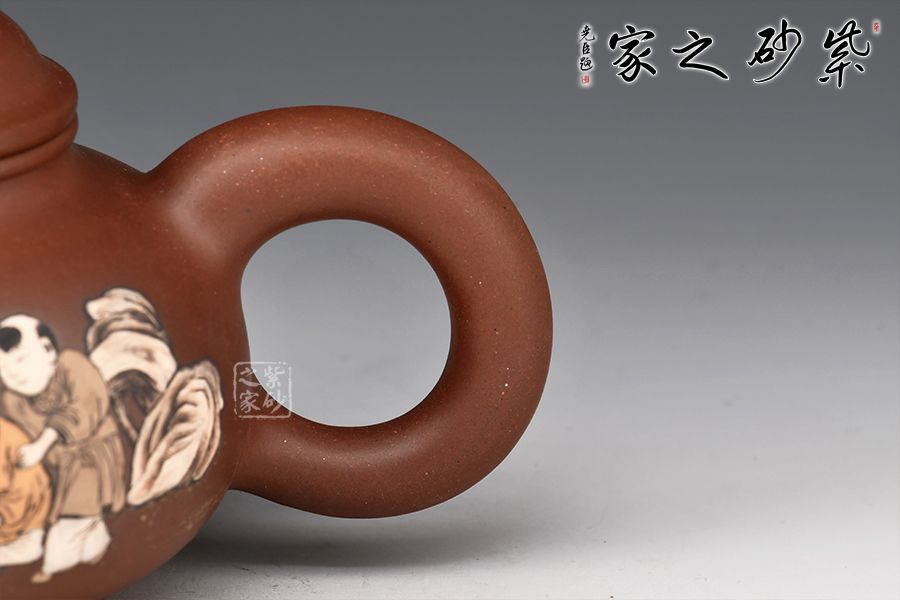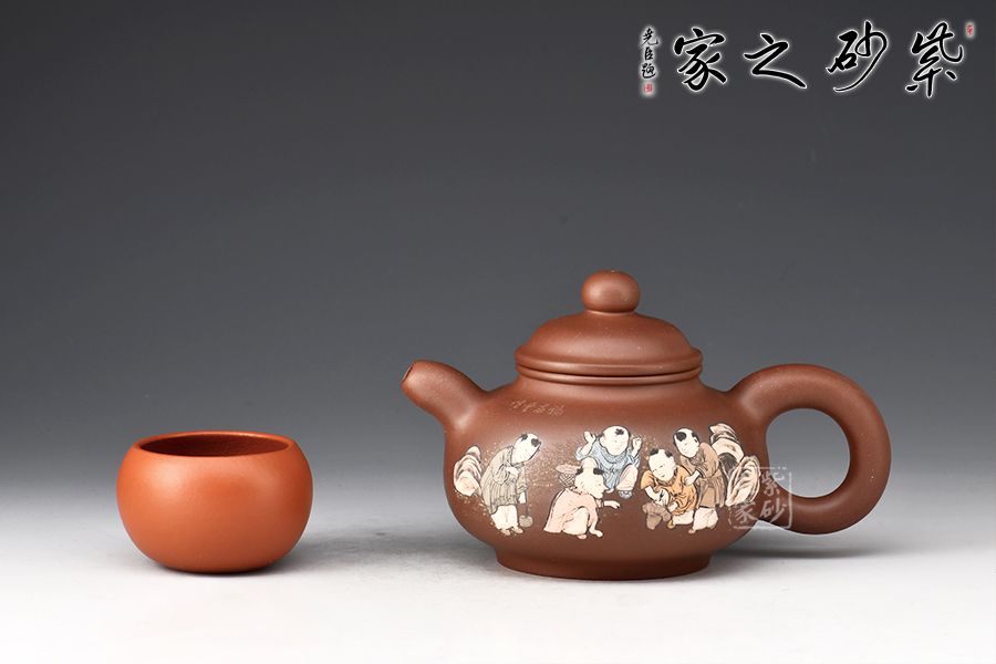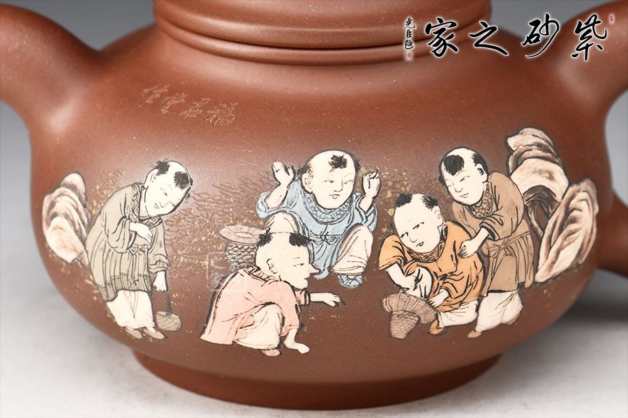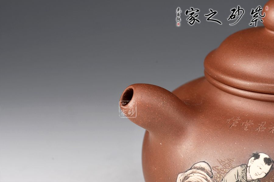 壺身由其子王志明(天樂)刻繪裝飾,正面陶刻童子圖,趣味十足,反面陶刻詩詞。整器氣韻生動(dòng),內(nèi)蘊(yùn)十足,上手舒適,成色佳,易泡養(yǎng),是一把賞用俱佳的文人壺佳作。