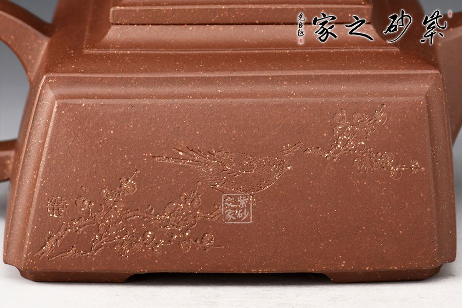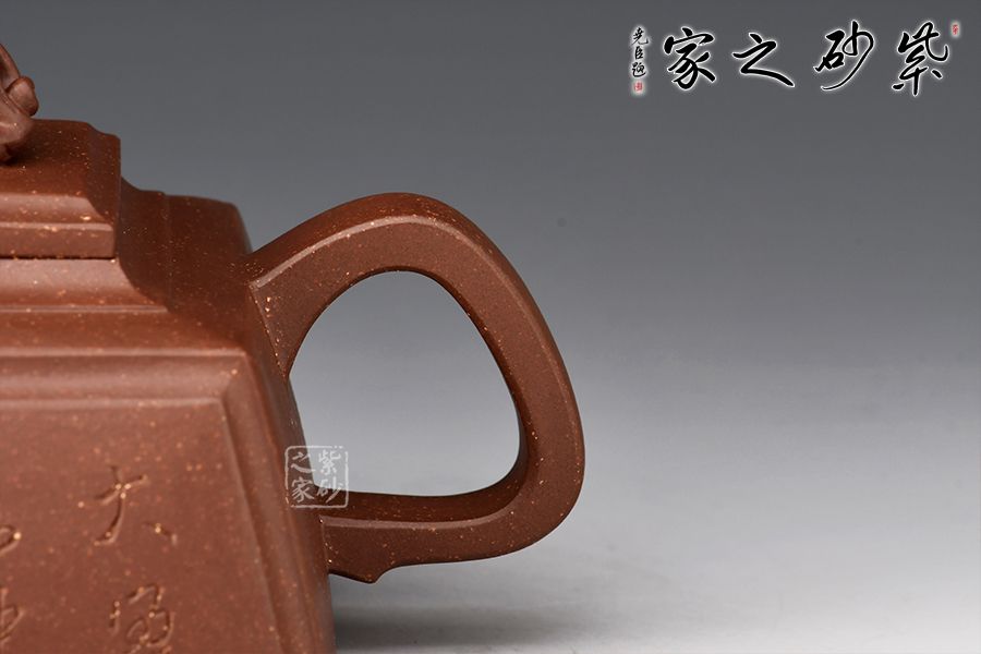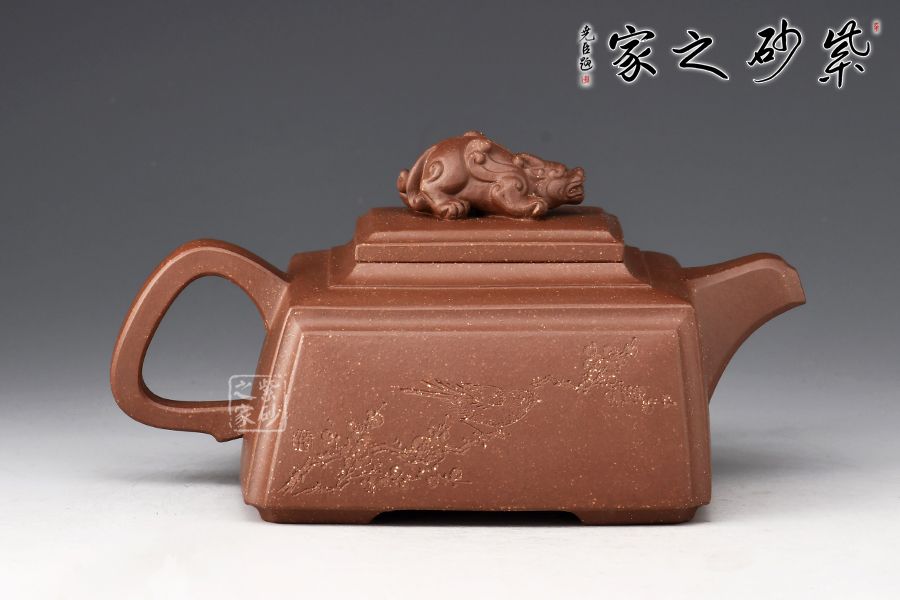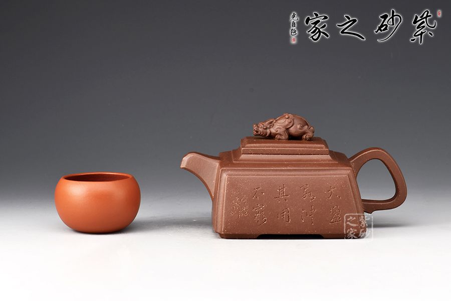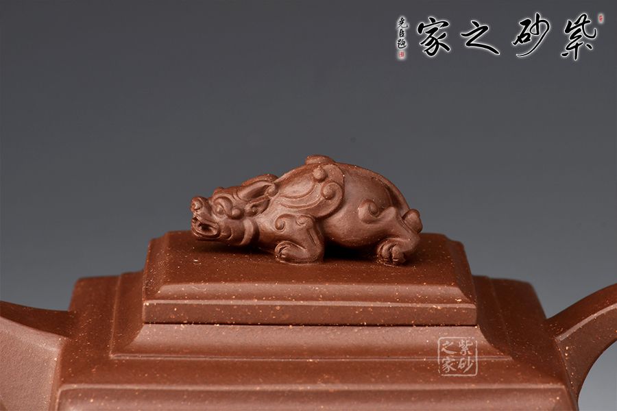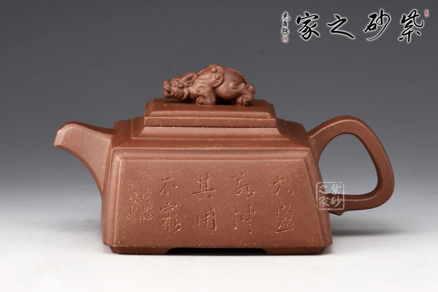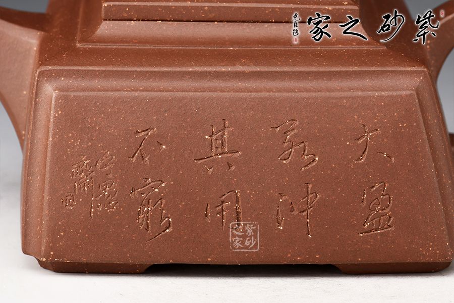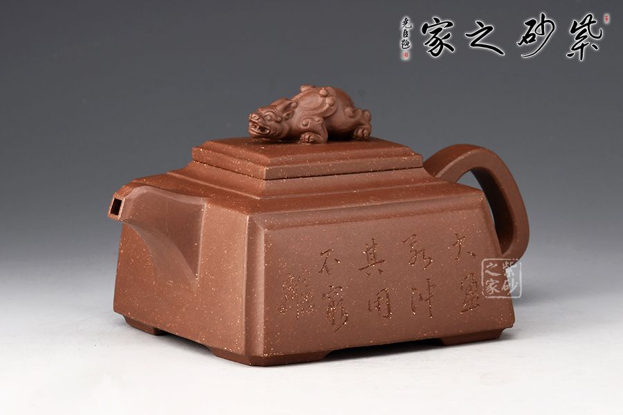 四方靈犀壺為一款方器,瑞獸壺鈕,寓意招財(cái)進(jìn)寶。壺身、壺蓋皆為四方,圈把端握舒適,壺身刻繪大盈若沖,其用不窮,源自《道德經(jīng)》,意為最完滿(mǎn)的東西,好似有殘缺一樣,但它的作用永遠(yuǎn)不會(huì)衰竭,意蘊(yùn)十足。原礦紫泥制作,色澤古樸端莊,惟妙惟肖,可見(jiàn)技藝?yán)系馈?/p>