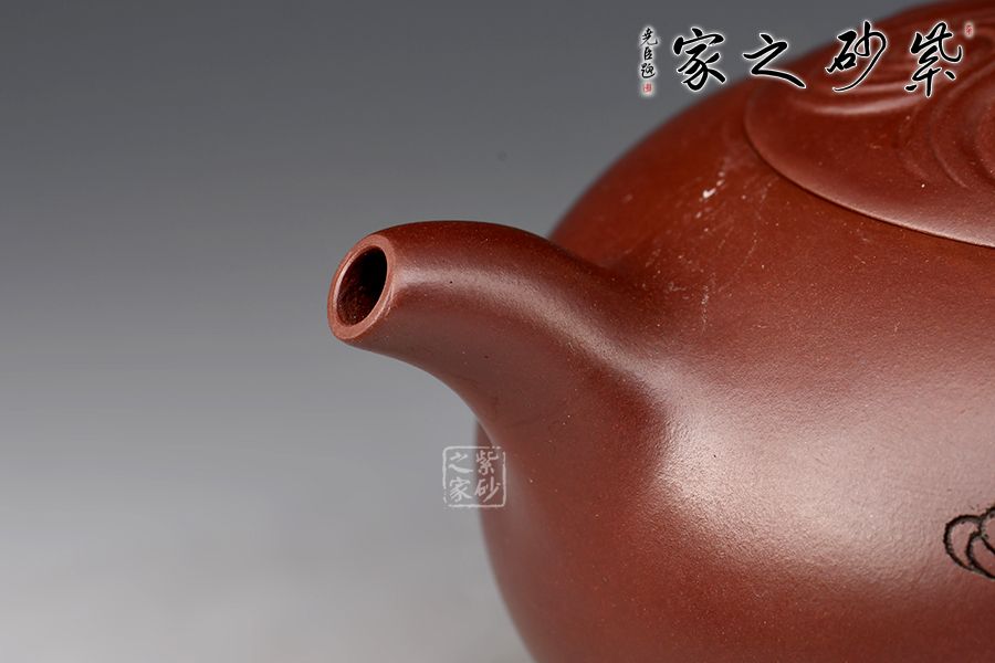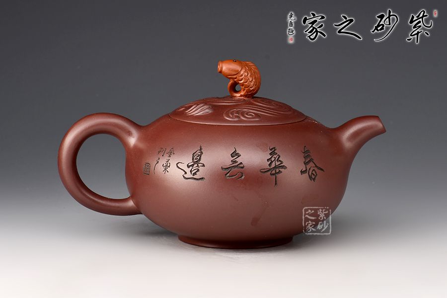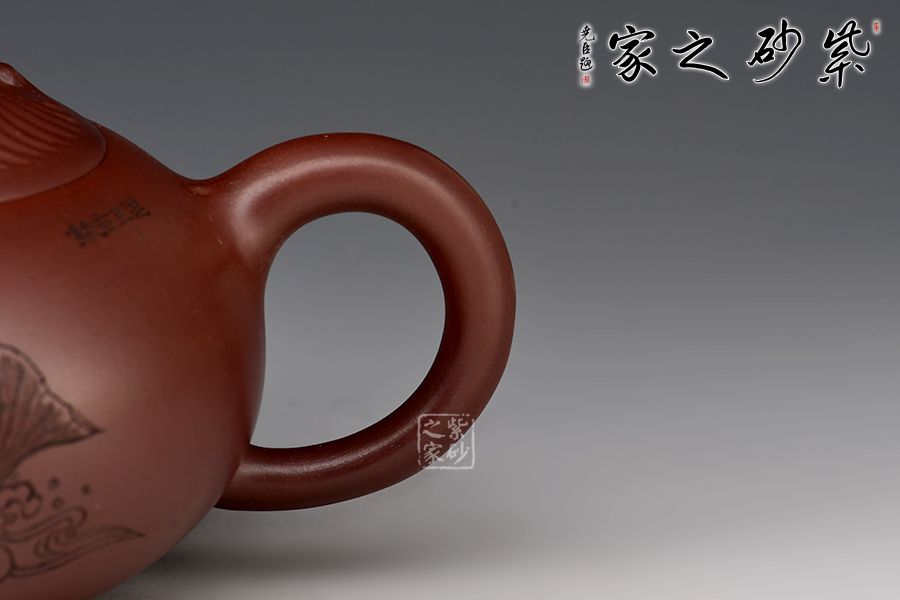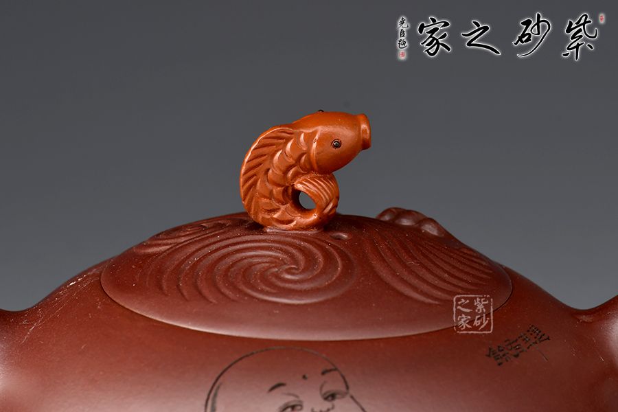 壺鈕以魚為形,栩栩如生,神態(tài)可愛,每一片鱗都清晰可見,魚尾飄逸,蓋面水波蕩起漣漪,壺身由實(shí)力才女陶金蘭老師刻繪,自然融合!一彎流及耳把相稱,整壺圓潤(rùn)飽滿,氣韻不凡,力薦!