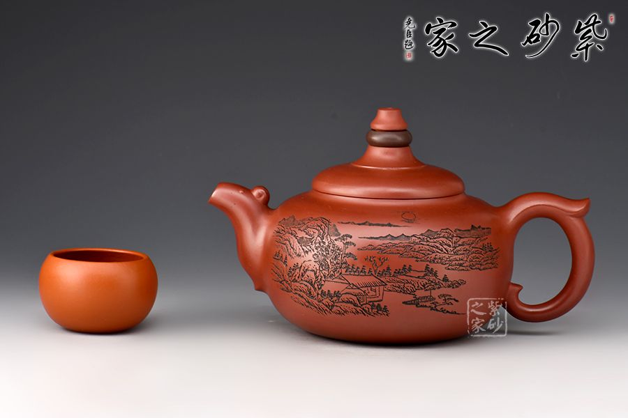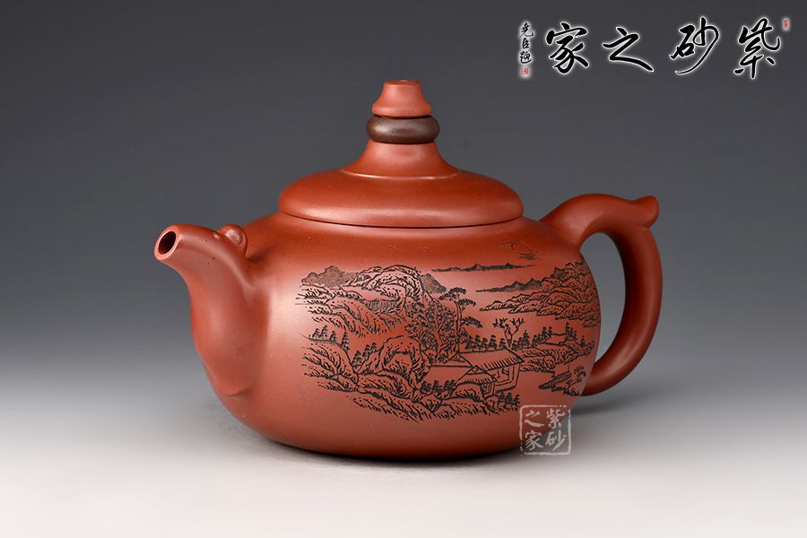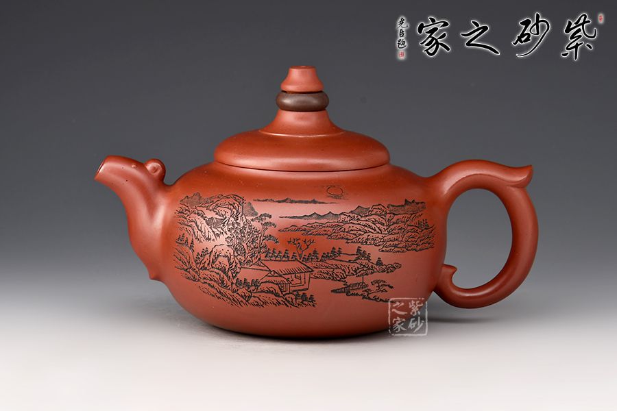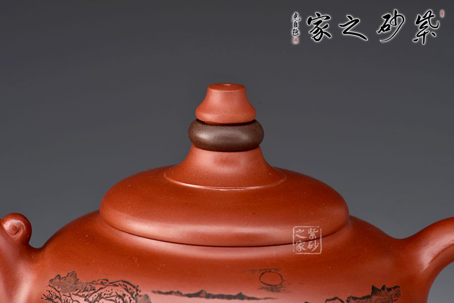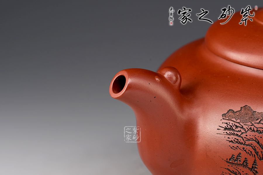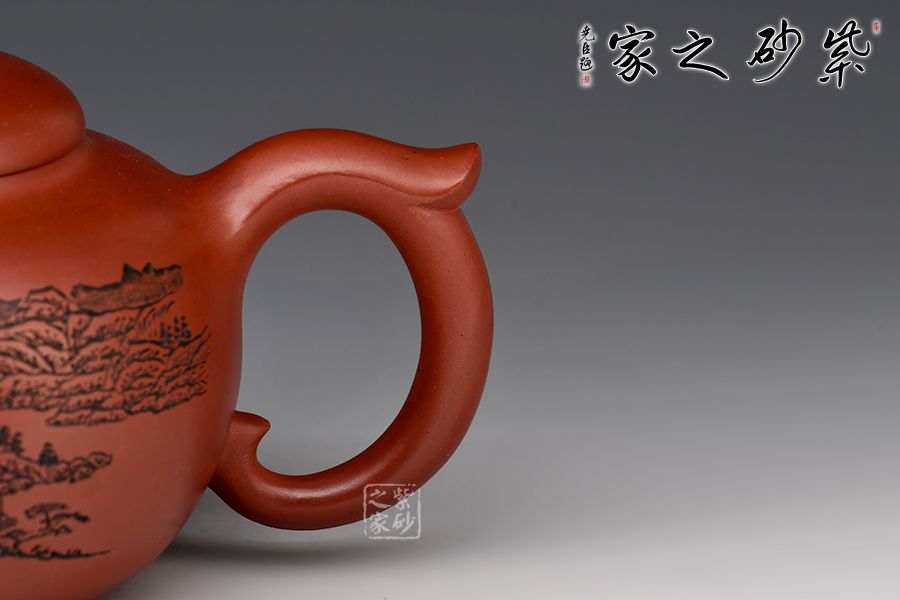 壺嘴似鳳凰高昂的頭顱,其上還有一頂冠子;壺把似鳳凰下垂的尾羽,飄逸俊秀。壺身之上由梁振林老師裝飾的山河遼闊盛景,令觀者受瑞氣臨身,極富祥意。