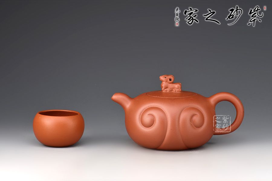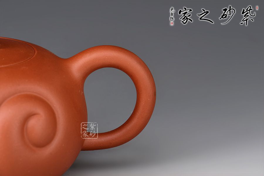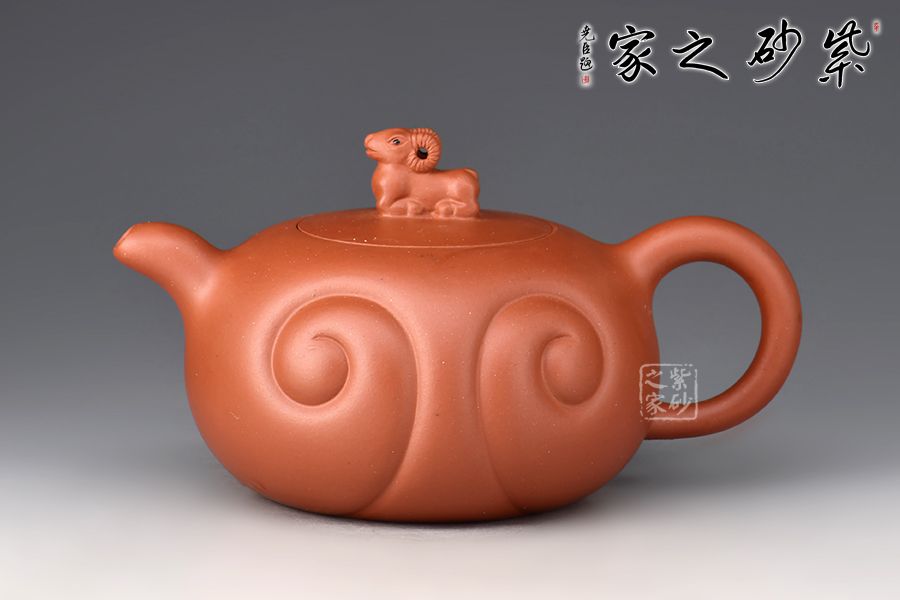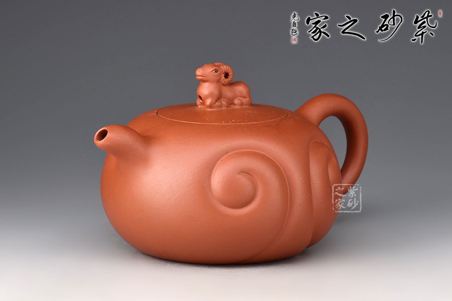 “吉祥”通“吉羊”,羊是代表“吉祥”的瑞獸,也是家庭財富的象征。壺身扁圓似羊身,壺身兩圈陰線如意紋似卷曲的羊毛,流把線條流暢、弧度優(yōu)美,與壺身相諧。