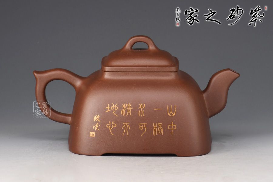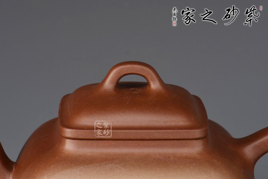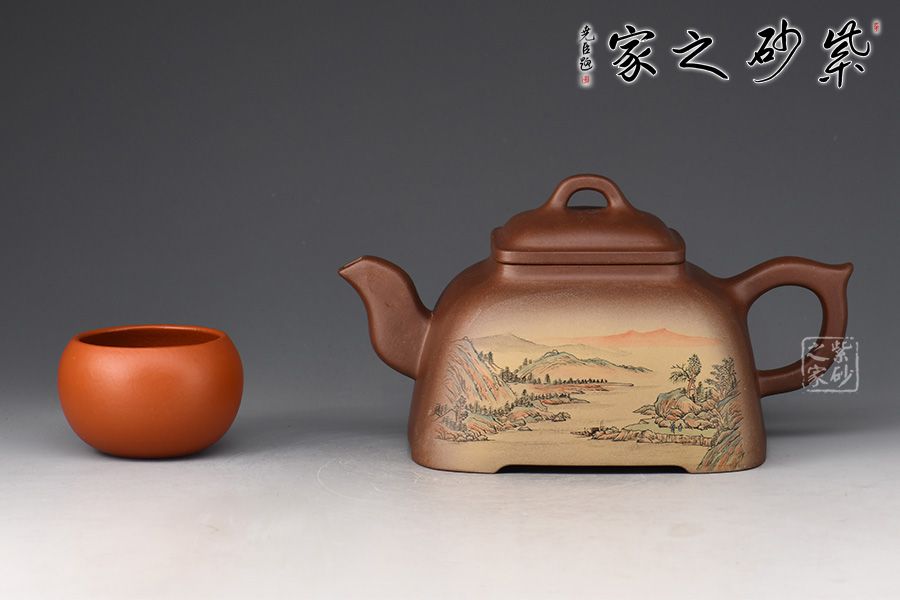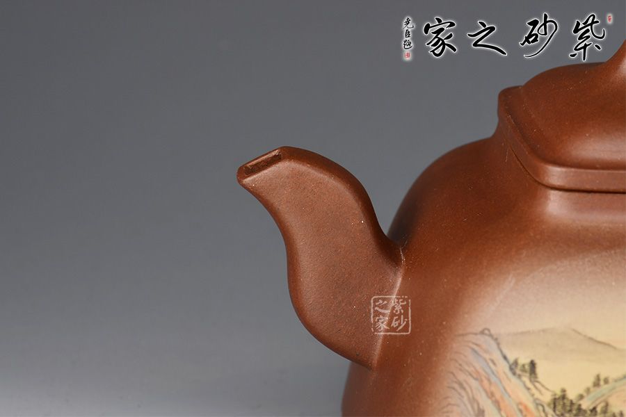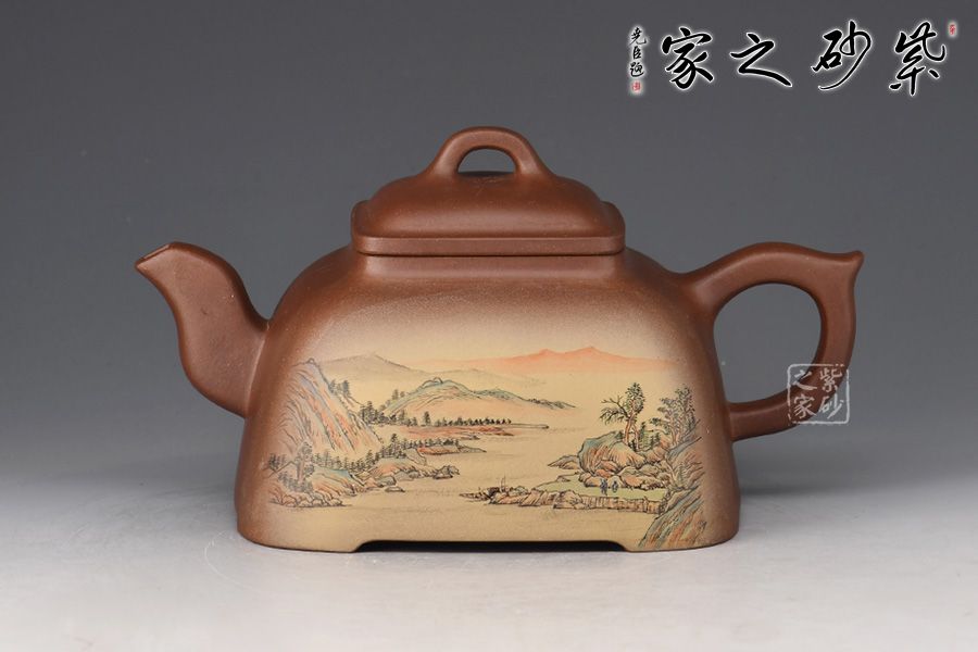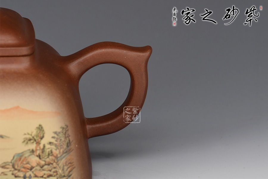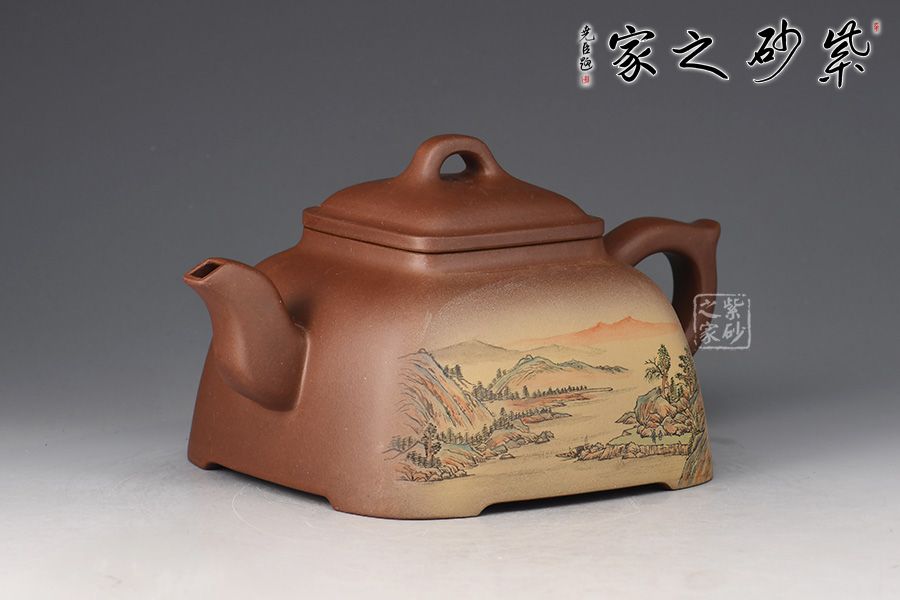 此壺呈方形,四角圓轉(zhuǎn),上小下大,穩(wěn)重如山,古樸挺括。俯視呈四方形,側(cè)面看又有覆斗狀,但又不是直棱角的覆斗,像兩條斜邊向外彎曲的梯形。蓋、頸是小四方。作品將方器的精髓都表現(xiàn)得淋離盡致,整器輪廓線條飽滿,方中見秀。壺身彩繪裝飾,山水之景,意境不凡。