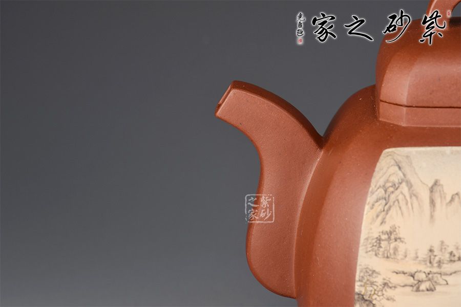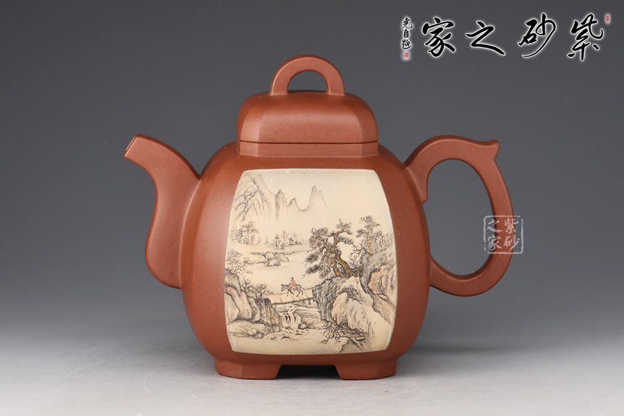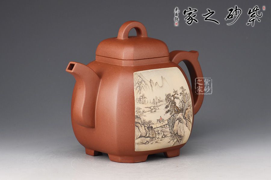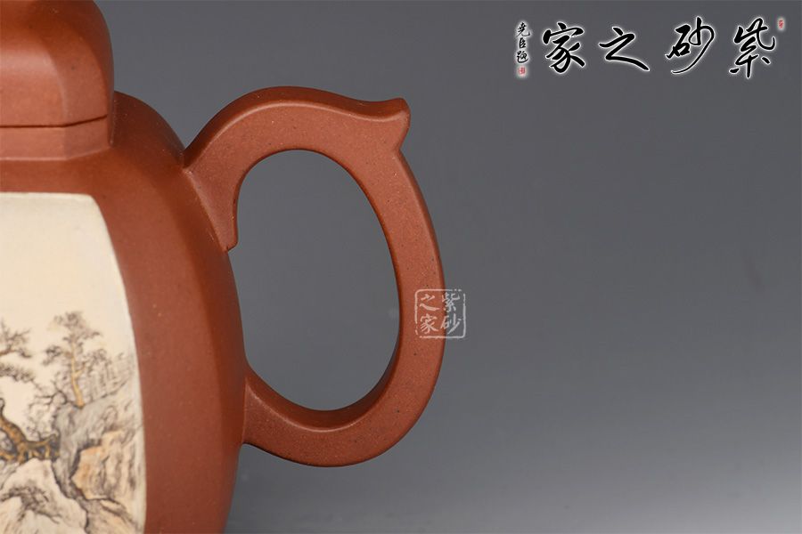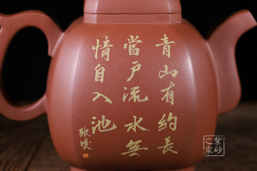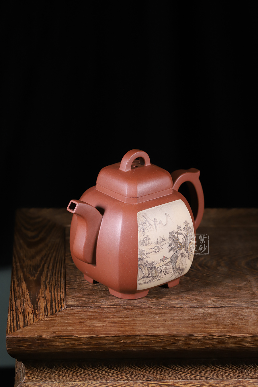 壺型為經(jīng)典福臨八方,壺體由八面相接成型,塊面挺括,線條自橋鈕貫通至壺底四足,簡潔利落。壺流大度,壺柄流暢,線條收勢干凈利落,穩(wěn)重端莊。壺體正面彩繪山水風(fēng)景,反面陶刻詩詞“青山有約長當(dāng)戶,流水無情自入池,推薦收藏!