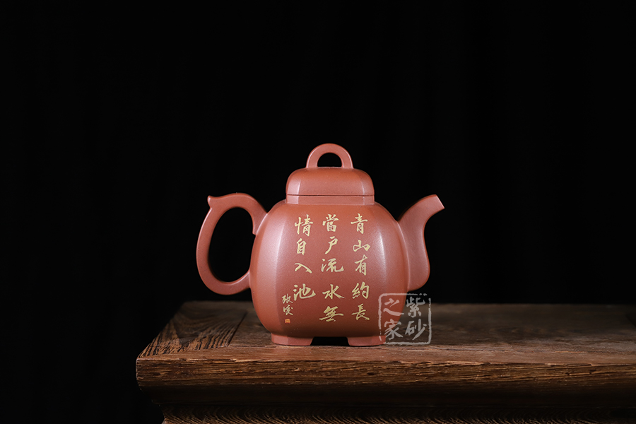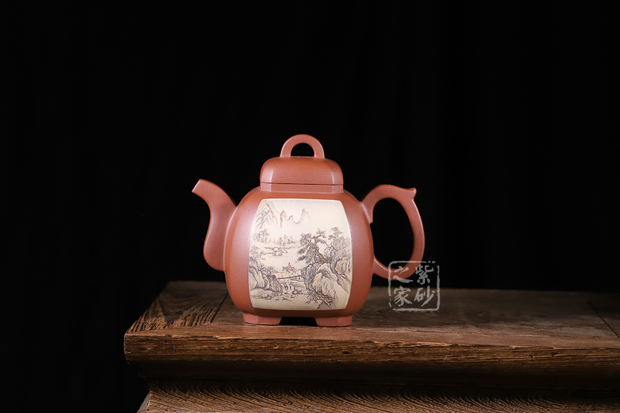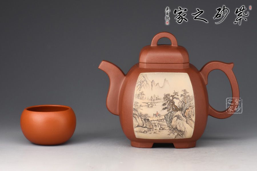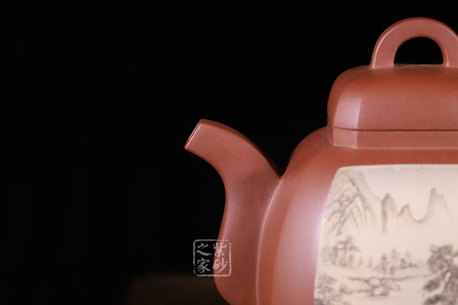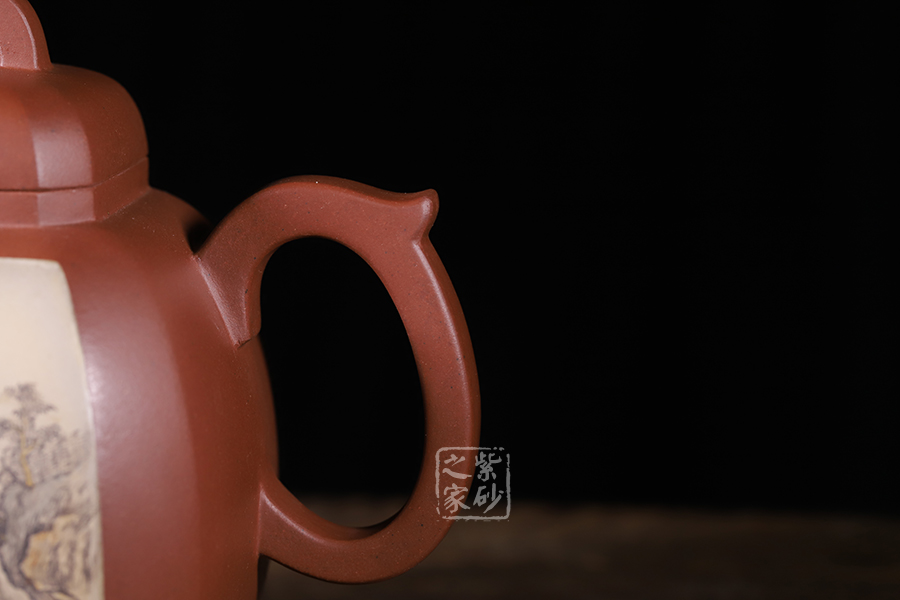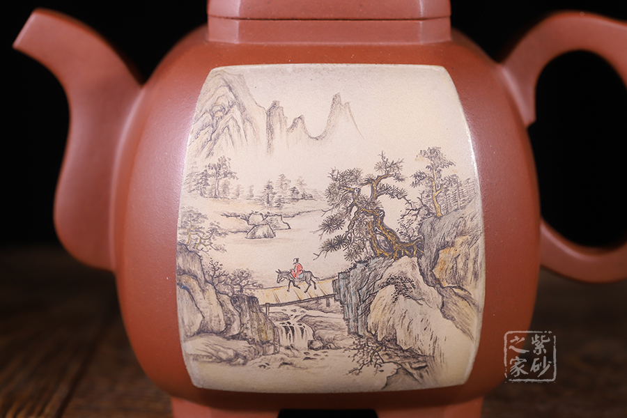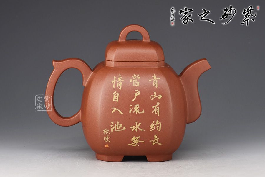 壺型為經(jīng)典福臨八方,壺體由八面相接成型,塊面挺括,線條自橋鈕貫通至壺底四足,簡潔利落。壺流大度,壺柄流暢,線條收勢干凈利落,穩(wěn)重端莊。壺體正面彩繪山水風(fēng)景,反面陶刻詩詞“青山有約長當(dāng)戶,流水無情自入池,推薦收藏!