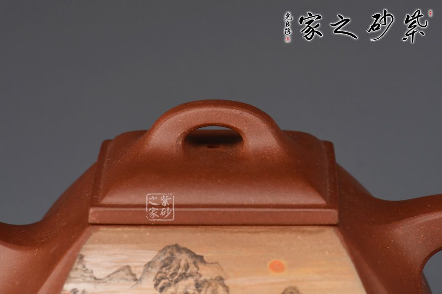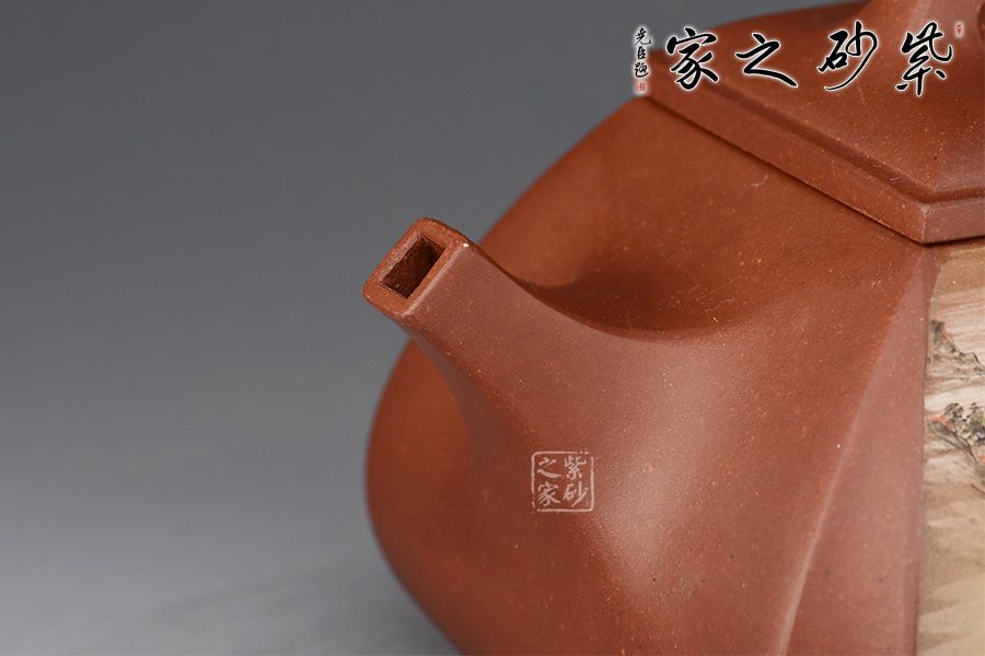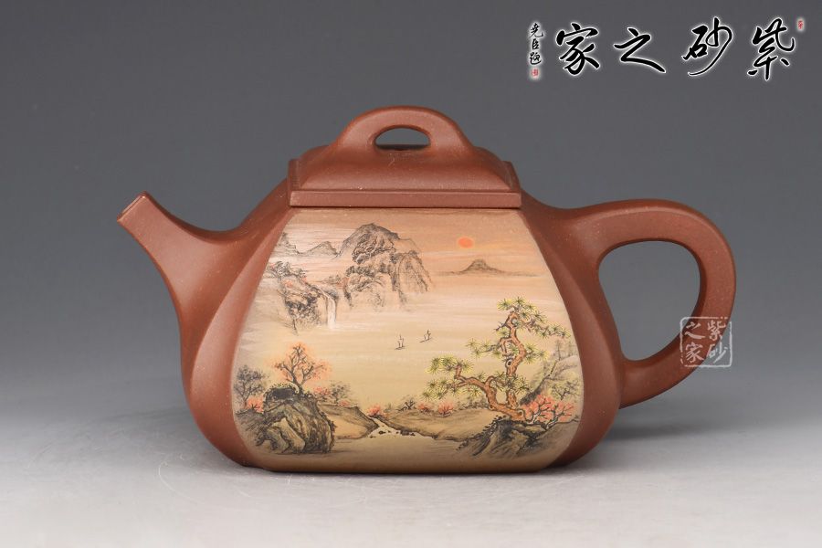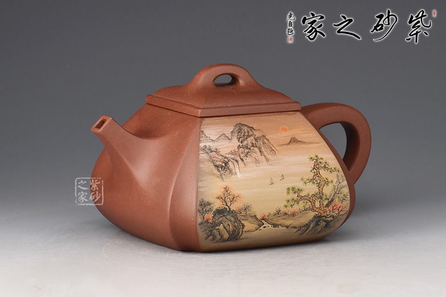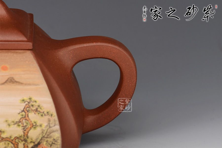 抽角石瓢精選原礦底槽清制作而成,由石瓢改良而來,所謂方非一式,圓不相一,此款器型便是更好的詮釋了方與圓的精美藝術(shù),作品剛?cè)嵯酀蟹狡鞯膭傉χ保灿袌A器的順暢和柔和,抽角均勻有致,線條均勻挺括,整個壺身方圓結(jié)合,四方壺蓋,棱角圓潤,橋形鈕溫婉而出,古樸俊逸,直流嘴方形逐漸胥出,外方內(nèi)圓,出水順暢。壺身彩繪裝飾,山水之景,意境不凡。