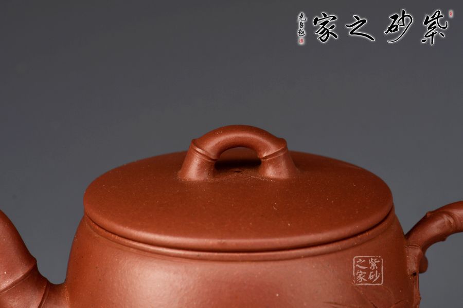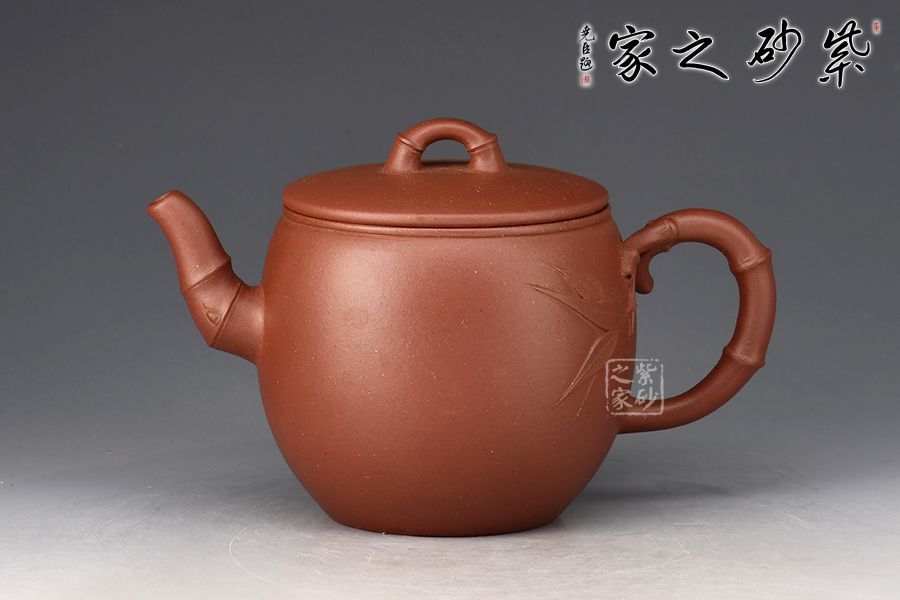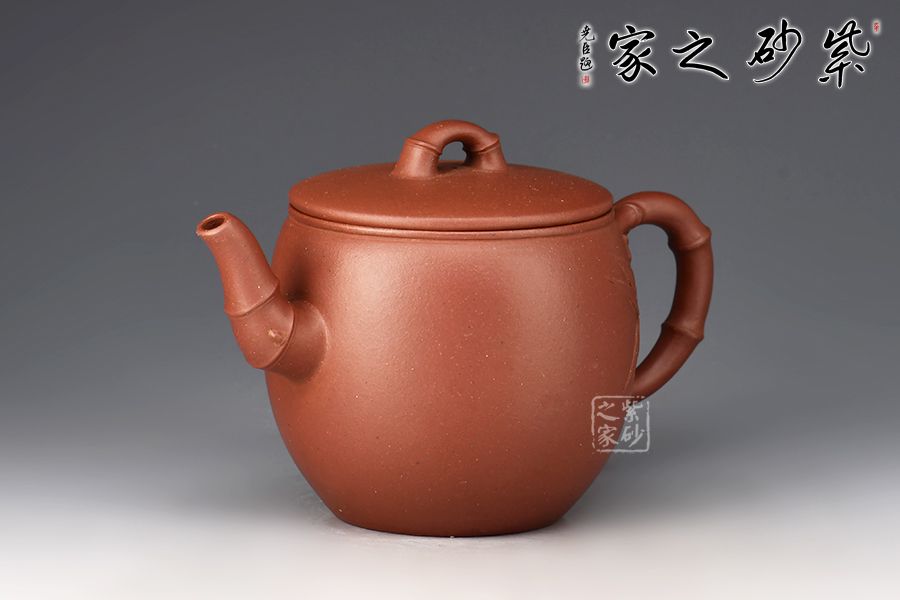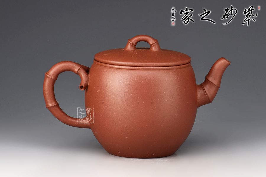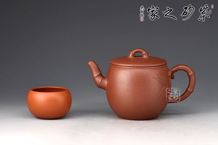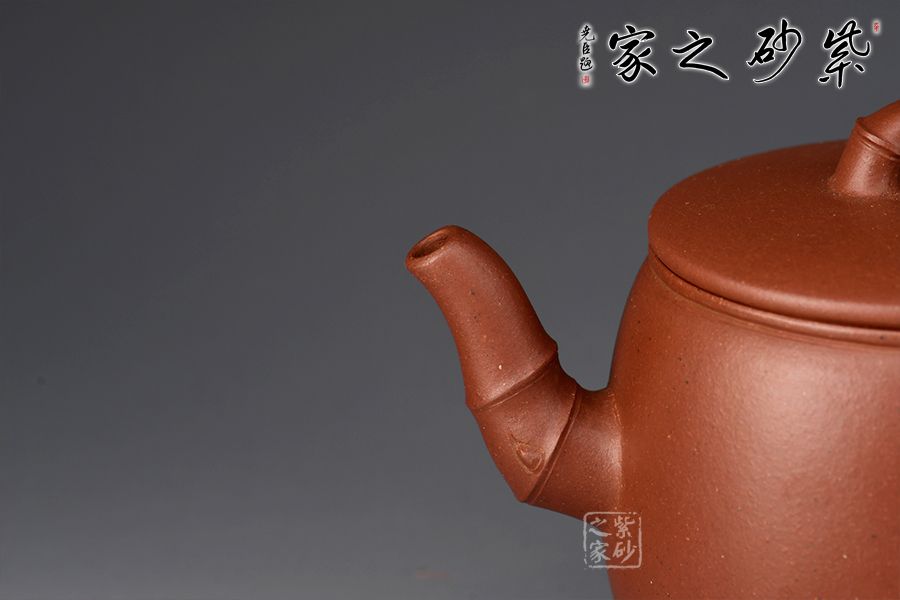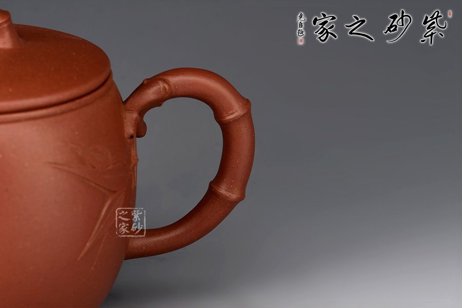 此壺乃老師全手工拍打而成,橋鈕、三彎嘴、耳把,柱形身筒,整款壺渾然的大氣讓人無法抗拒,同時,壺身貼以竹葉,增添飄逸之感。愈觀之,愈覺有味。