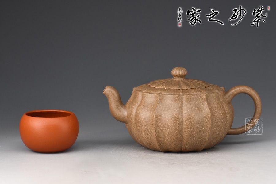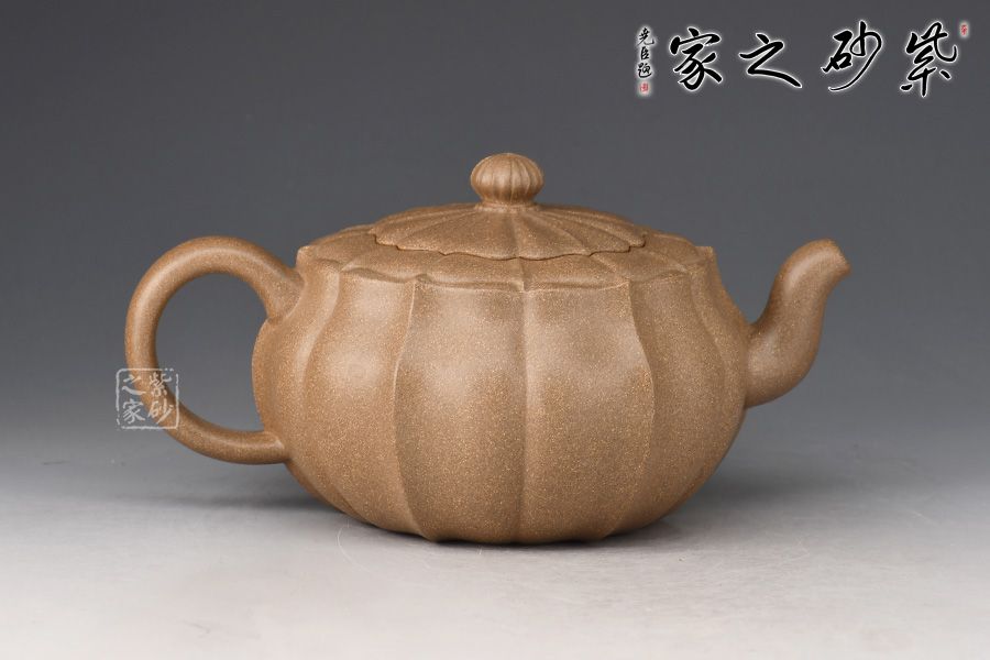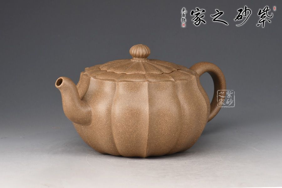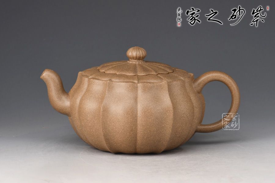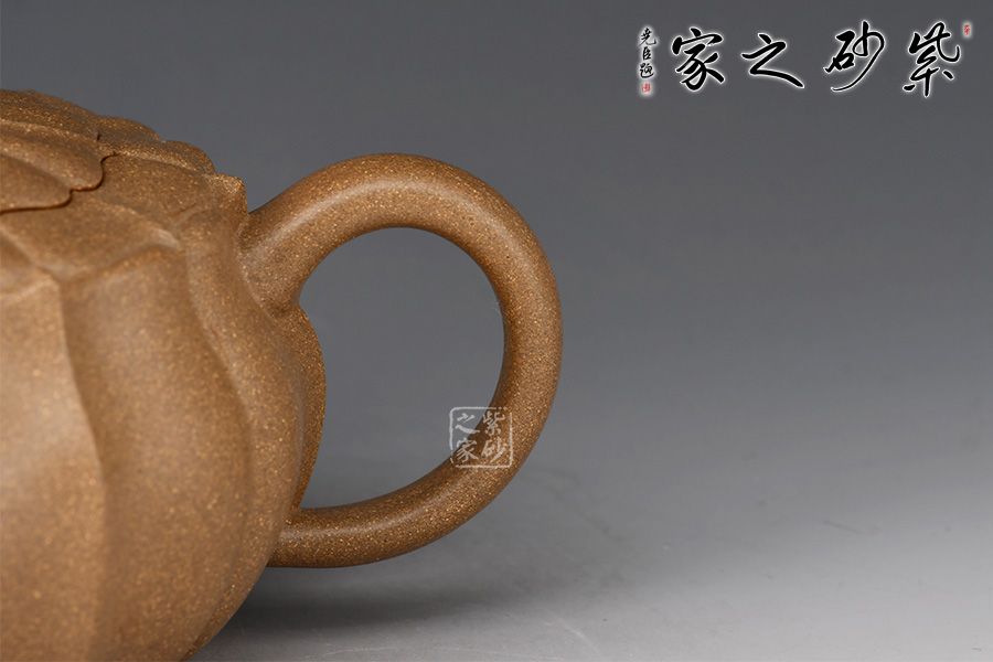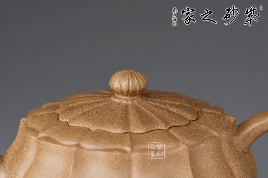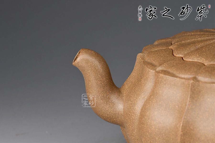 此壺選用青灰泥精制而成,泥質(zhì)細(xì)膩。壺型如宮燈,壺身飽滿,采用筋紋裝飾,至壺底收斂。嵌蓋設(shè)計,嚴(yán)絲合縫,壺鈕似花苞,小巧可愛。三彎壺流與耳把胥出自然,將曼妙、精致之美發(fā)揮地淋漓盡致!