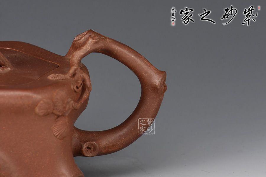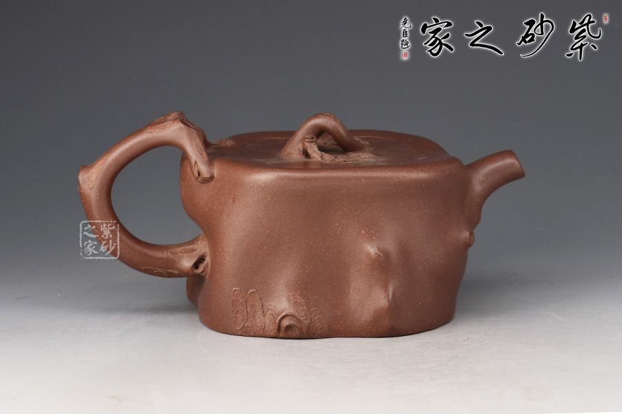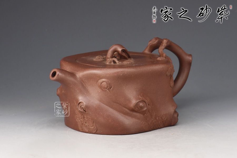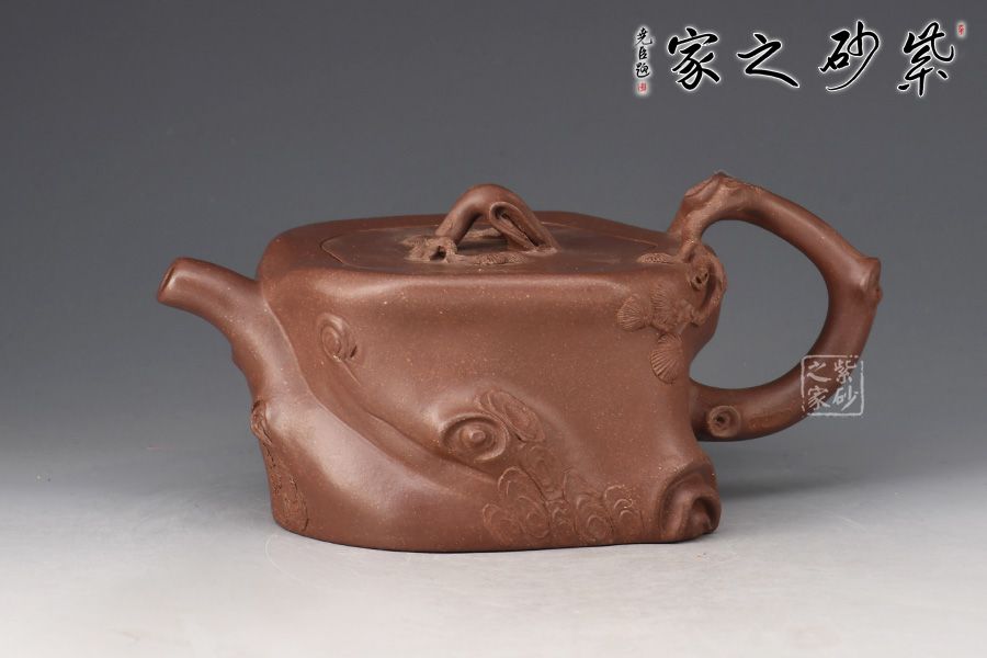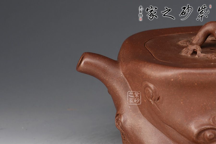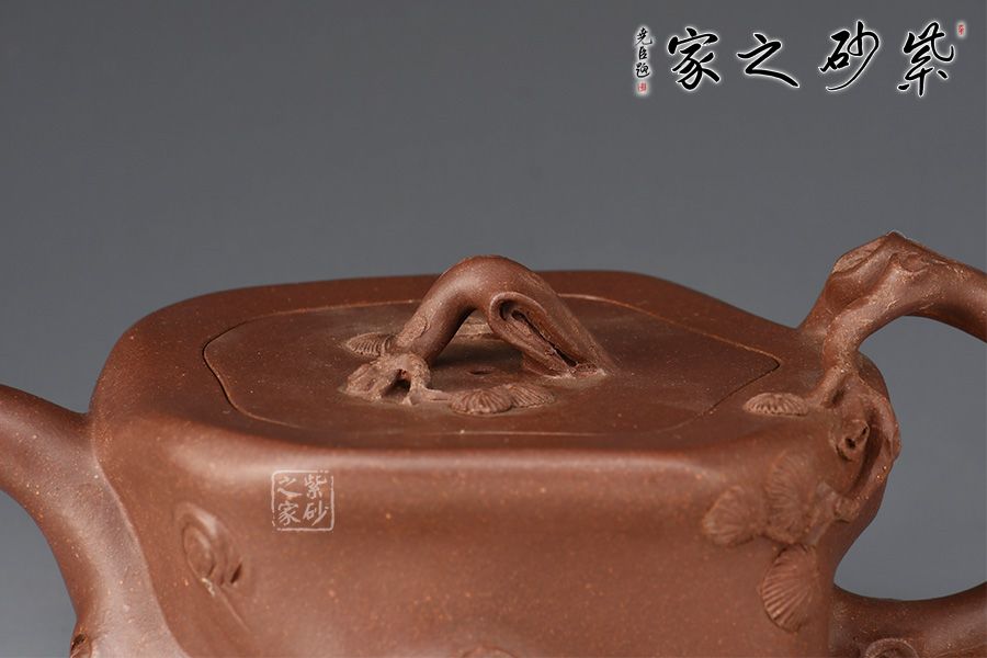 此壺造型為一截松段,壺身正面塑以一條如溝壑般的紋理,并將四周樹皮斑駁的紋理展現(xiàn)了出來。鈕、流、把皆做松樹枝節(jié),結構嚴謹,比例合理,搭配的恰到好處,壺鈕更是巧取松節(jié)一段,似與流、把相連,并以松針裝飾。