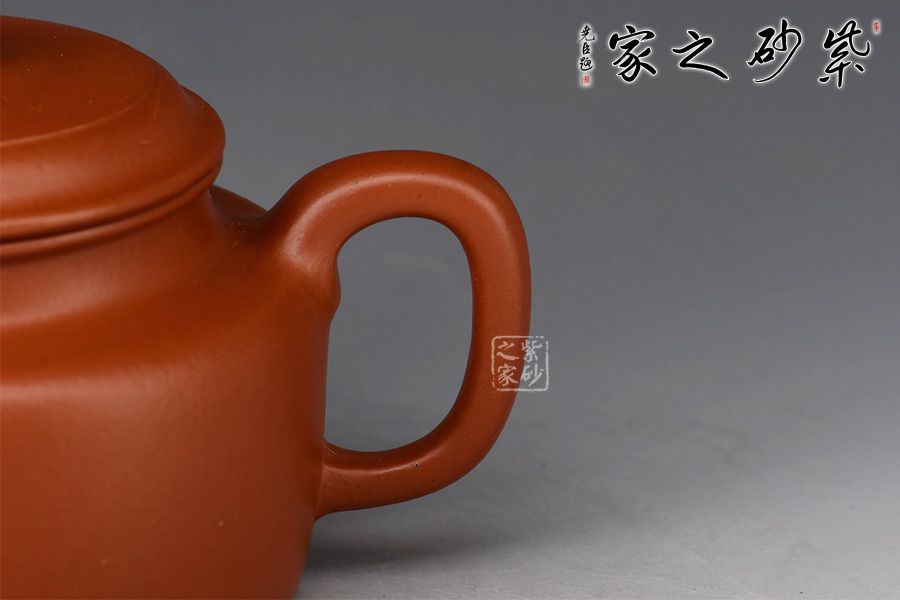此壺以原礦朱泥作胎,取自經典器型德鐘壺,造型端莊穩(wěn)重。壺身呈短柱形,壺鈕與之應和,壺蓋隆起,蓋線清晰,簡單的點綴襯托出不簡單的氣質。直流宛如一把出鞘之寶劍,挺拔胥出,威風凜凜,出水爽利。耳形把渾然有力,疏朗大氣,搭配得恰到好處。整壺結構嚴謹,比例精湛,莊重儒雅,氣韻高逸,220cc實用性強,充分展現出光素器的獨有美學。