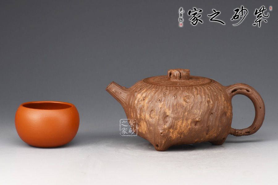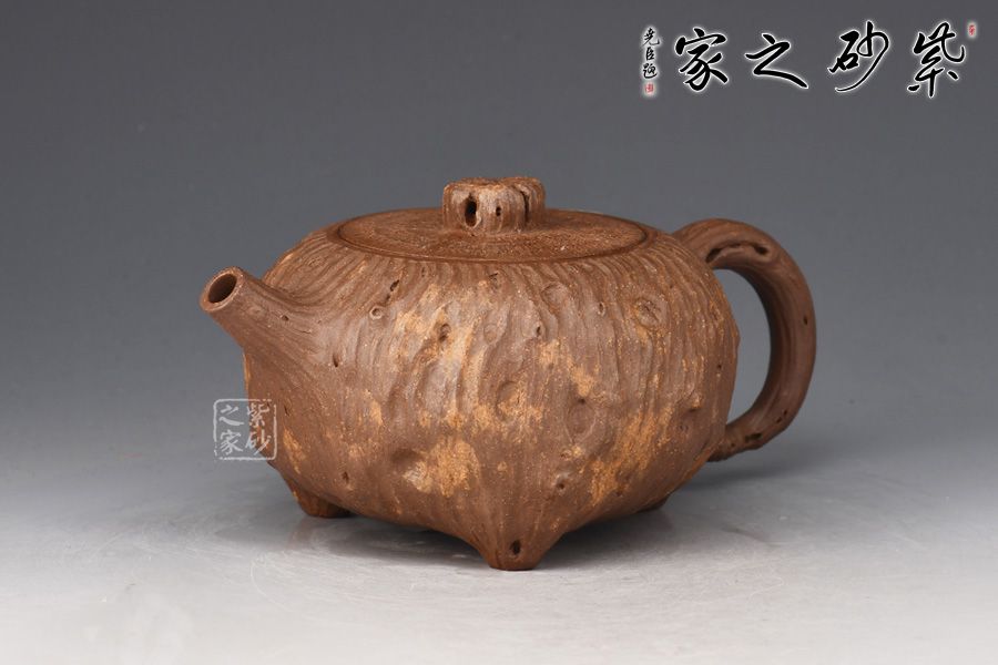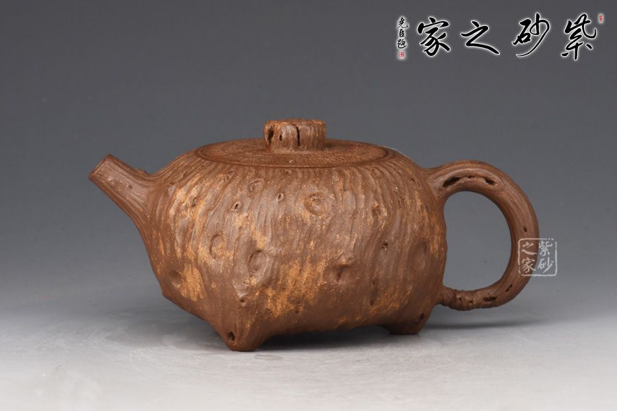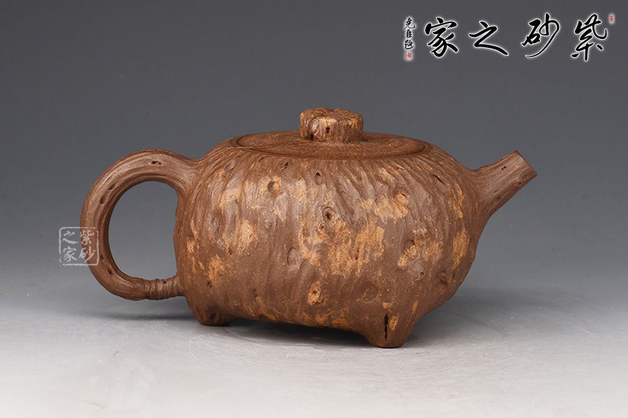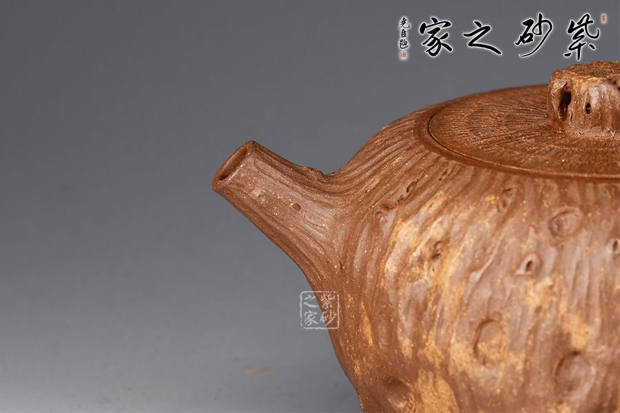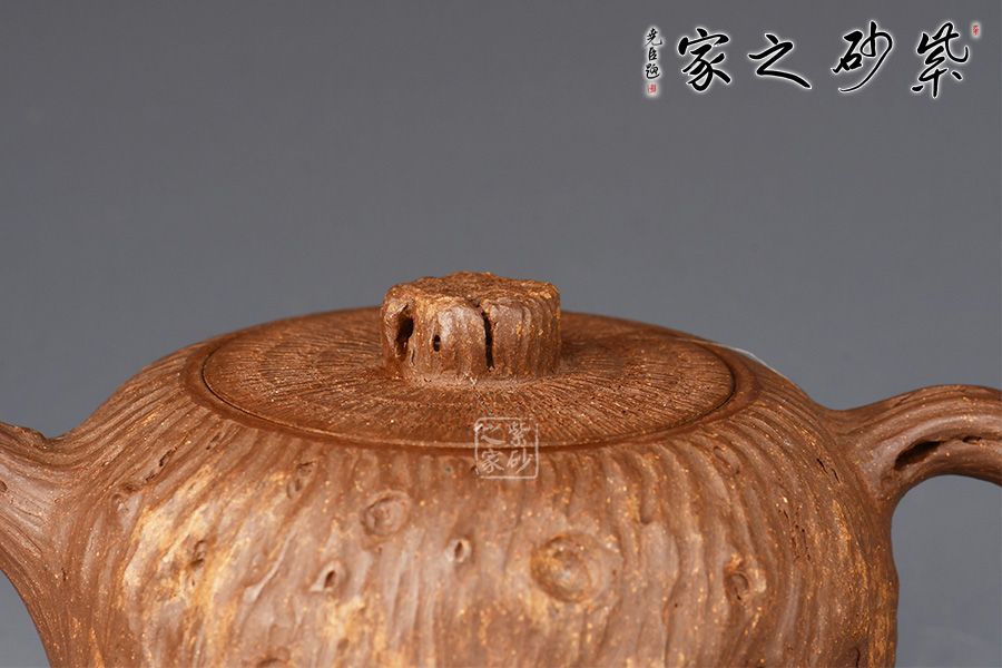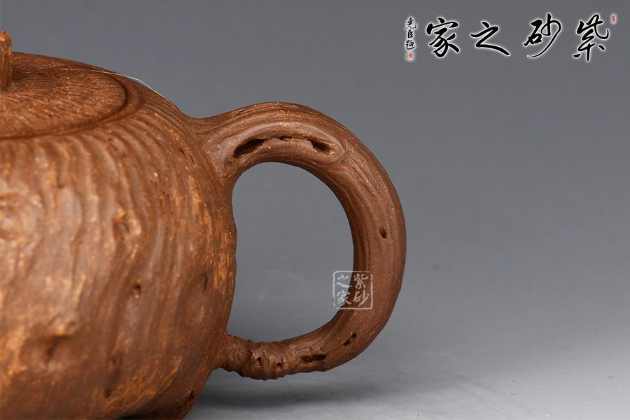 靈根壺為老師專利金獎(jiǎng)作品,整壺以一截老樹(shù)根為形制,造型古樸精工,溫雅天然。泥質(zhì)成素色,純薄堅(jiān)實(shí)。壺身作扁球形,凹凸不平,榖縐滿身,紋理繚繞,寓象物于未識(shí)之中,大有返璞歸真之意境。