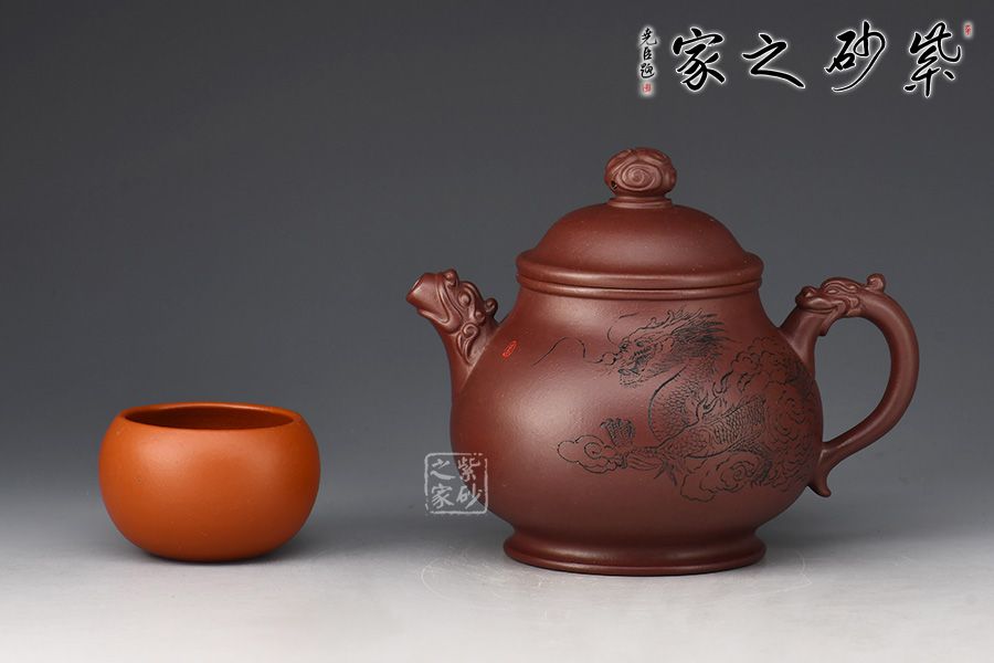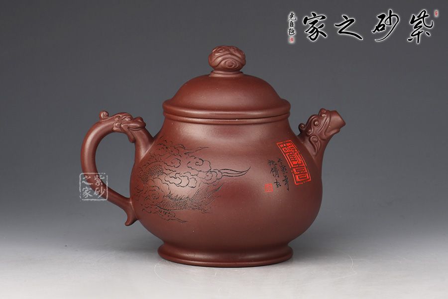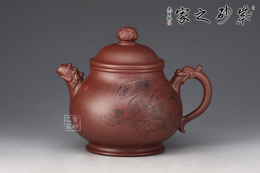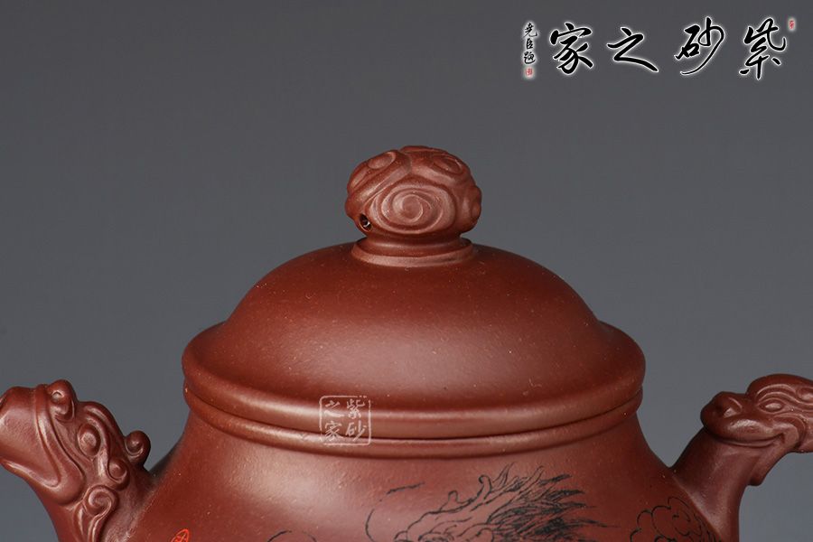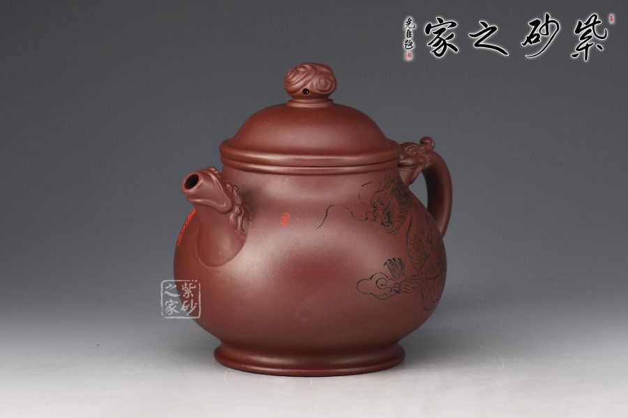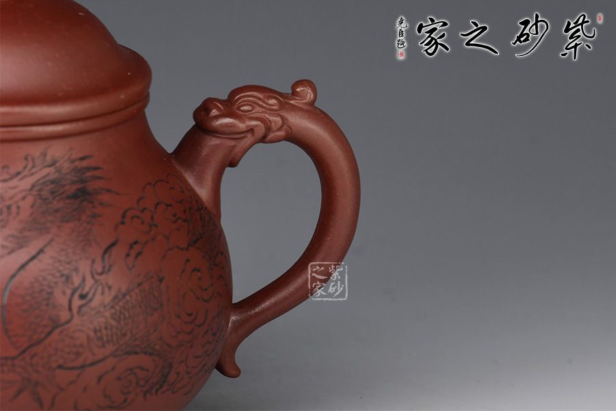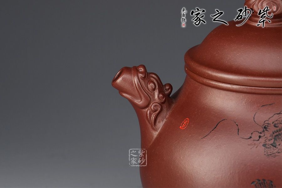 此壺精選紫泥為胎,老師全手工精制而成。摹古經(jīng)典而具創(chuàng)新之意,壺身略高呈高梨形,上斂下豐,壺腹圓潤(rùn),寬厚能容,而氣質(zhì)沉穩(wěn)。此壺耳把和壺嘴均以龍頭堆繪裝飾,圈足龍珠形鈕,整體配合自然,點(diǎn)、線、面結(jié)合融襯,壺身各部比例協(xié)調(diào)一致,勻稱流暢。