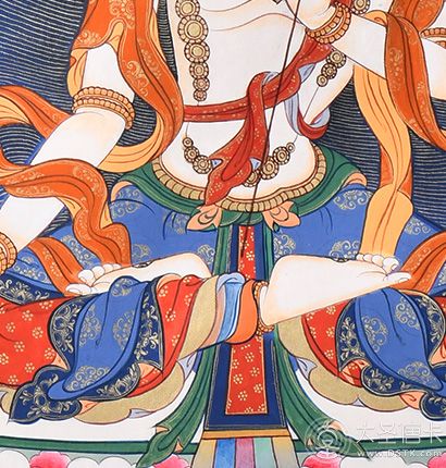 在繪制佛像服飾等位置時,用刻金技法,使圖案更具豐富的層次和立體感,用金勾勒的線條和圖案不但明亮度進一步提高,讓畫面更加燦爛,而且也使金在畫面上保持得更加長久。