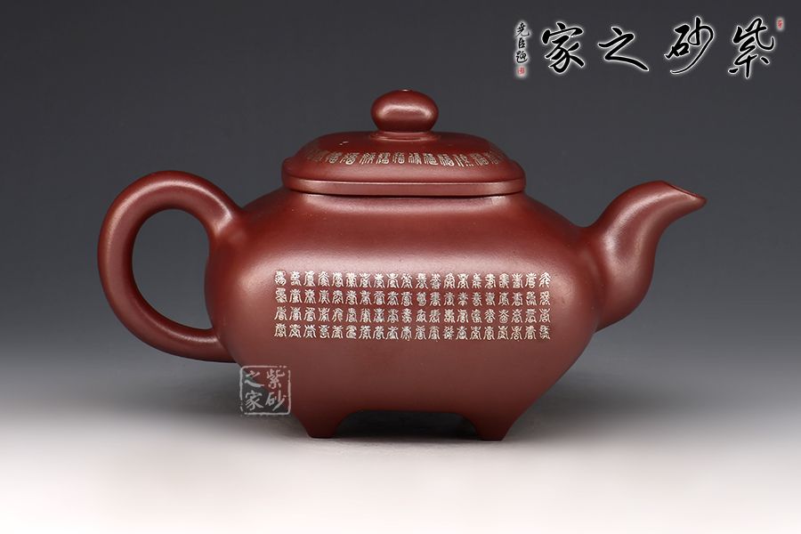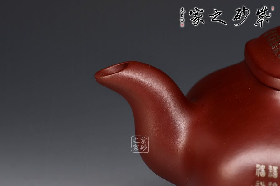 傳爐是經(jīng)典的方器造型,其制造型取材于青銅器,器身形狀以方器為基本型,但方中寓圓,比一般方器多了一份圓潤之美。彎流壺嘴曲折有致,出水流暢;壺蓋制作精良,面面俱到。此壺敦厚樸實(shí),風(fēng)格雅致,隱隱有古風(fēng)韻。