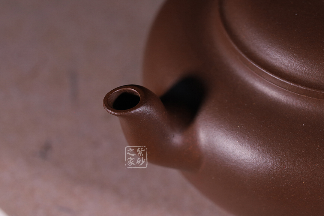 此扁櫻壺氣韻自然大方,壓蓋和壺口嚴(yán)密結(jié)合,弧度齊整;壺肩到壺身處有一梯度轉(zhuǎn)接;壺體端莊古樸,線條優(yōu)美流暢;壺嘴彎流,出水好; 壺把從壺身飛出,耳形向上飛揚(yáng),整壺壺身較大,增添了整個(gè)壺的穩(wěn)重之感。