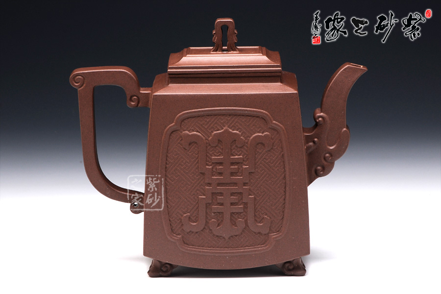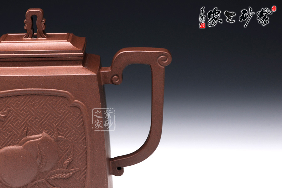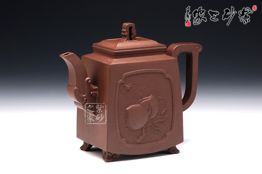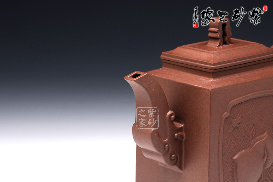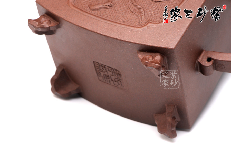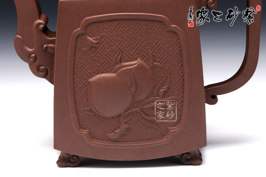 壺身呈四方形,并以四如意足鼎立之姿呈現(xiàn),更顯穩(wěn)重敦厚,彰顯大氣風(fēng)范。壺身兩面皆采用獨特的開光裝飾工藝及絞泥裝飾手段繪制不同的圖案紋飾及雕刻,從而達到了一種別樣的藝術(shù)效果。