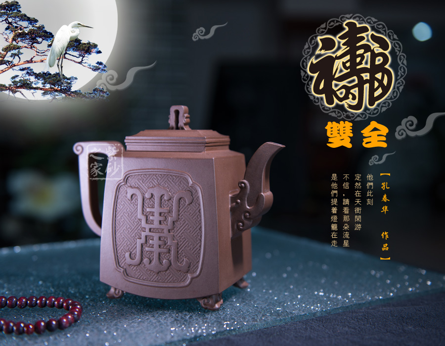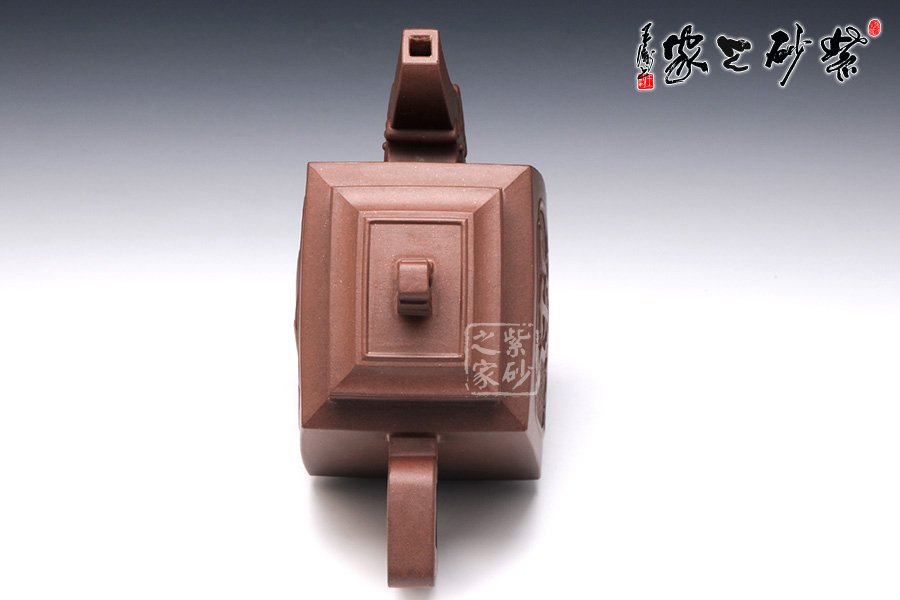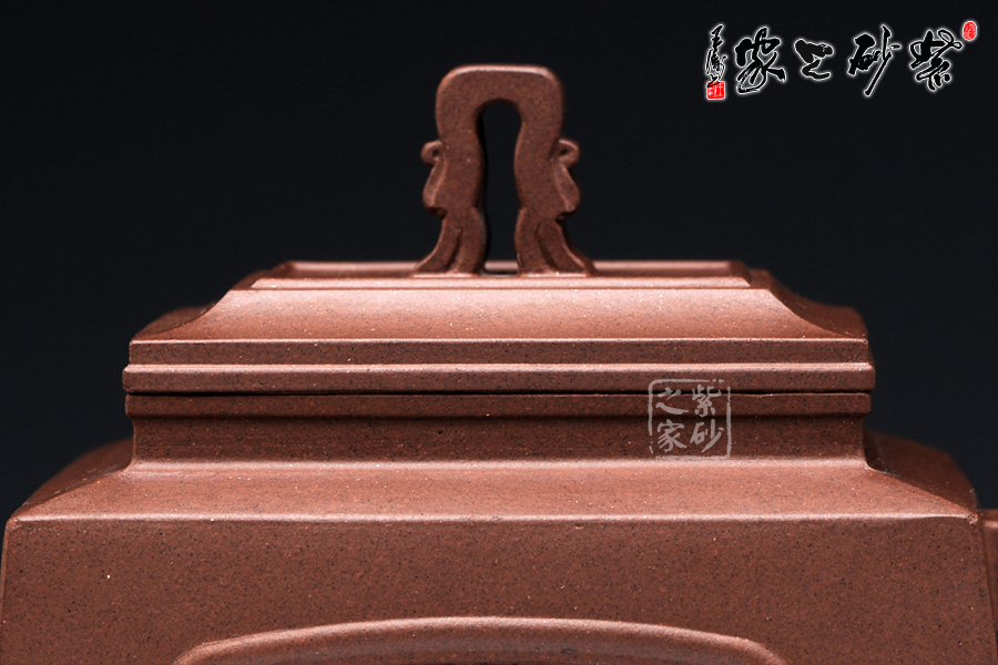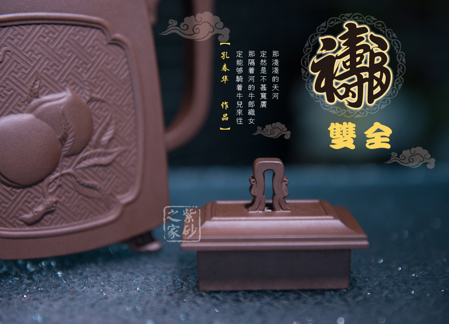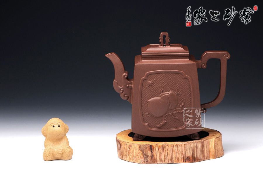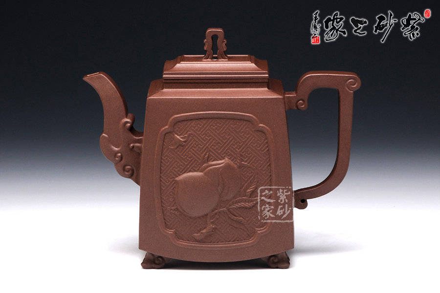 壺身呈四方形,并以四如意足鼎立之姿呈現(xiàn),更顯穩(wěn)重敦厚,彰顯大氣風(fēng)范。壺身兩面皆采用獨特的開光裝飾工藝及絞泥裝飾手段繪制不同的圖案紋飾及雕刻,從而達到了一種別樣的藝術(shù)效果。