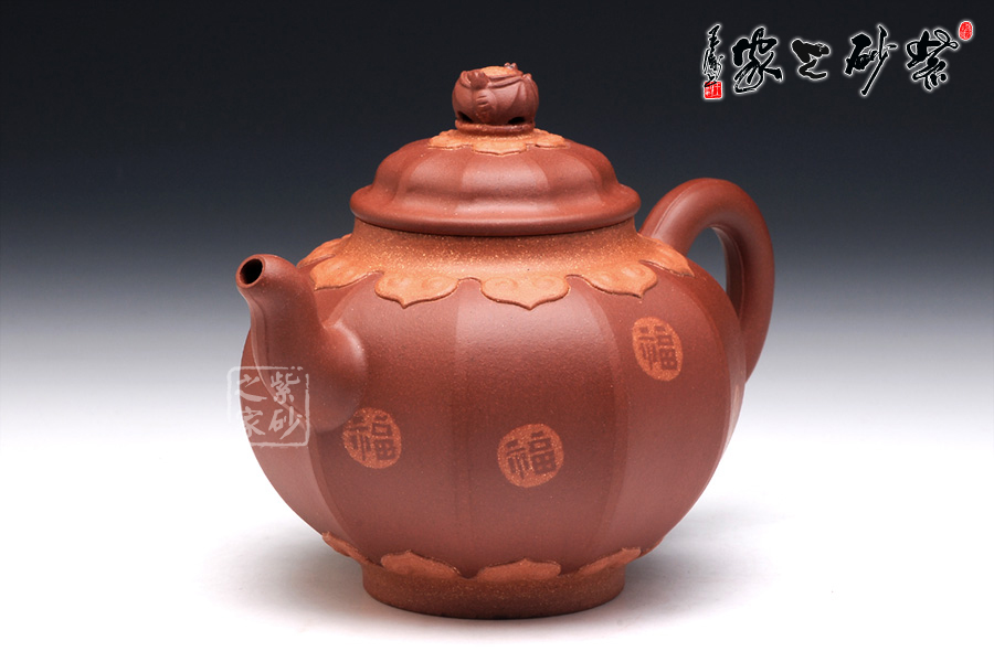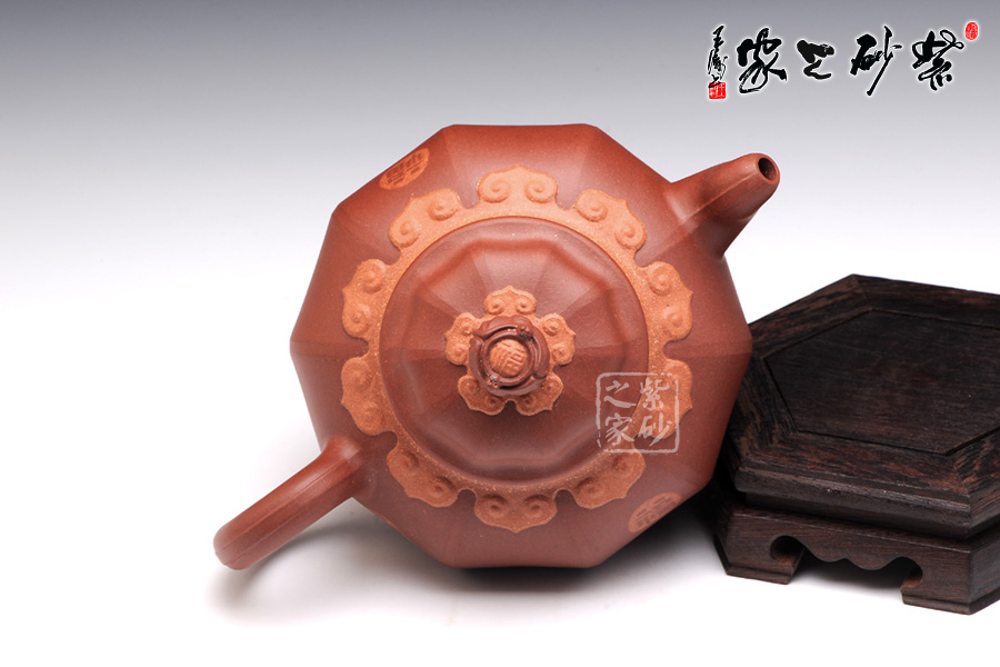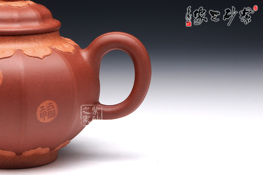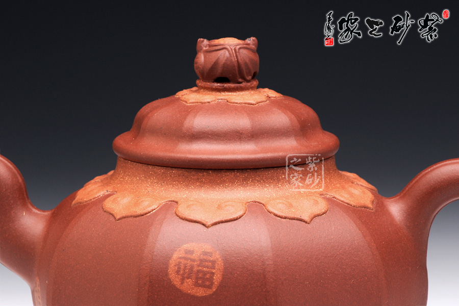 暗接三流彎自然胥出,線條柔美順滑,出、斷水皆明快利落。耳形圈把上揚(yáng),與壺嘴成對(duì)應(yīng)之勢(shì),端握把拿十分舒適襯手。嵌蓋設(shè)計(jì)。口蓋子母線咬合緊密,好似壺身的縮小版,與壺身仿佛一氣呵成,雙蝠形壺鈕四周同樣飾以如意云紋裝飾,而蝠與福同意,壺身的大紅燈籠又是祥和如意的象征。
