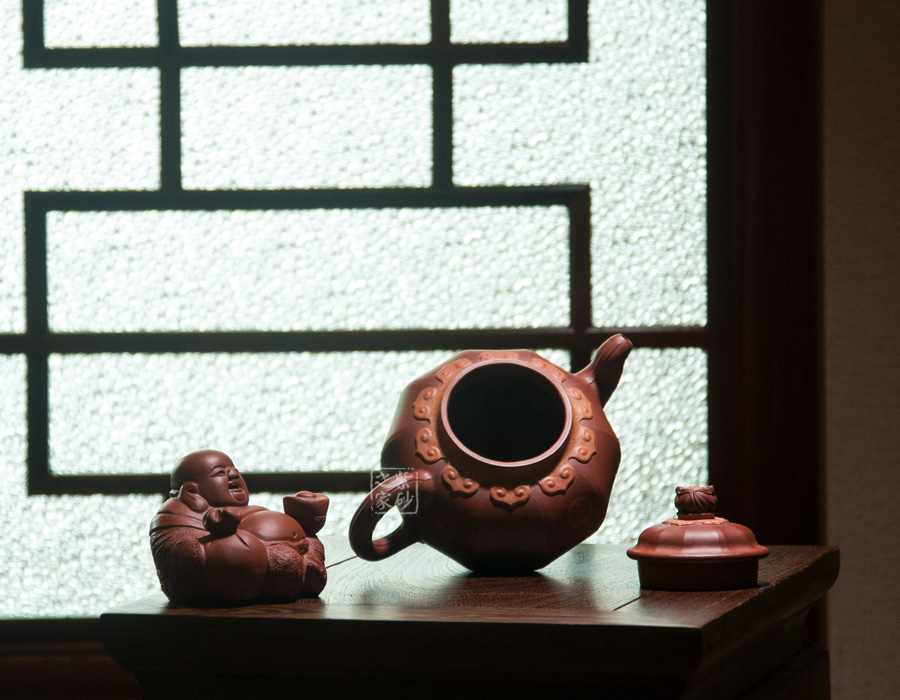 其外觀器型精致典雅,大紅燈籠形壺身不僅極具美感,而且給人一種喜慶的味道。該壺名為福星高照,將中國傳統(tǒng)文化與紫砂壺藝相融合,整個(gè)作品傳遞出一種幸福、美滿與歡快的內(nèi)涵精神。