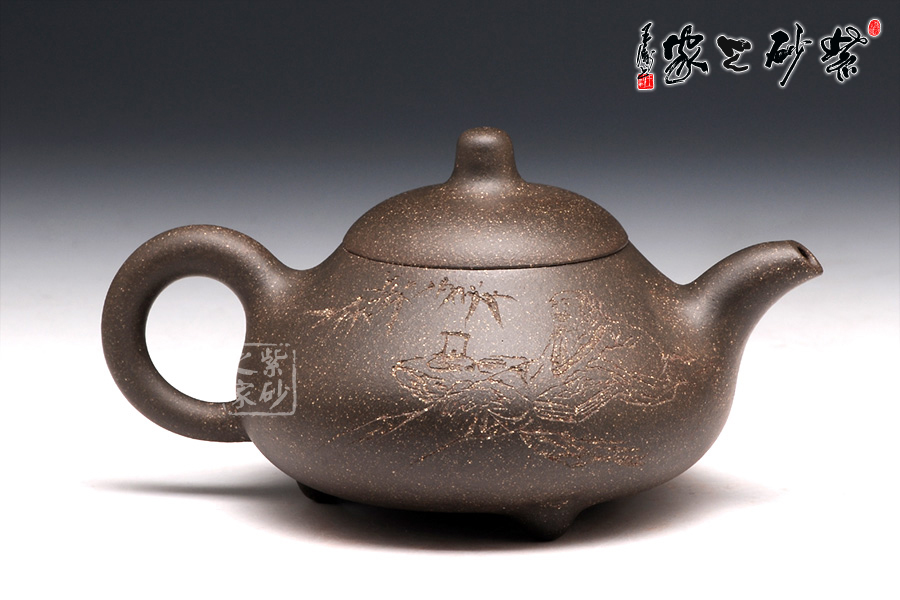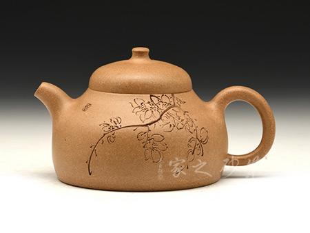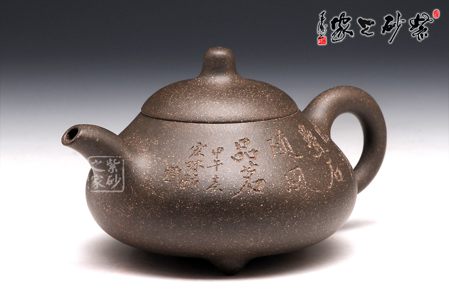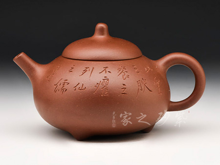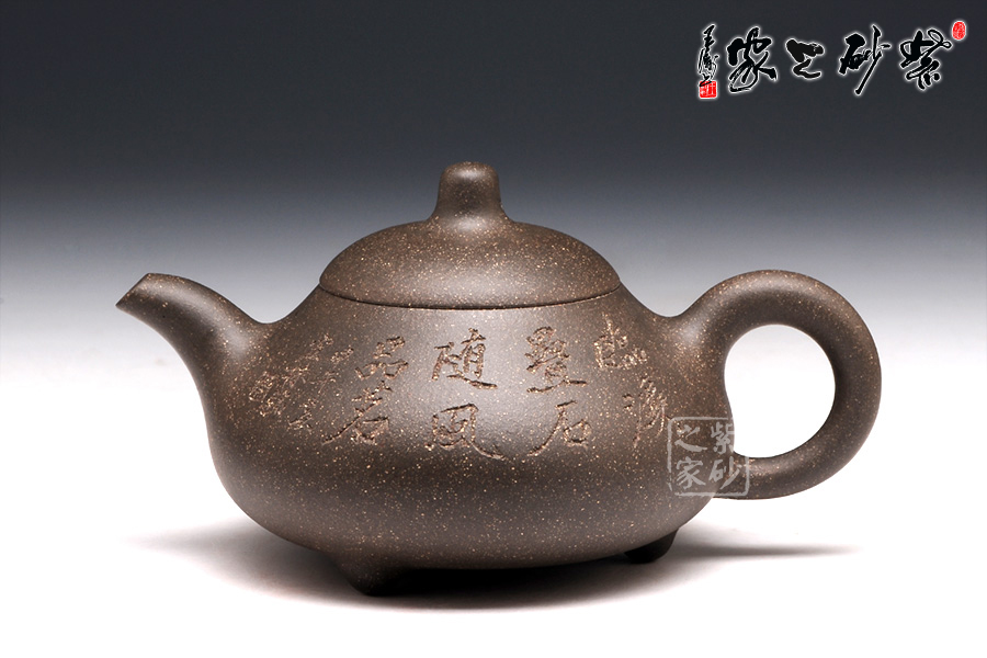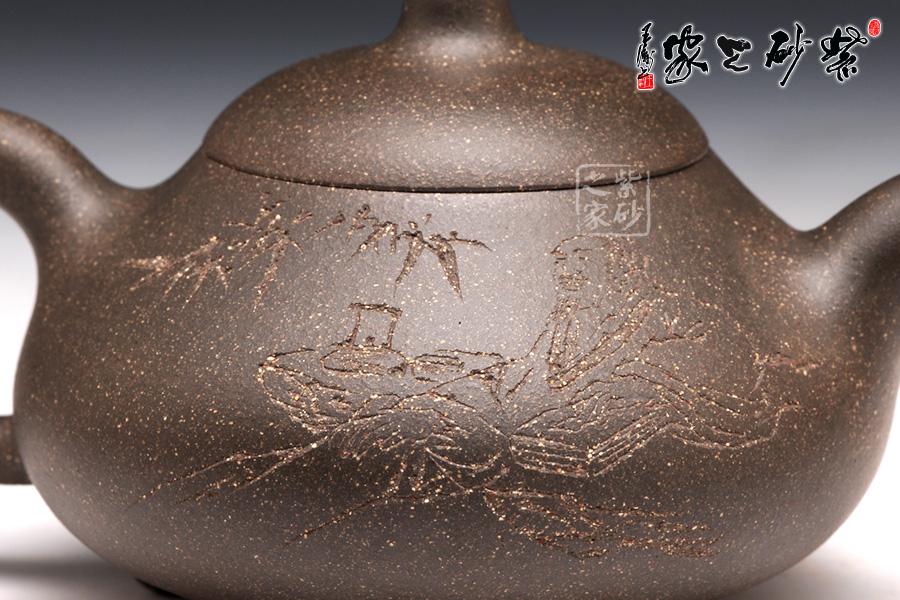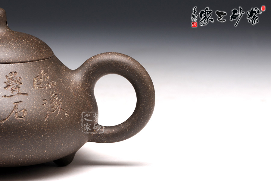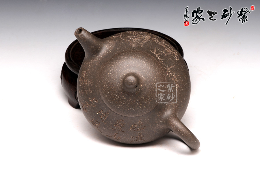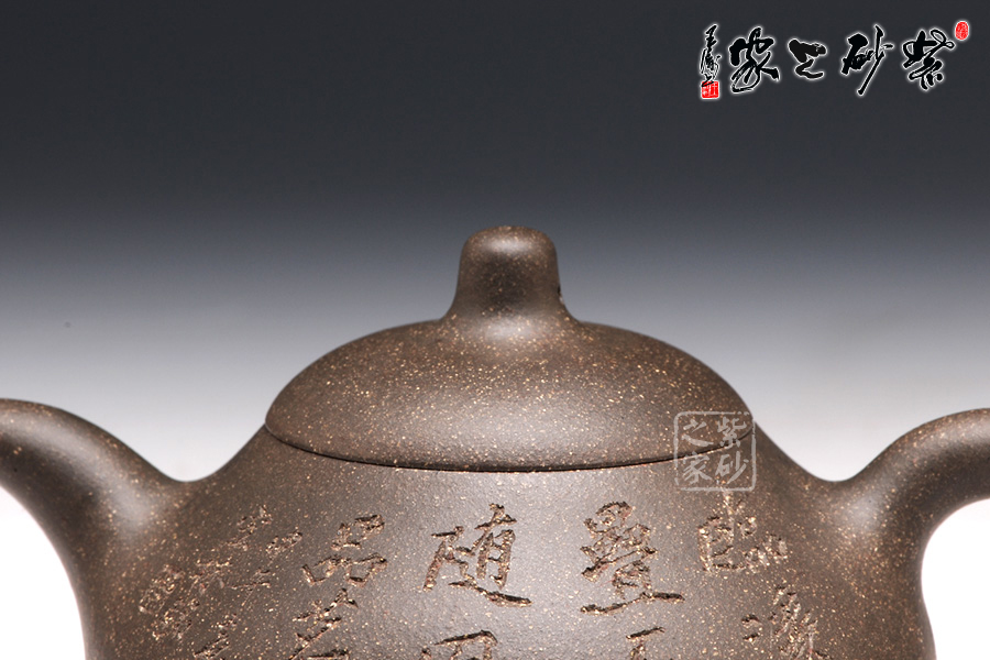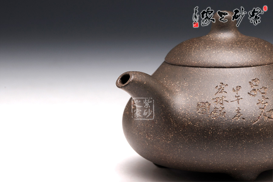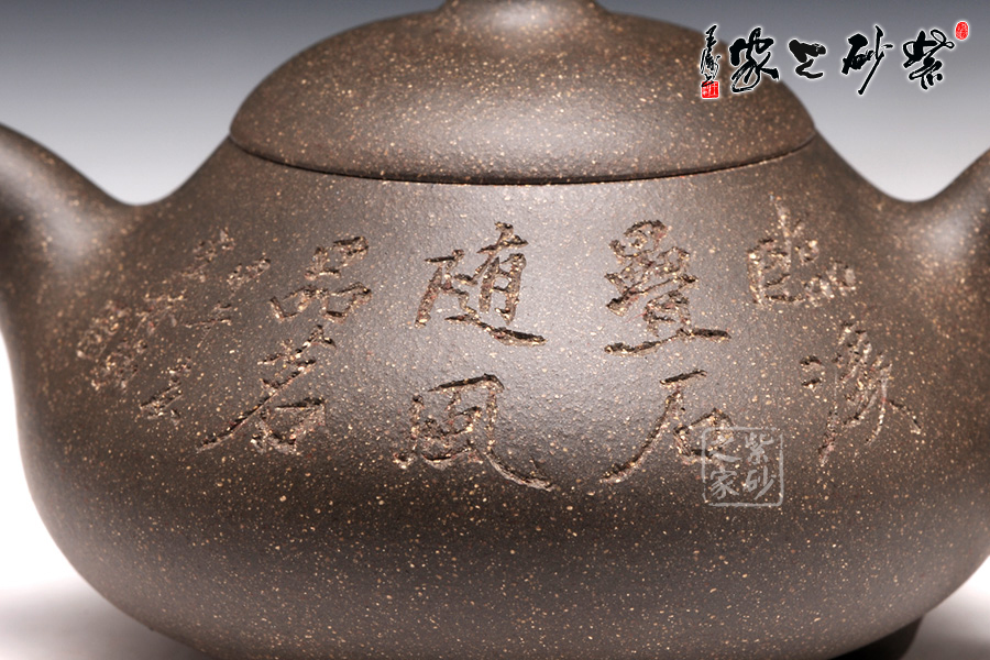 此壺蘊(yùn)含深厚的文化底蘊(yùn),以流暢造型、色澤明麗而顯華美高雅;壺身銘文寓意深遠(yuǎn),乃文人壺之代表,賞其風(fēng)格可曰“纖秾”,細(xì)膩纖秀而格調(diào)明朗,濃郁華美而 清新流暢。此壺形態(tài)從容,蘊(yùn)含天機(jī),其砂質(zhì)粗糙,顆粒感十足。