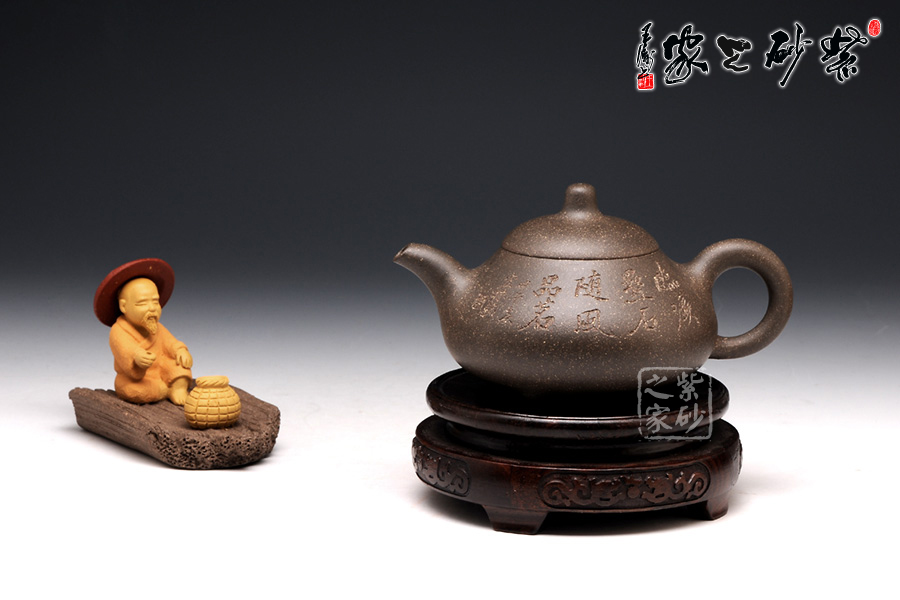刻繪的的詩句“臨溪疊石,隨風(fēng)品茗”展現(xiàn)了與壺型相符的追求和情趣,另一面居士品茗讀書,情趣怡人。