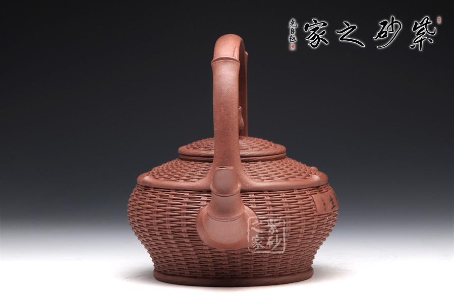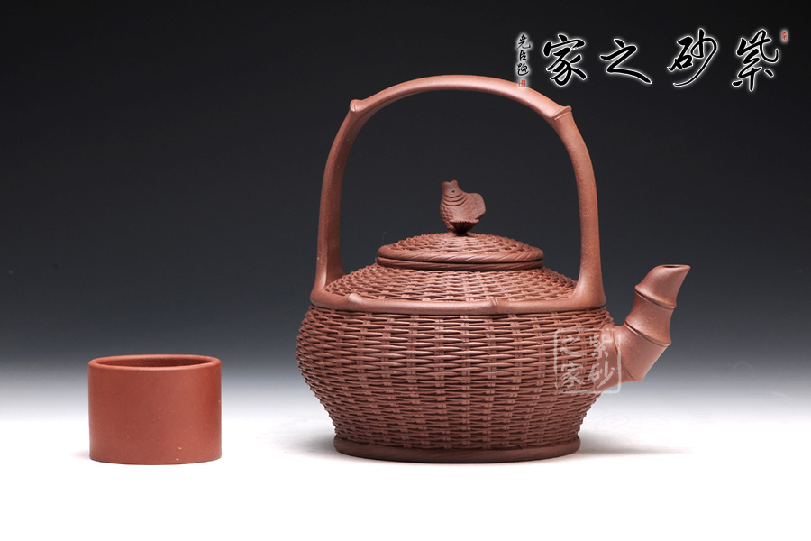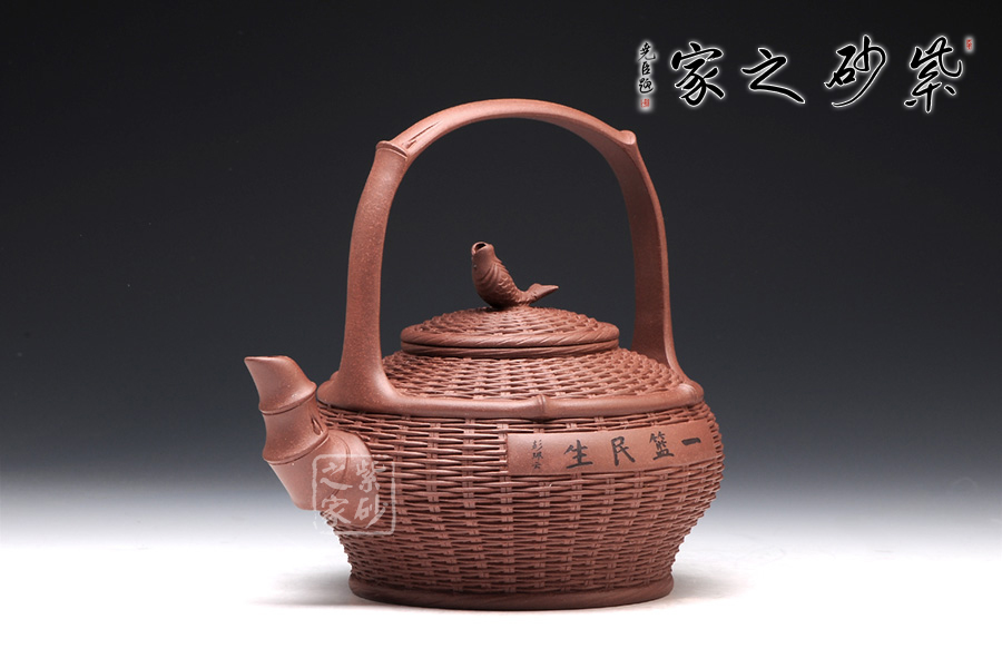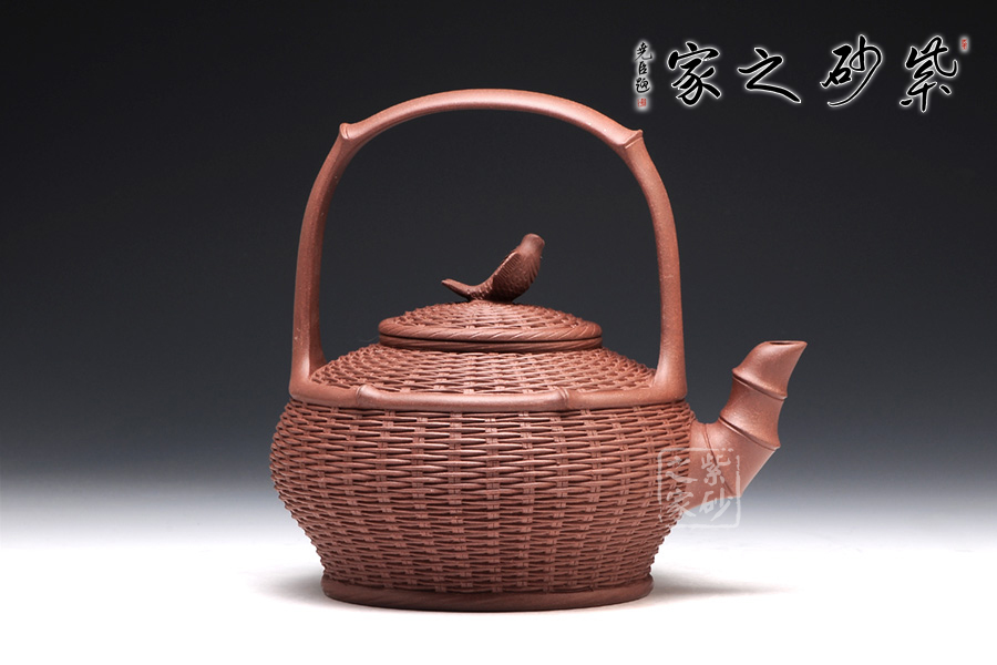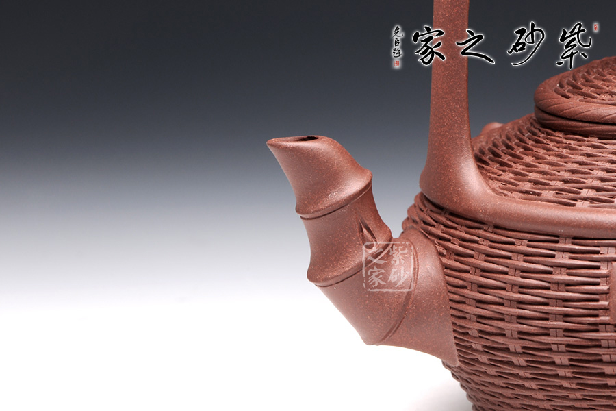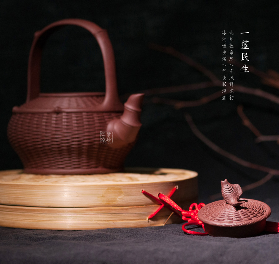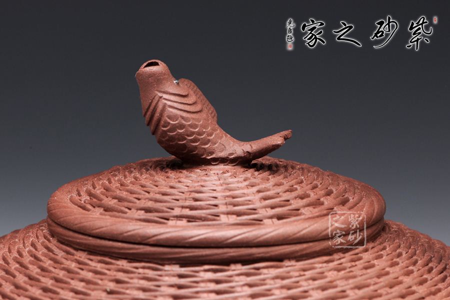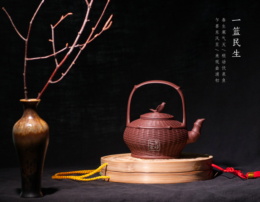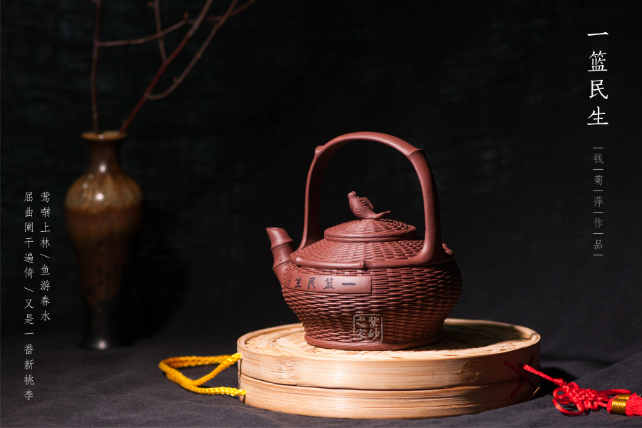 以竹籃為壺型,紋理細膩繁密,竹編層疊而上,與竹籃的實物不相上下。壺蓋與壺身對接工整,壺鈕卻是一條魚,寓意年年有余,是民生的樸實愿望。彎流壺嘴是竹節(jié)形態(tài),曲折自然,竹節(jié)生動。提梁把大氣簡潔,力道十足。