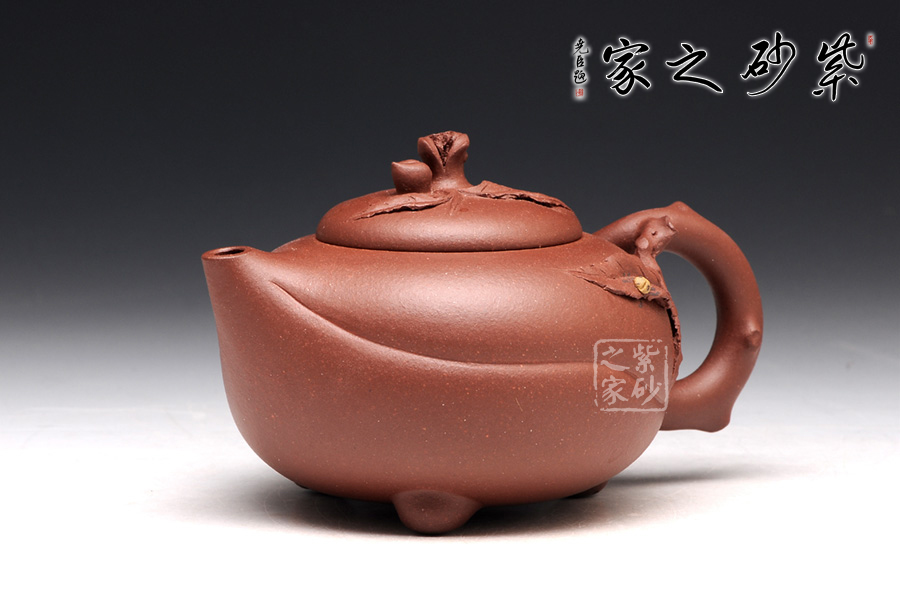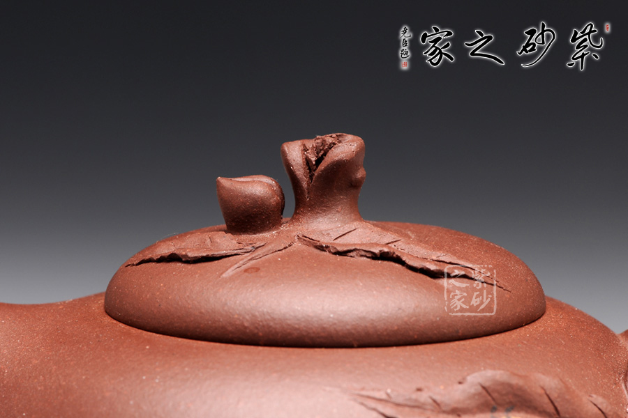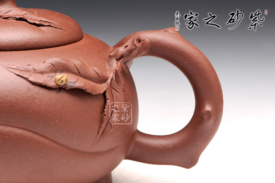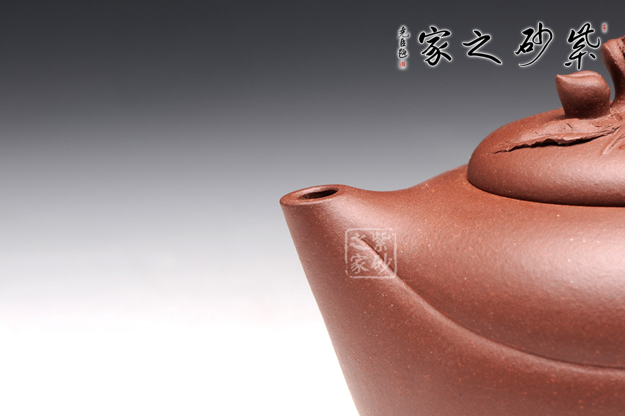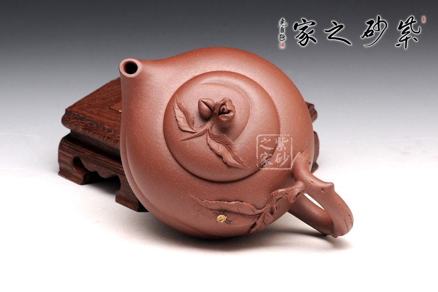 壺身是半球型,從肩部到底逐漸收斂,外觀的細(xì)膩和圓潤(rùn)讓人愛不釋手。壓蓋設(shè)計(jì),平整的壺蓋上一顆小壽桃作壺鈕,圓潤(rùn)的形態(tài)讓人喜歡。彎流壺嘴短小可愛,一條斜線縱貫壺身,延伸到壺把的底部,正是桃子上的線條。壺把做成枝節(jié)形狀,桃樹的紋理的褶皺栩栩如生。