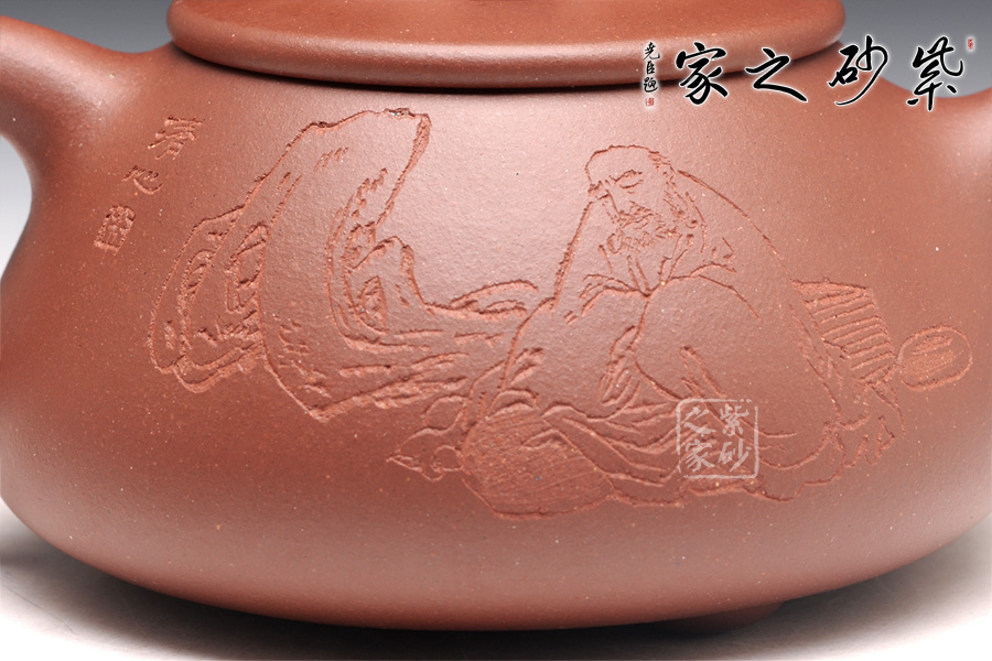 壺正面刻繪詩詞“妙參造化,心隨天籟”楷書刻繪,字跡工整俊秀,背面刻繪老僧悟禪,對應意味。
