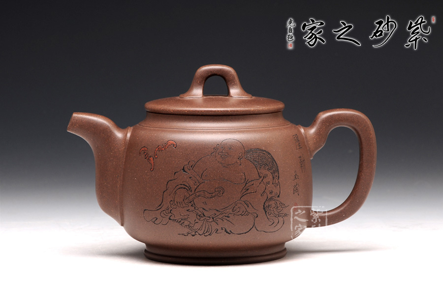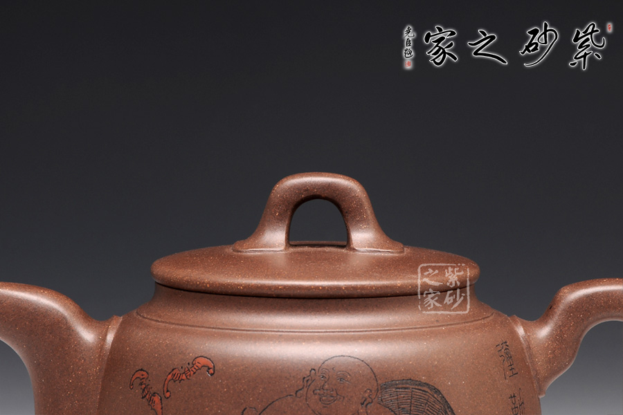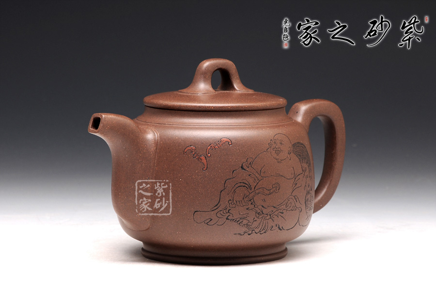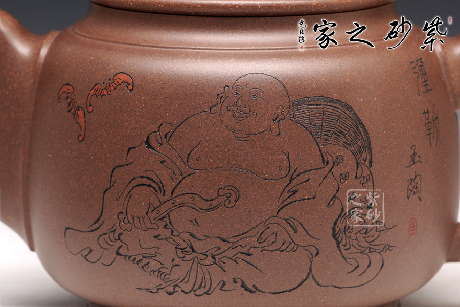 刻繪的彌勒大肚渾圓,蝙蝠飛舞正應(yīng)了壺的寓意“福到眼前”。