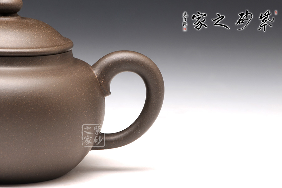此壺采用青灰泥制成,質(zhì)感細(xì)膩柔嫩,色澤清麗淡雅,予人沉靜之感;此壺為宮燈式,壺身十分飽滿,與水平壺相類似,壺底收斂,平實(shí)穩(wěn)重;壓蓋式,對(duì)接嚴(yán)絲合縫,蓋面略鼓,圓潤(rùn)的壺鈕如一粒佛珠,古雅質(zhì)樸;三彎嘴暗接精湛,柔婉婉轉(zhuǎn),嘴型經(jīng)典傳統(tǒng);耳形端把,弧度流暢緩和,端握舒適。