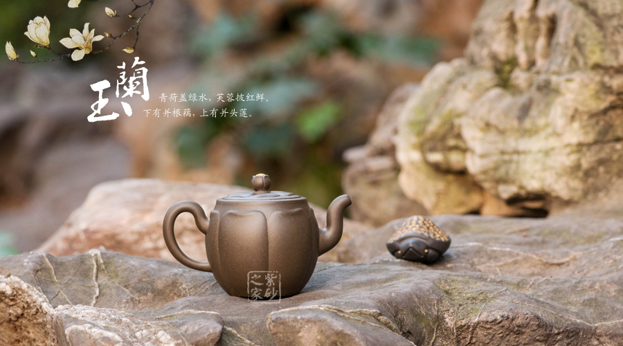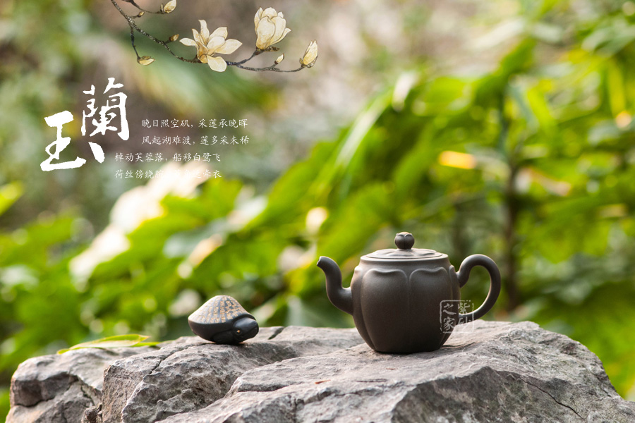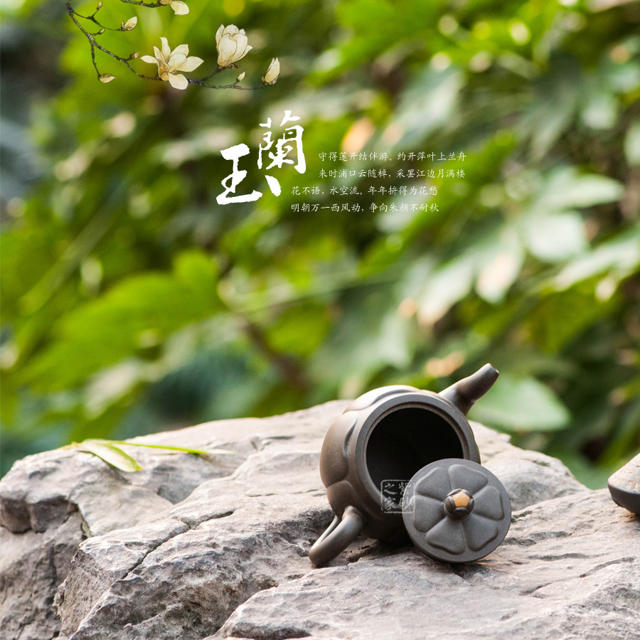 壺型整體就是一朵玉蘭花,細(xì)長優(yōu)雅的線條包裹,綠色的泥料更顯真切。嵌蓋融入壺身,上面的花紋凸起簡潔自然。壺鈕是一朵小玉蘭花,綠色的花蕾圍繞著黃色的花朵,小巧精致。壺嘴和把都是裝點(diǎn),如同花枝一般,或彎曲或爽利,不用多余修飾,反倒尤其生動。