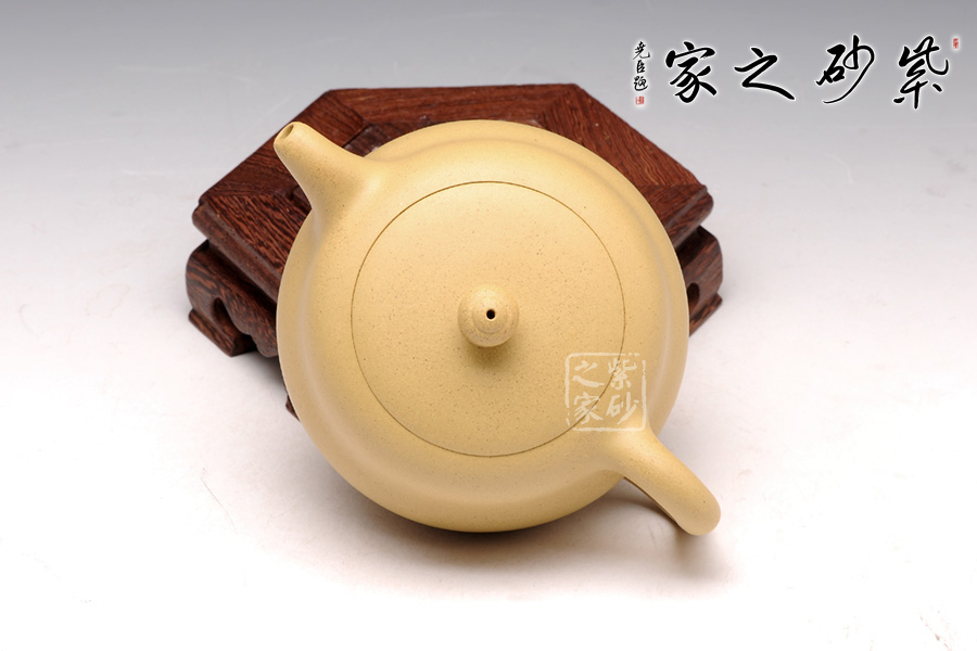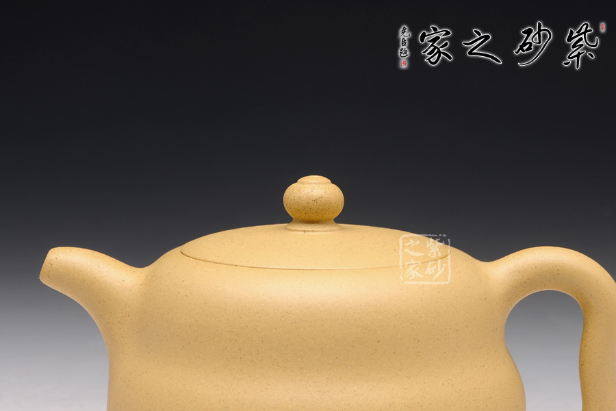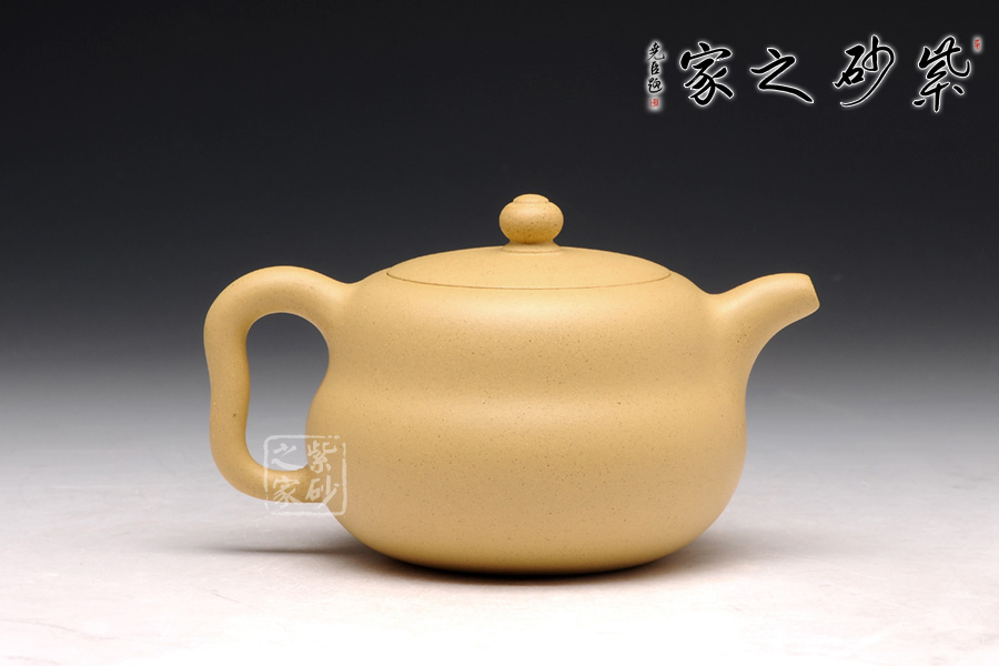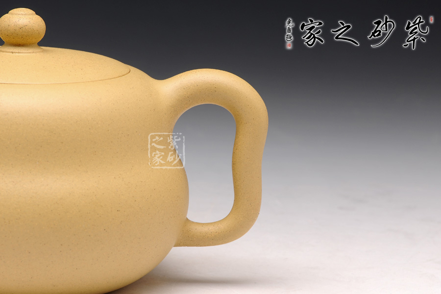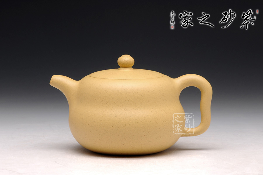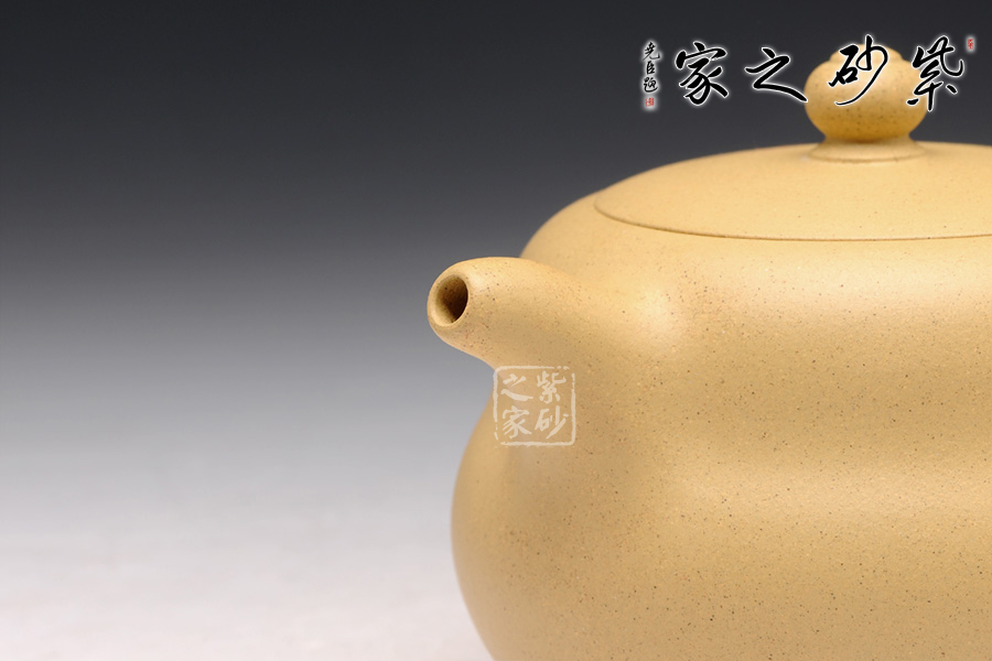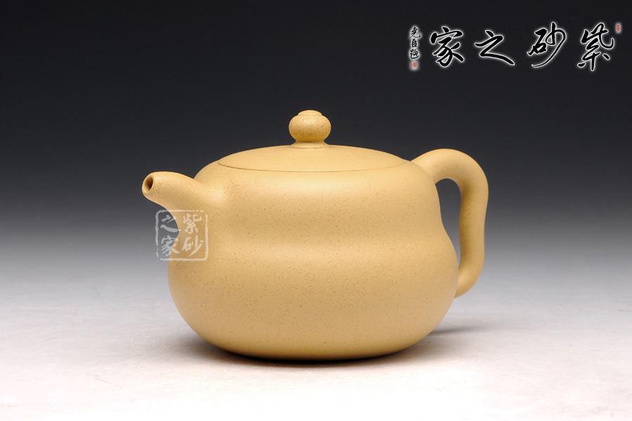原礦黃金段泥制,經(jīng)典光貨。造型呈葫蘆狀,一彎流壺嘴微微下滑,把成半環(huán)形,壺鈕如珠。壺身線條以渾圓為主,十分流暢,耳朵形狀的壺把尤其美觀。 此壺雖為光貨,但韻味獨具。在壺體線條處理上,作者較多采用輕靈之風,使得此壺少了一份渾厚,多了幾分雅致。