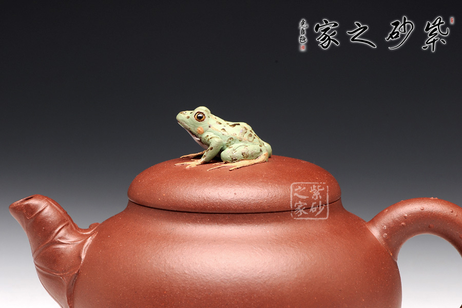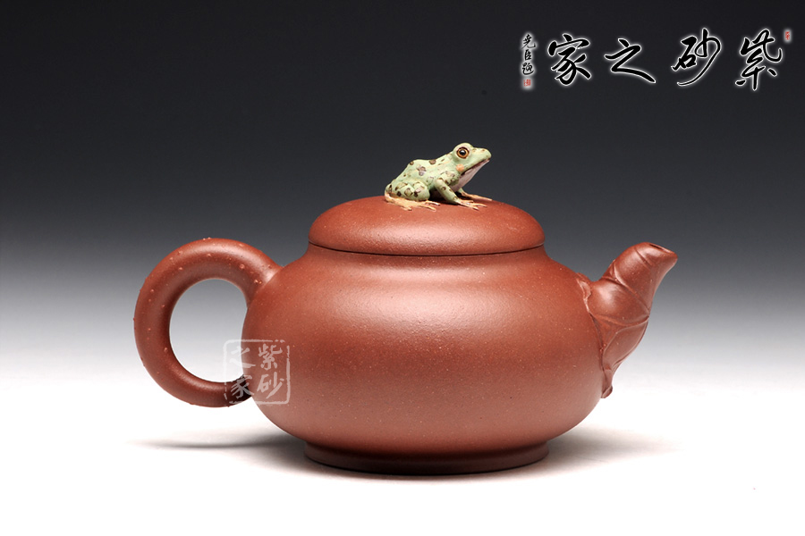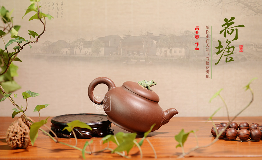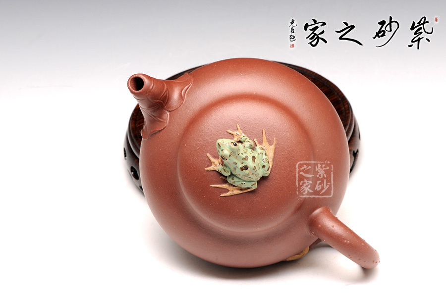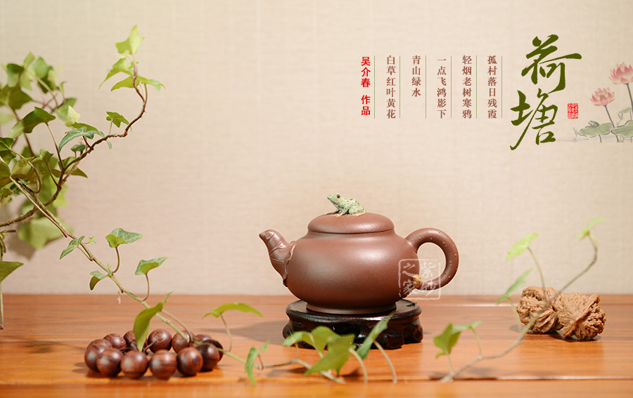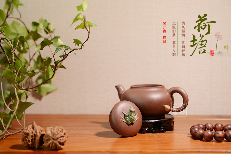 出自吳介春之手的的此壺,名為荷塘,造型簡潔,創(chuàng)意新穎出奇。縱觀此壺,仿若一荷塘清新映入眼簾,清風(fēng)徐徐,荷香陣陣,蛙鳴聲聲,好一番熱鬧非凡的景致。壺鈕新穎別致,一青蛙圓瞪雙眼,眉眼傳神,栩栩如生。壺嘴處仿若荷葉鋪就,形象自然。端把更是出奇制勝,仿若一根中通外直、不蔓不枝的荷花莖彎曲而成,于把底之處一朵睡蓮含苞待放,逼真生動(dòng)。該壺,極具實(shí)用和欣賞價(jià)值,不可錯(cuò)過。