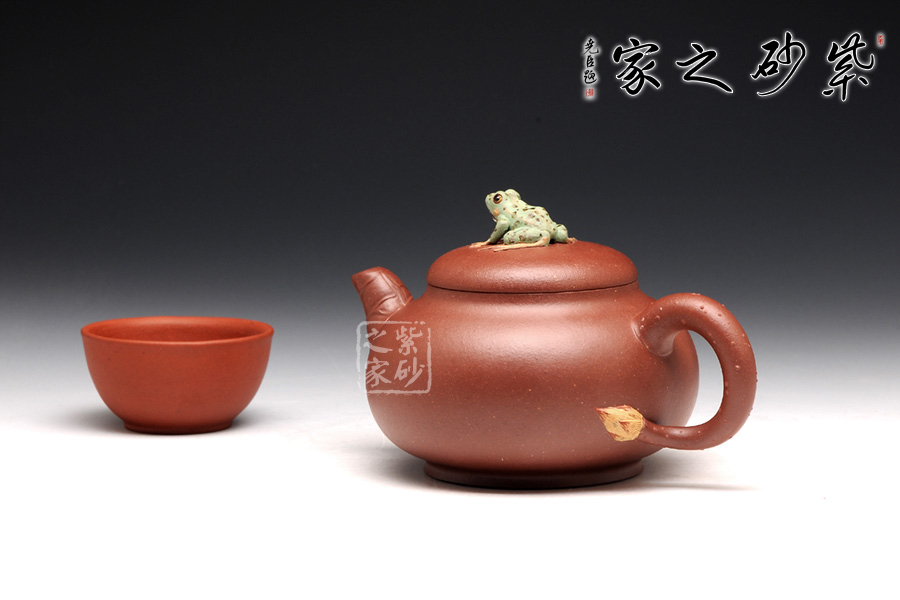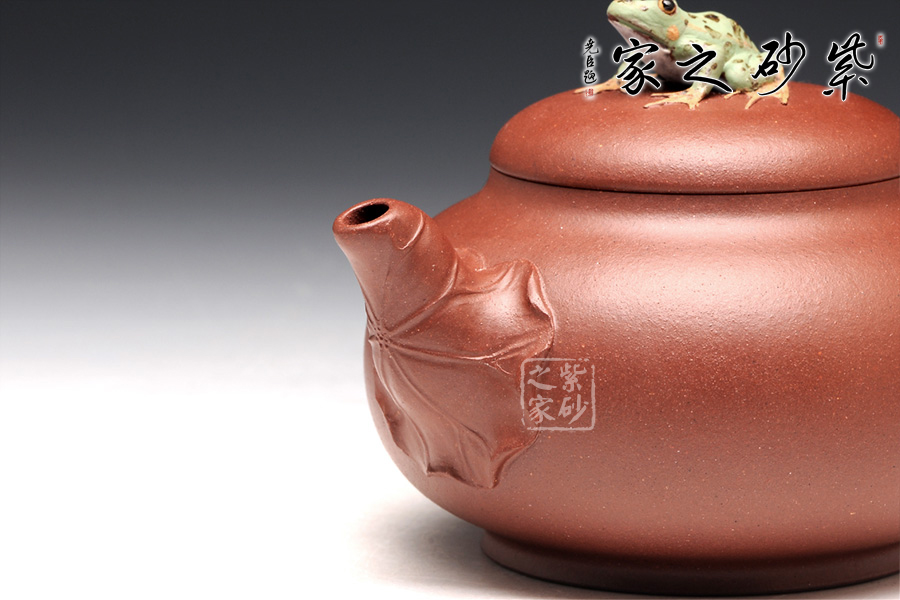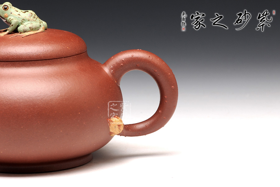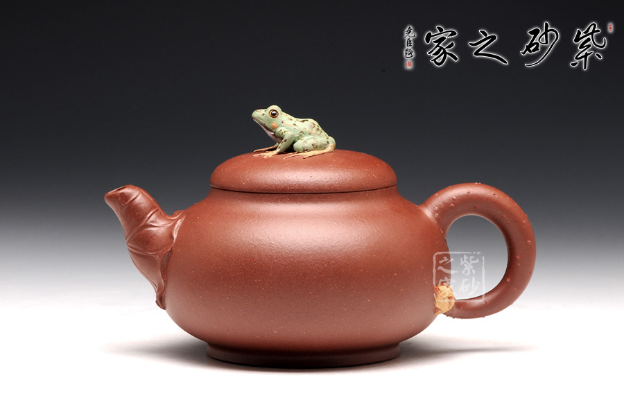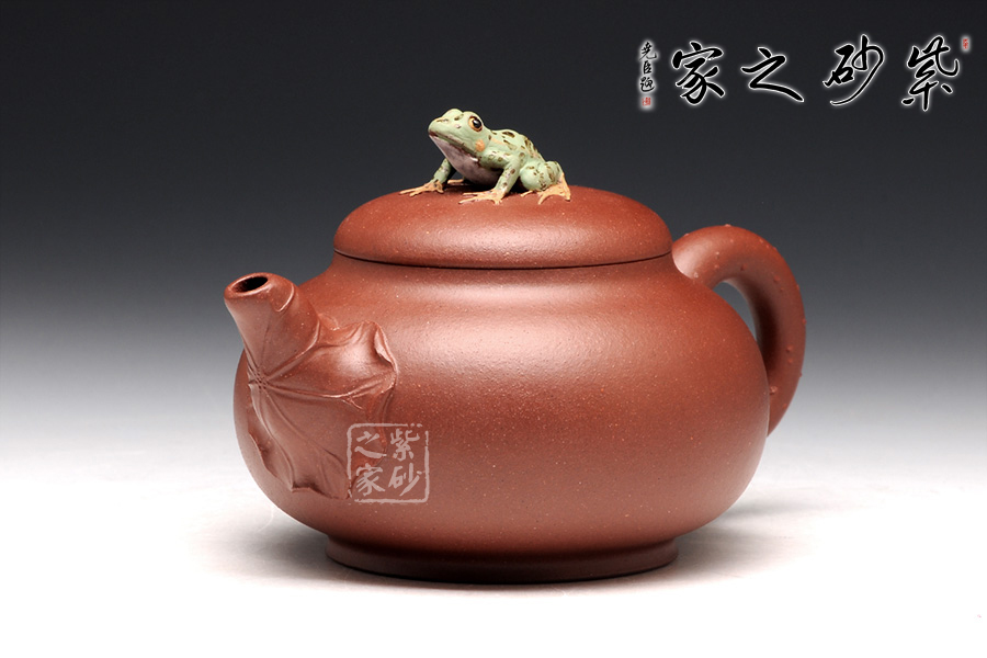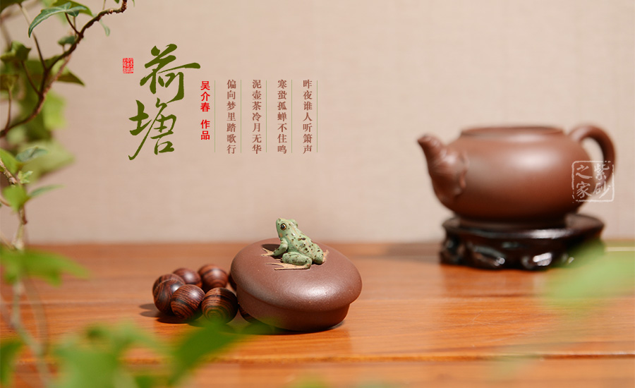 出自吳介春之手的的此壺,名為荷塘,造型簡潔,創(chuàng)意新穎出奇。縱觀此壺,仿若一荷塘清新映入眼簾,清風(fēng)徐徐,荷香陣陣,蛙鳴聲聲,好一番熱鬧非凡的景致。壺鈕新穎別致,一青蛙圓瞪雙眼,眉眼傳神,栩栩如生。壺嘴處仿若荷葉鋪就,形象自然。端把更是出奇制勝,仿若一根中通外直、不蔓不枝的荷花莖彎曲而成,于把底之處一朵睡蓮含苞待放,逼真生動(dòng)。該壺,極具實(shí)用和欣賞價(jià)值,不可錯(cuò)過。
