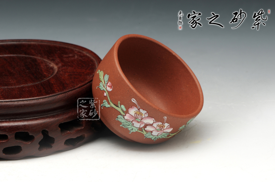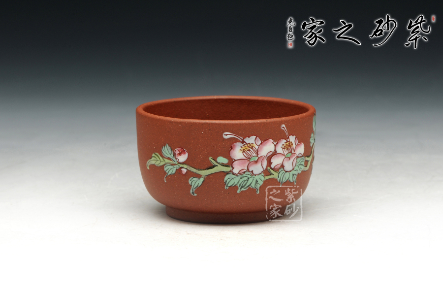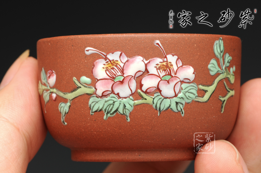 此杯精致美觀,是品茗的佳作。杯子小巧可愛,寓方于圓。口大而足略窄,上下圓筒型線條變化均勻和緩,至底部收尾利落自然。以紫砂泥精制,加之釉水點(diǎn)彩桃花,顯得古樸典雅,值得玩味。