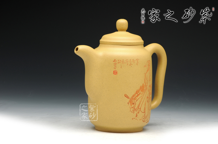 此壺古樸端莊,韻味清明洗練。壺身呈圓筒狀,表面光滑精致,端正秀麗 。圈足裝飾,平穩(wěn)內(nèi)斂。壺肩上過渡平緩,壓蓋簡練工整,圓壺鈕自然生動,精巧可愛。壺嘴和壺把相互支撐,與壺身接連一體,線條變化均勻有致,足見工藝非凡。